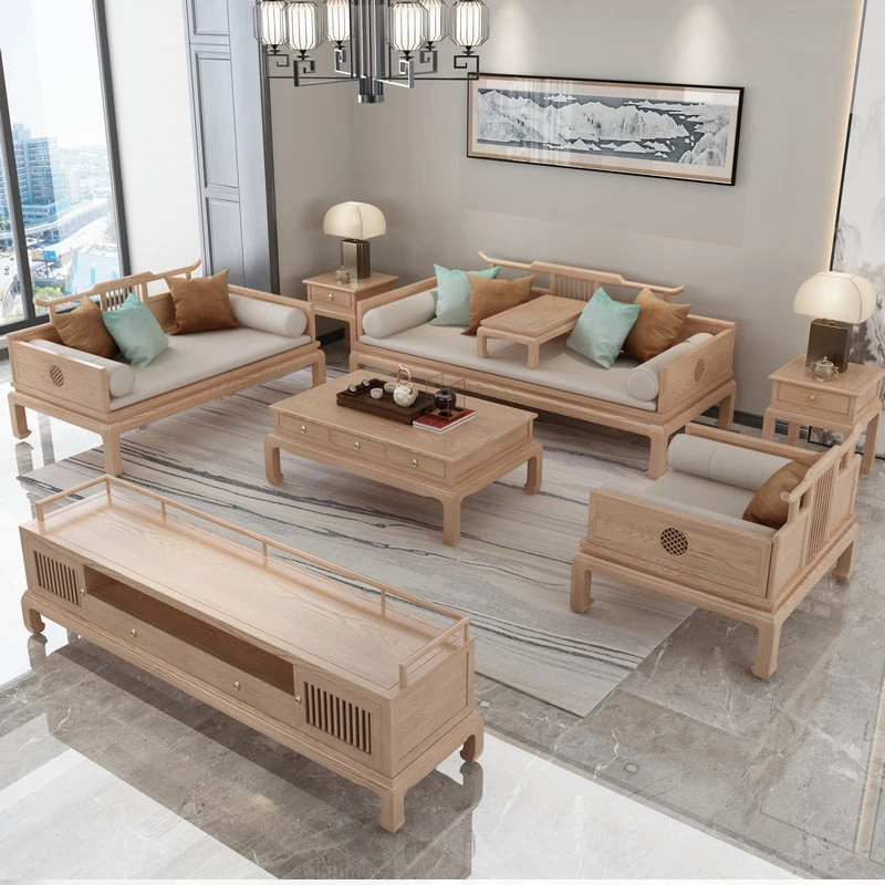 新中式全実木ソファセット - シンプルでモダンなリビングに最適な原木色、大小さまざまな住宅や別荘にぴったりの羅漢床付き家具!心地よい空間を演出します。