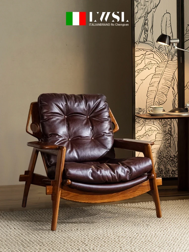 Vintage Benjamin Sofa Chair - Crafted from Oil Wax Top Grain Cowhide and North American Ash Wood, This Retro American Style Solid Wood Lounge Chair Combines Comfort and Elegance for Your Living Space.