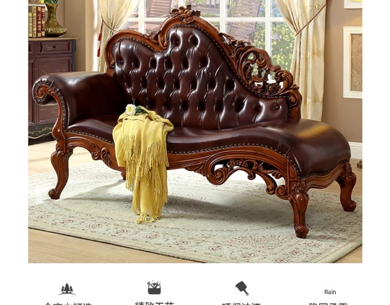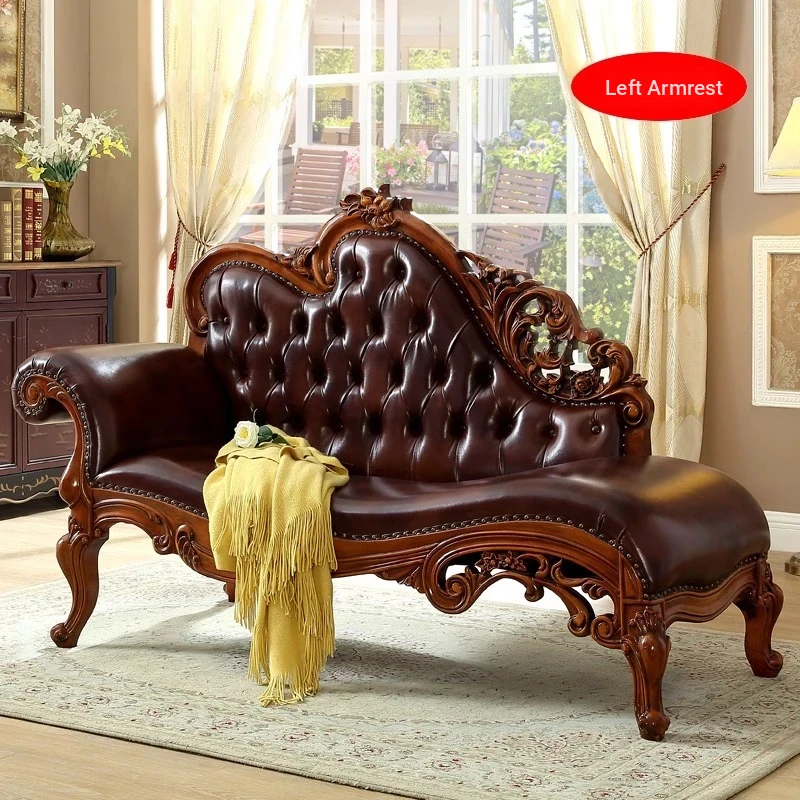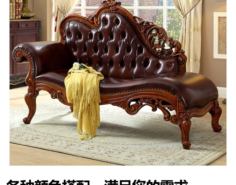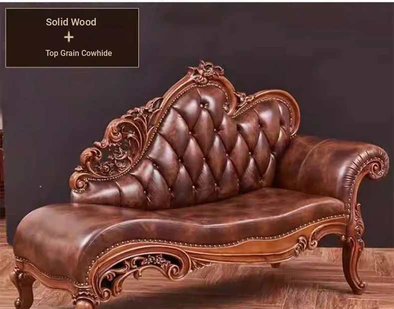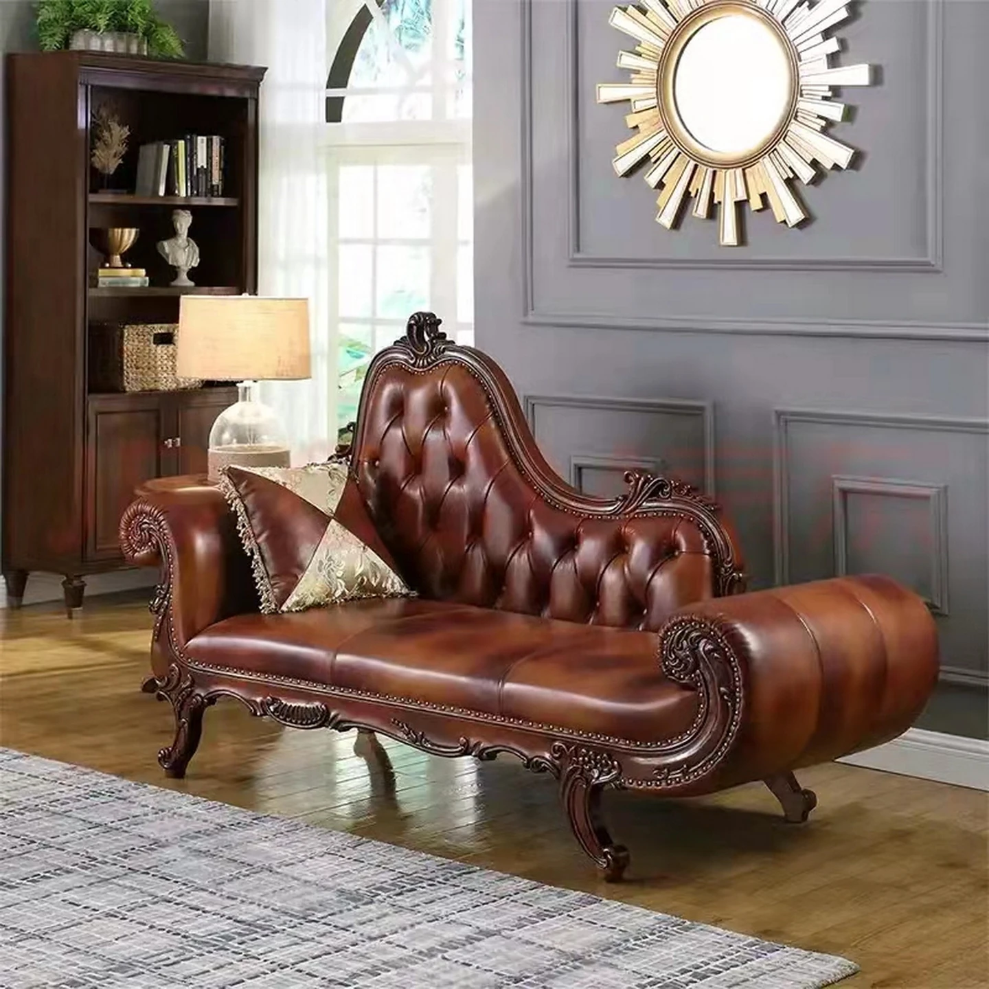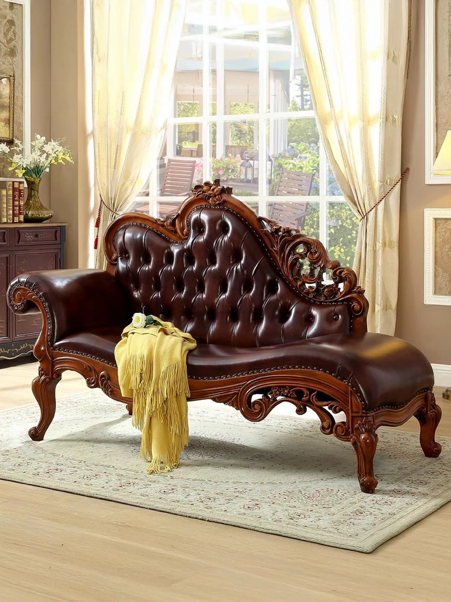 American Style Solid Wood Carved Genuine Leather Chaise Lounge - Elegant European Design for Home and Hotel, Perfect for Living Room Relaxation and Comfort