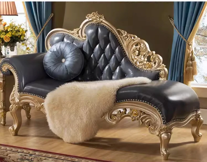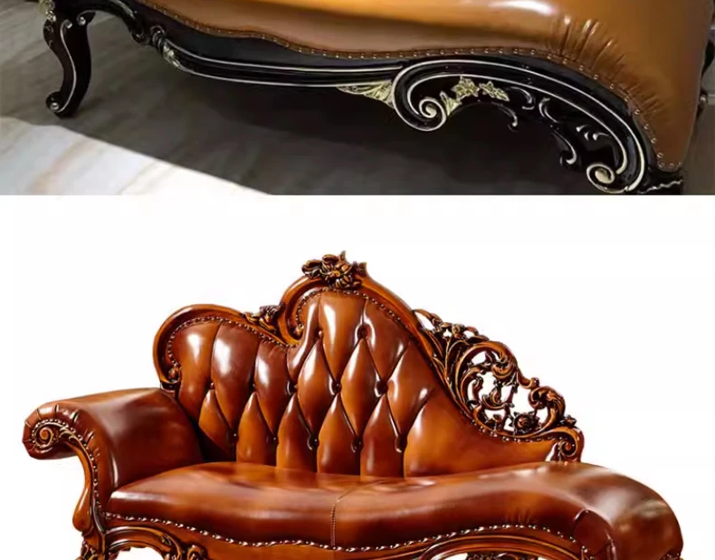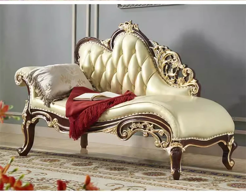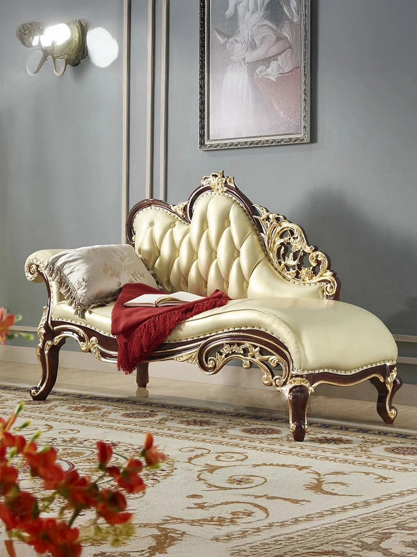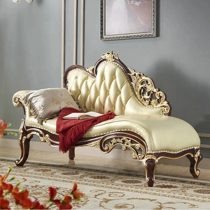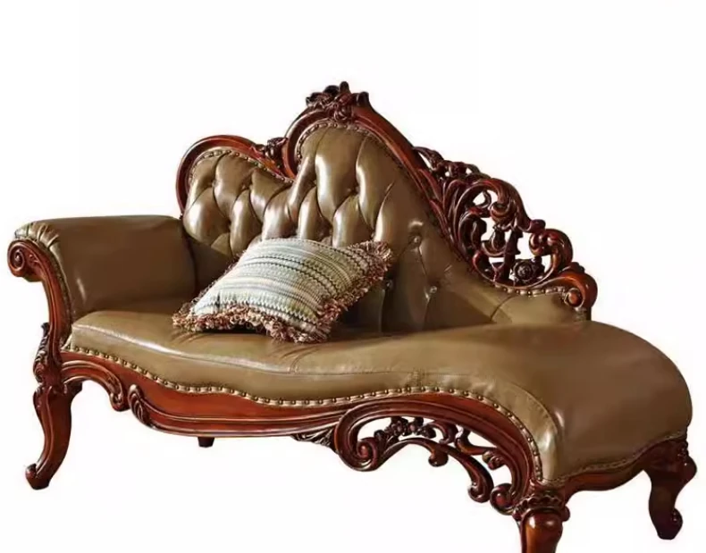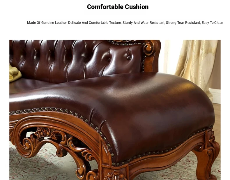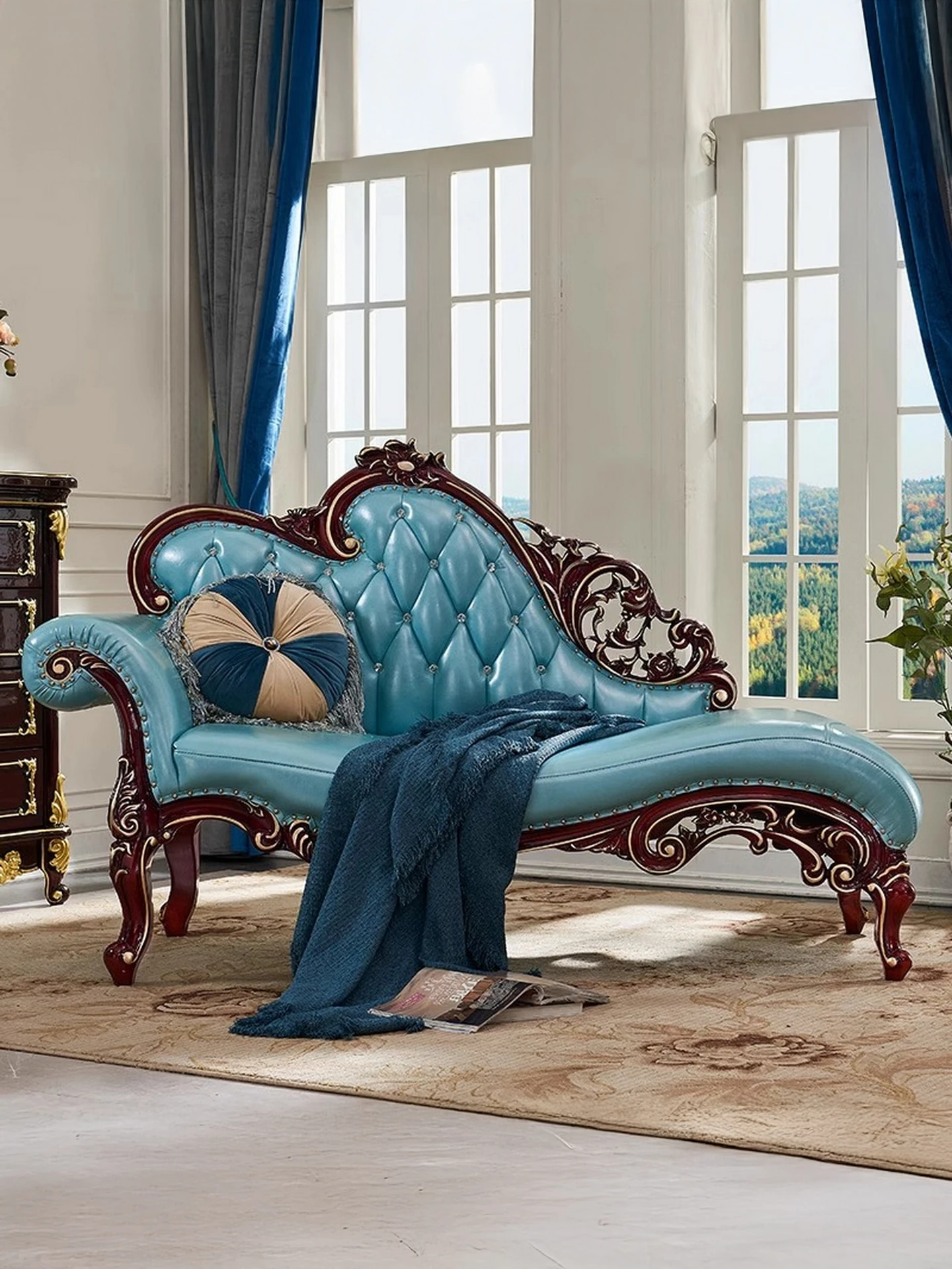 American Style Solid Wood Carved Genuine Leather Chaise Lounge - Elegant European Design for Home and Hotel, Perfect for Living Room Relaxation and Comfort