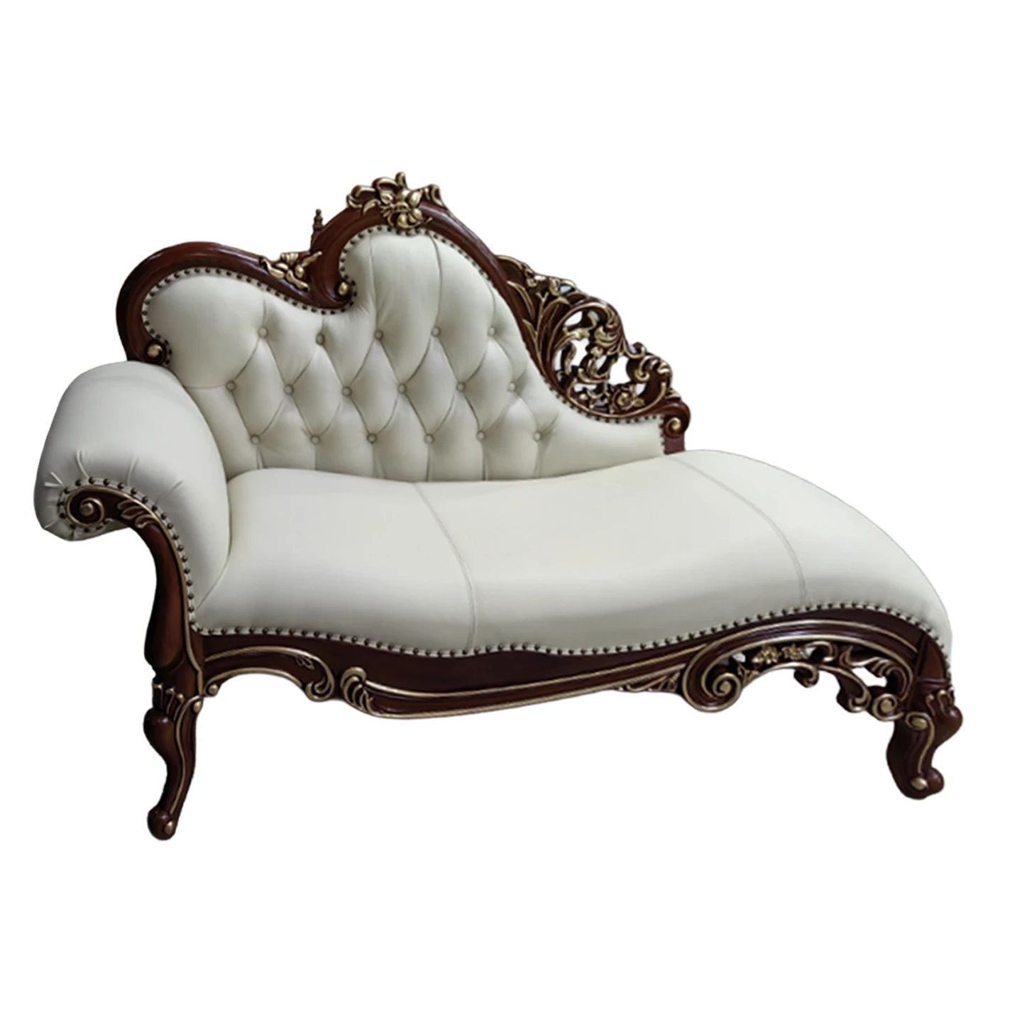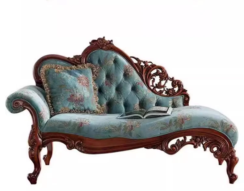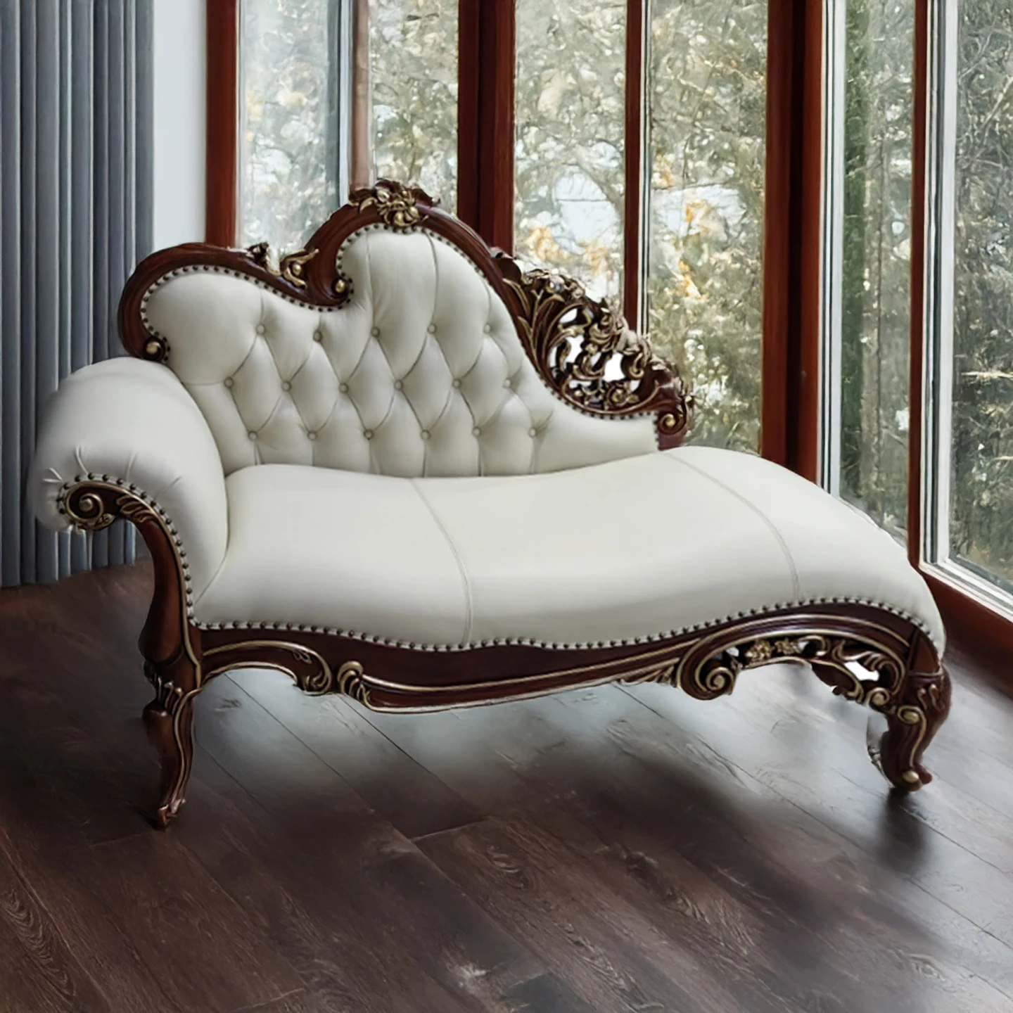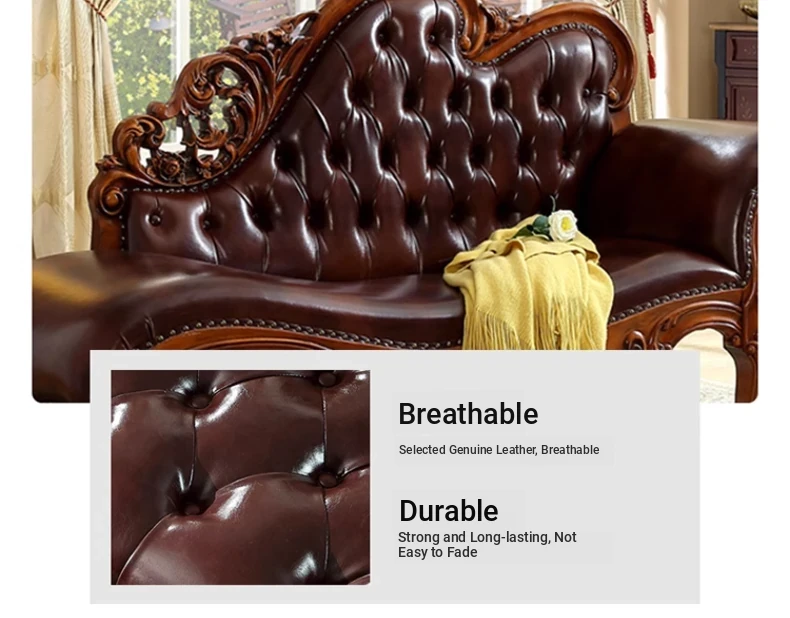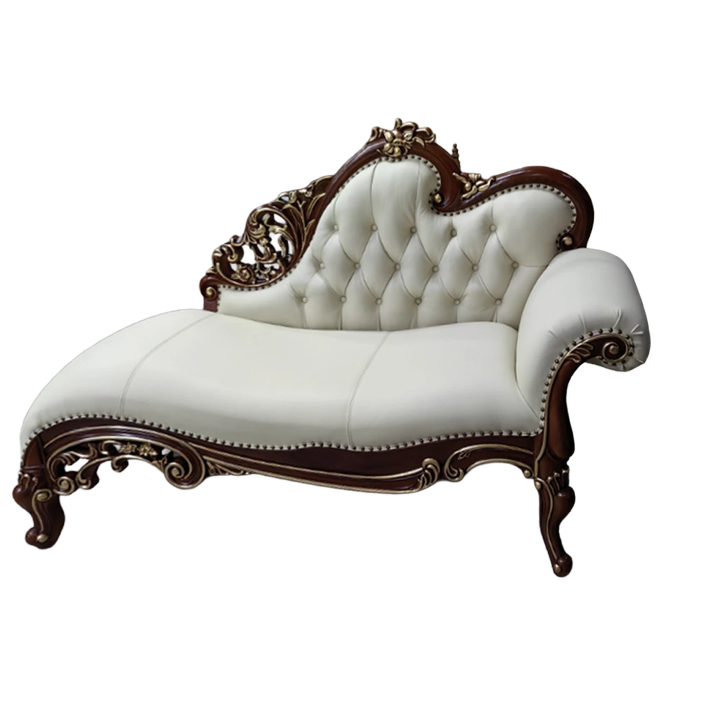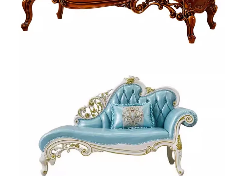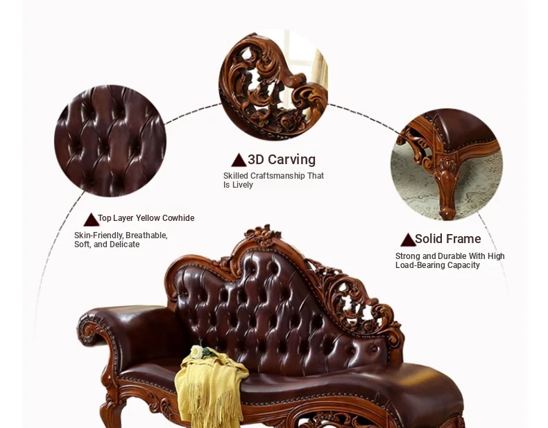 American Style Solid Wood Carved Genuine Leather Chaise Lounge - Elegant European Design for Home and Hotel, Perfect for Living Room Relaxation and Comfort