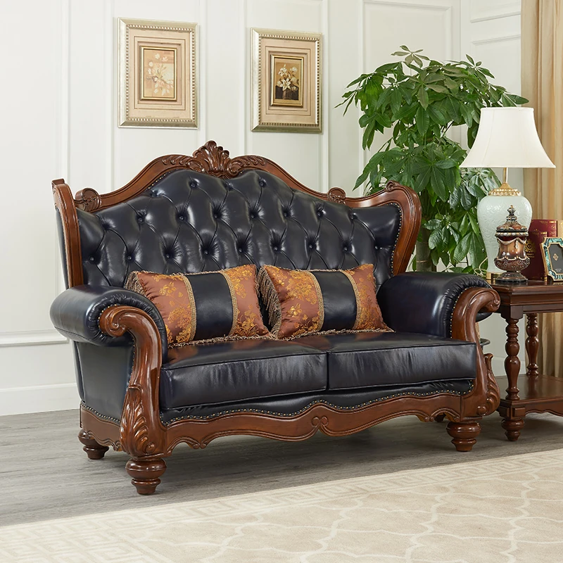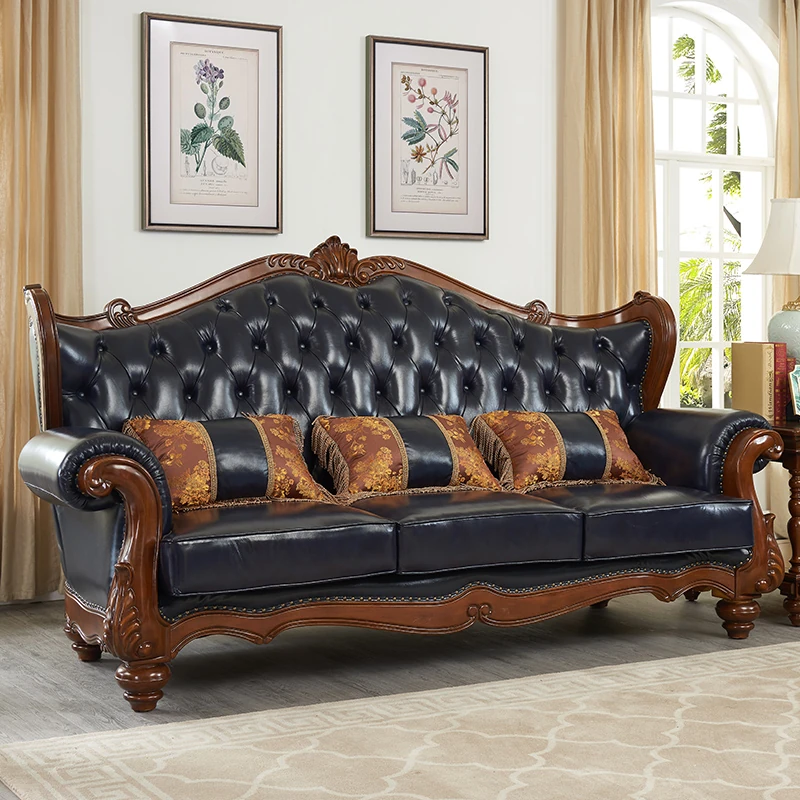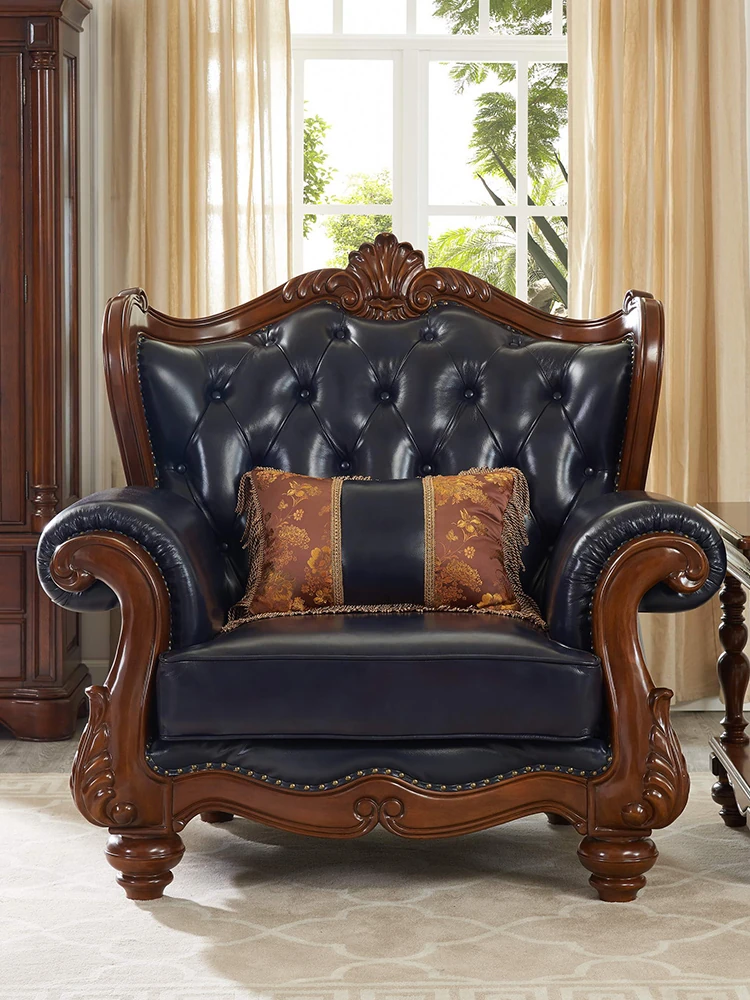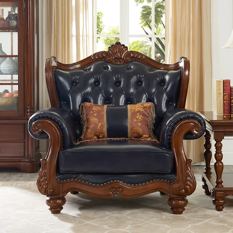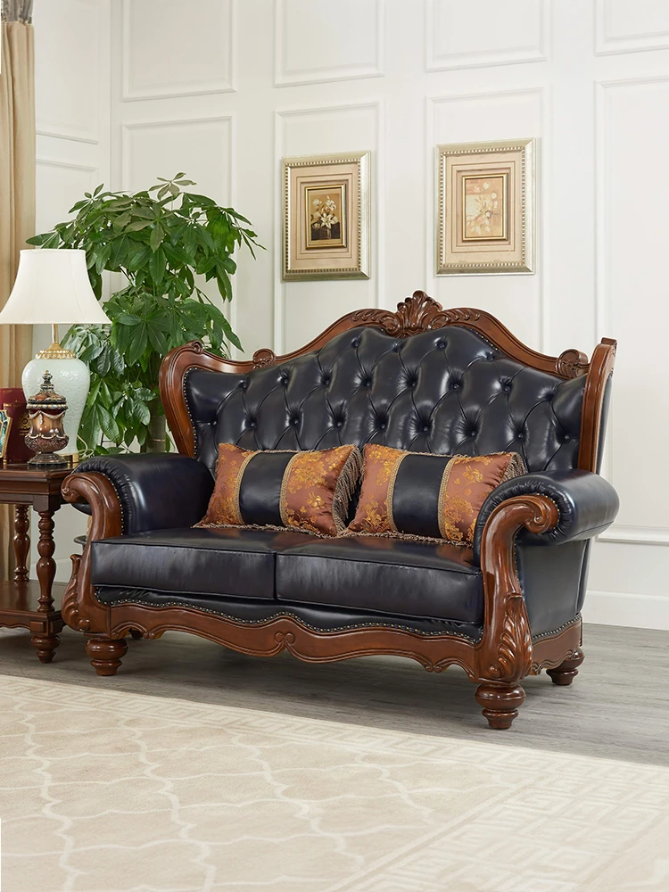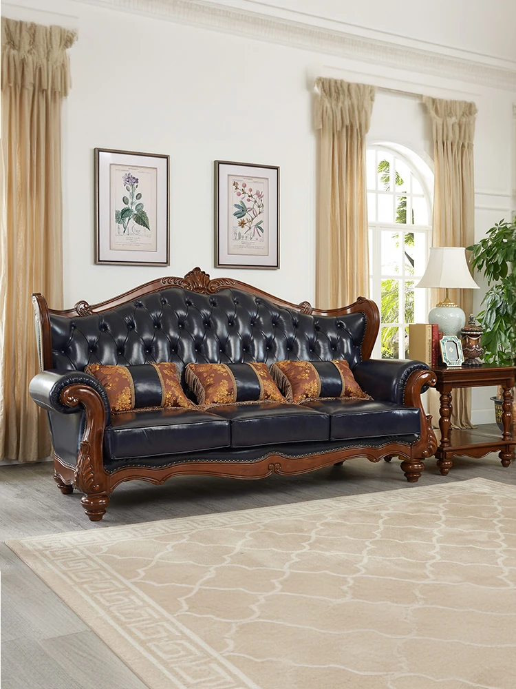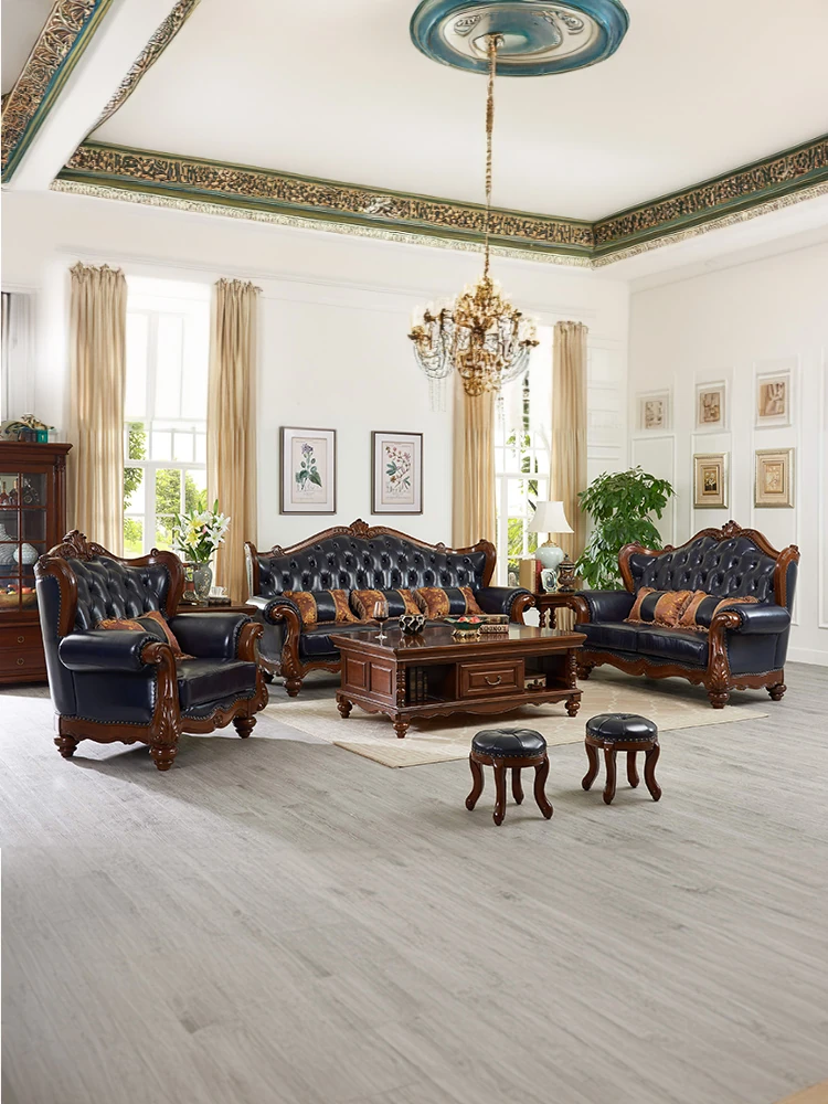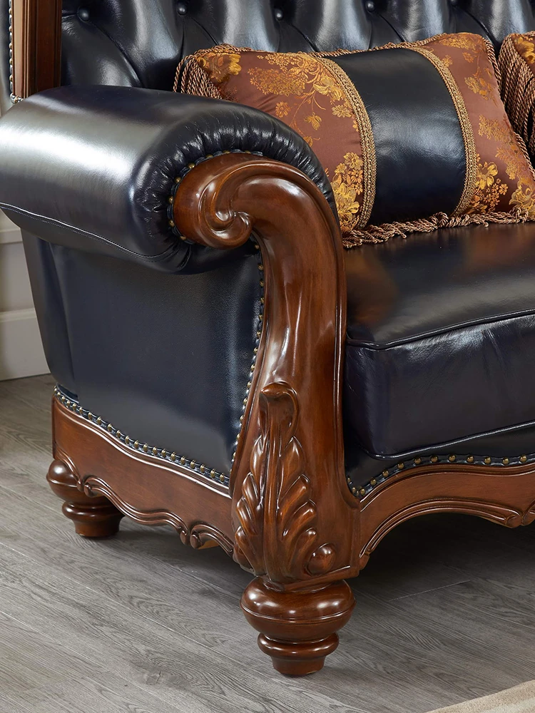 European Style Solid Wood Genuine Leather Sofa Set - Top Grain Cowhide for Spacious Living Rooms and Villas, Exquisite Carved Design - Model 016