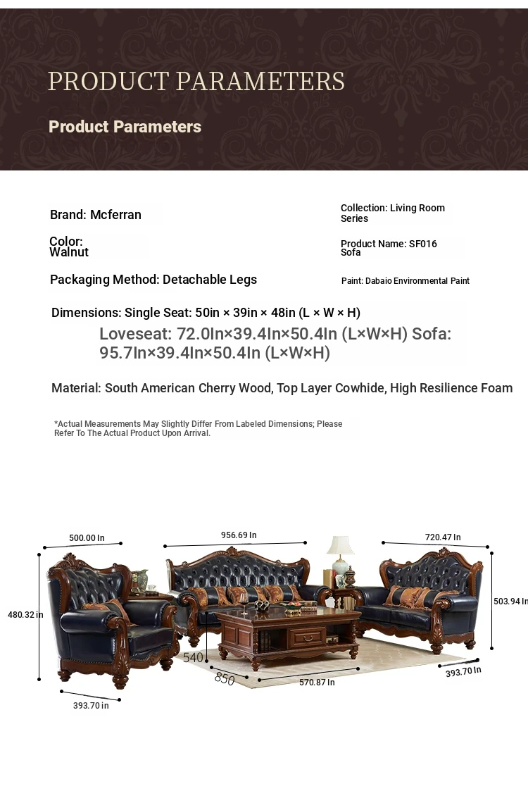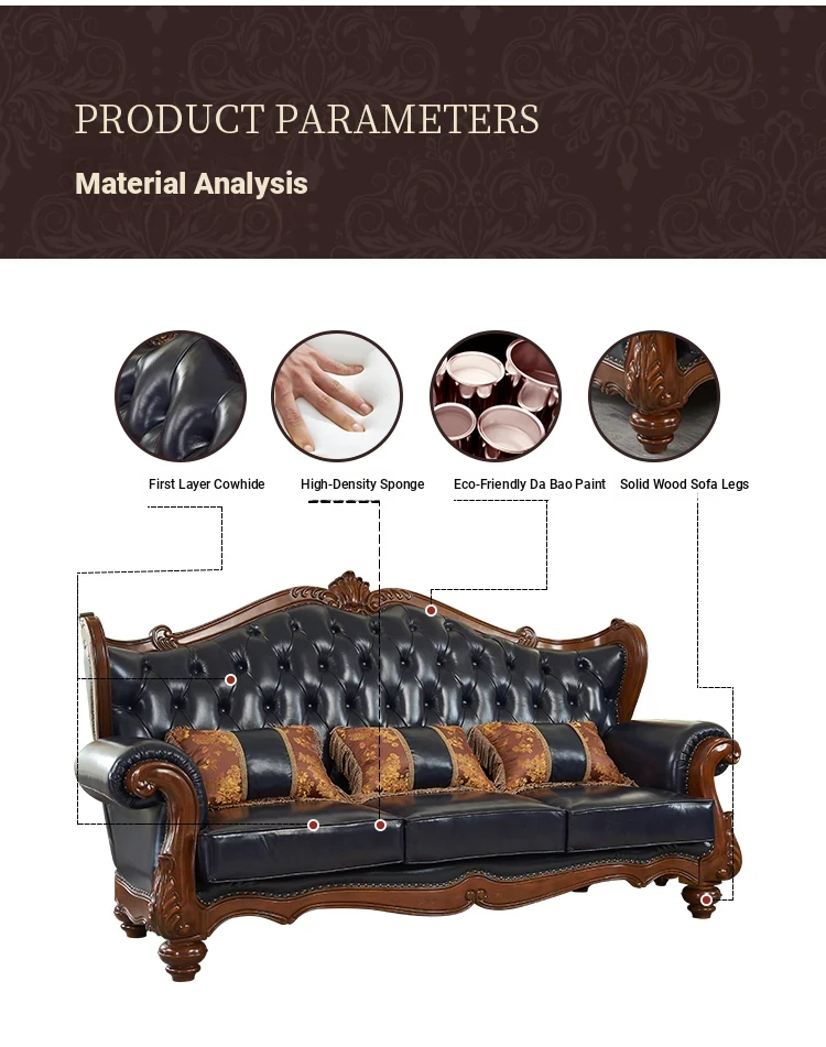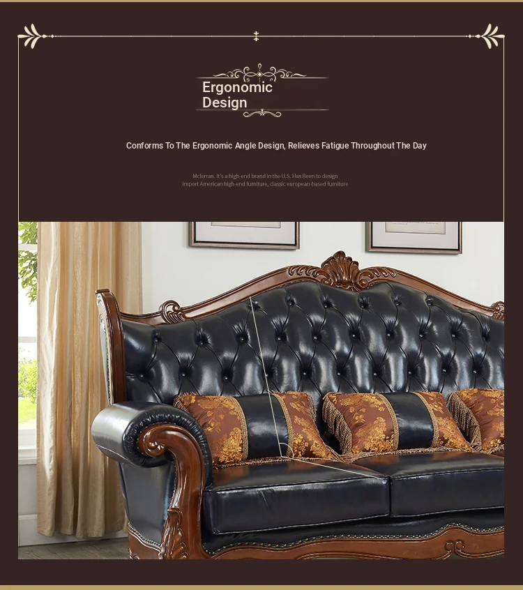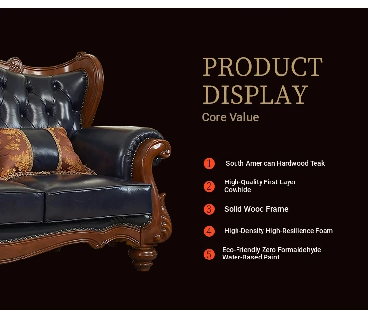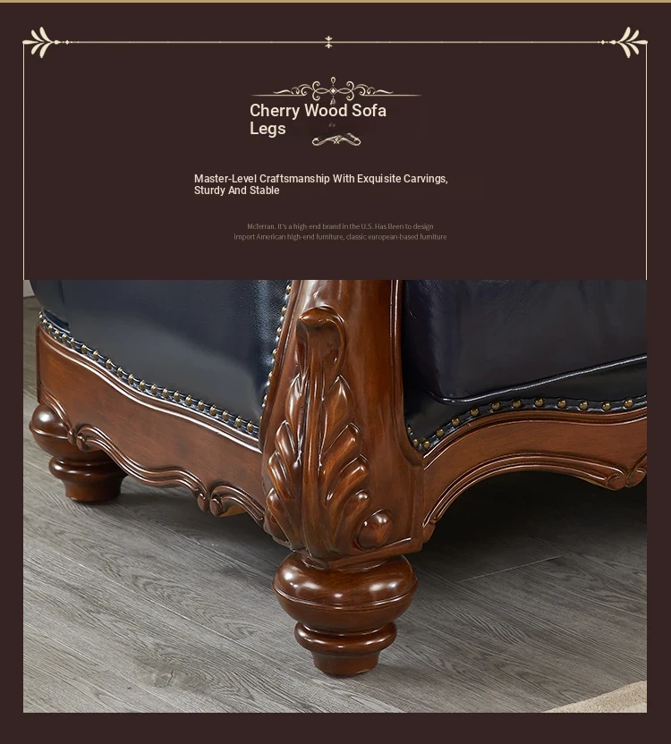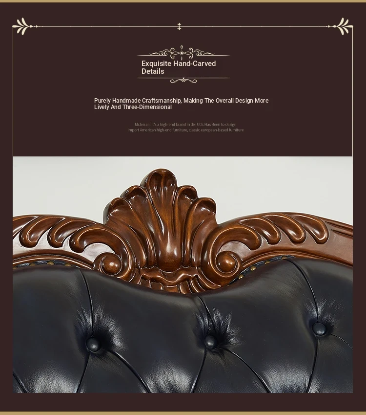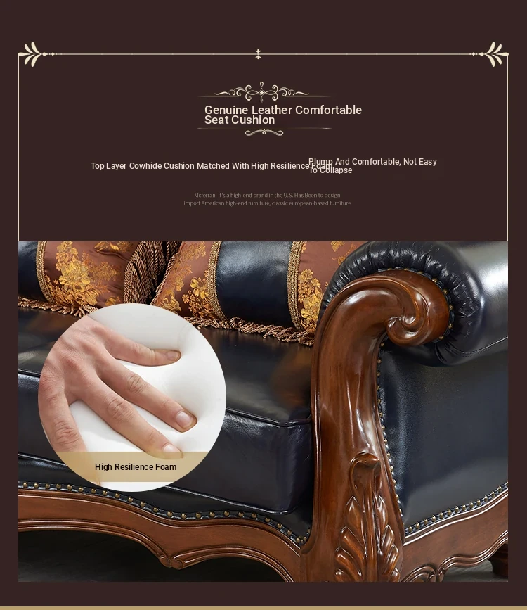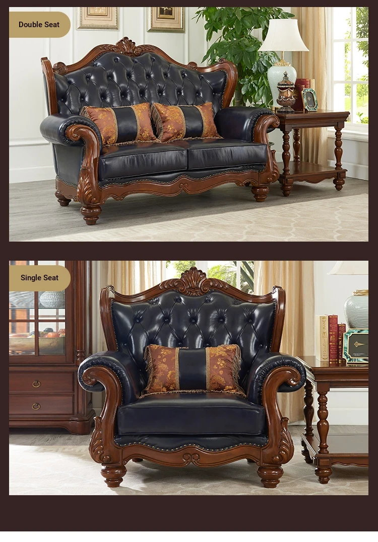 European Style Solid Wood Genuine Leather Sofa Set - Top Grain Cowhide for Spacious Living Rooms and Villas, Exquisite Carved Design - Model 016