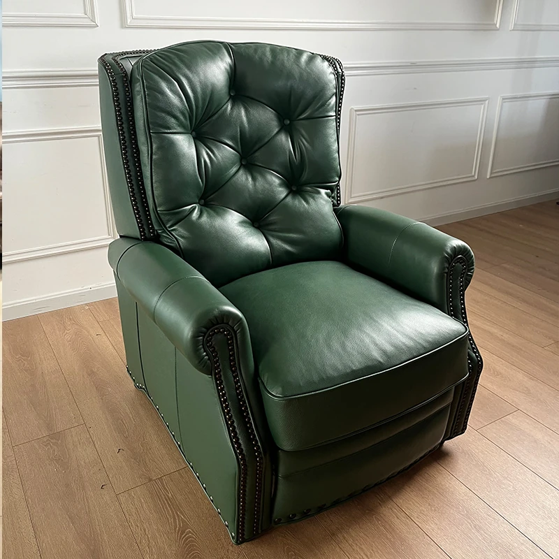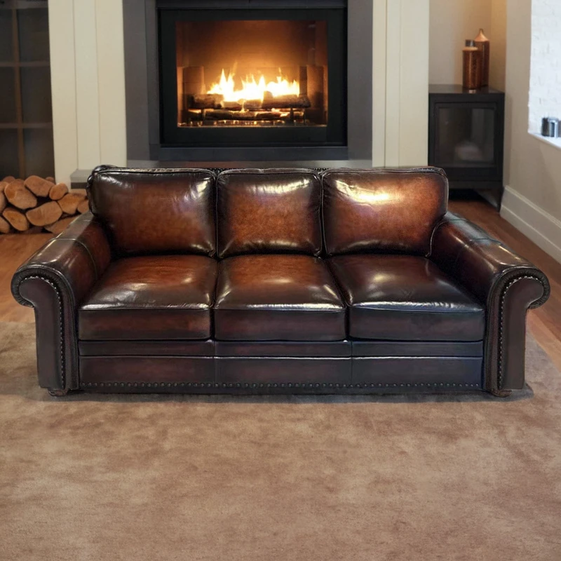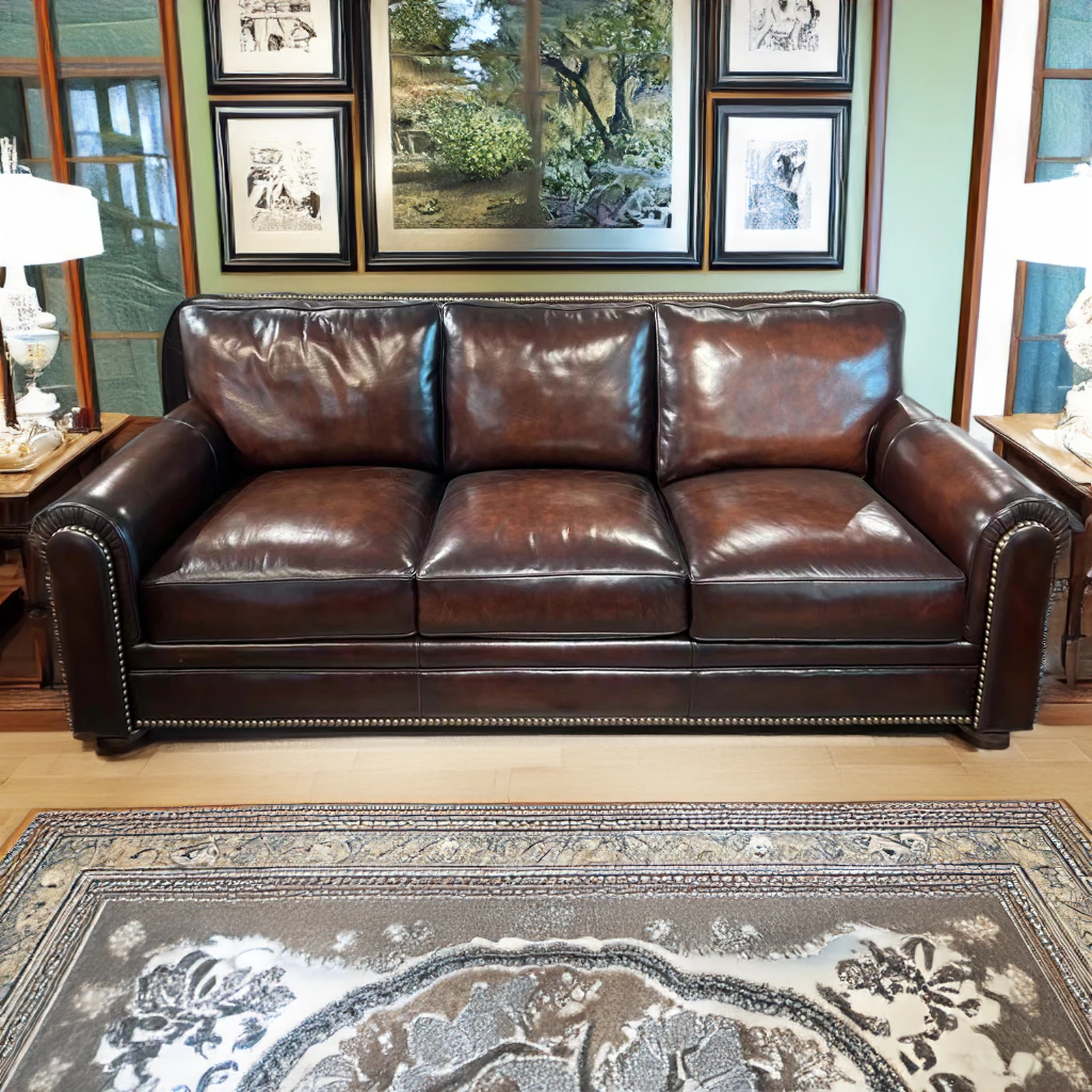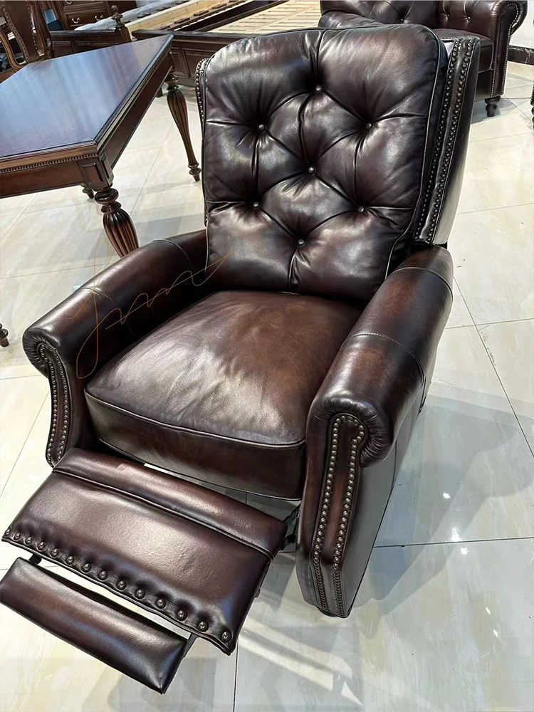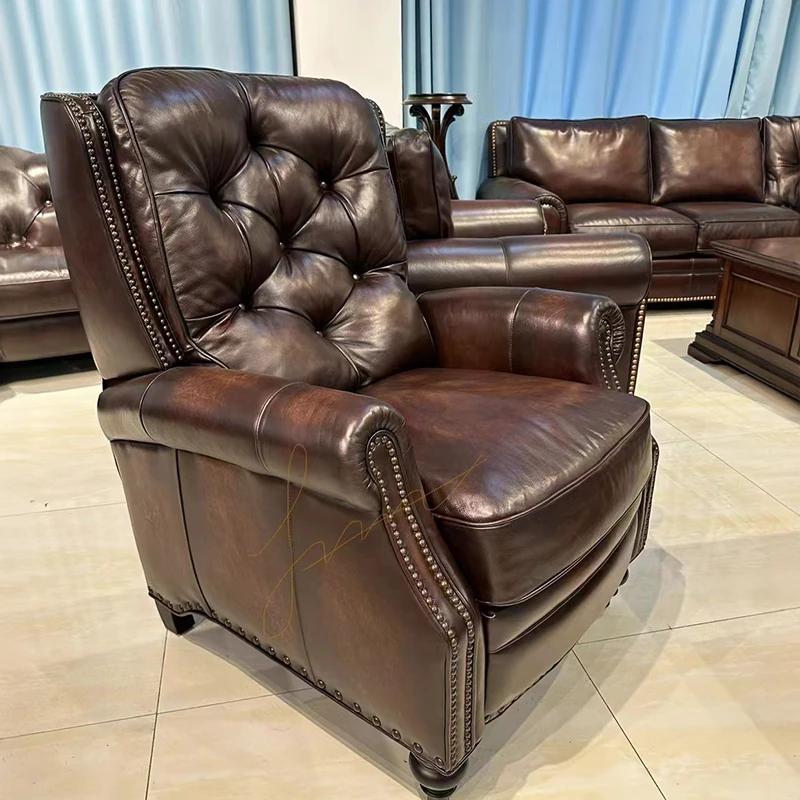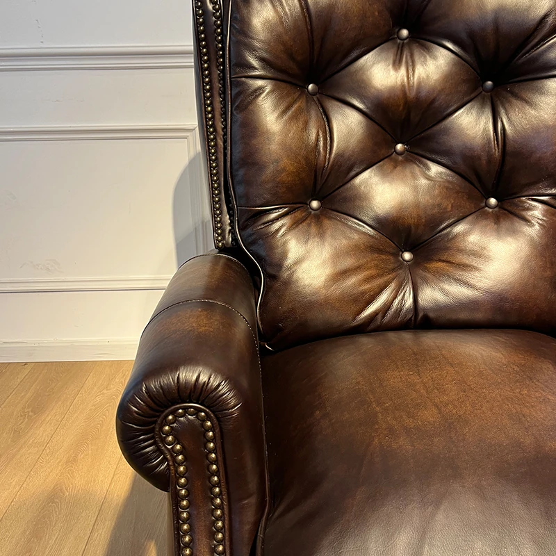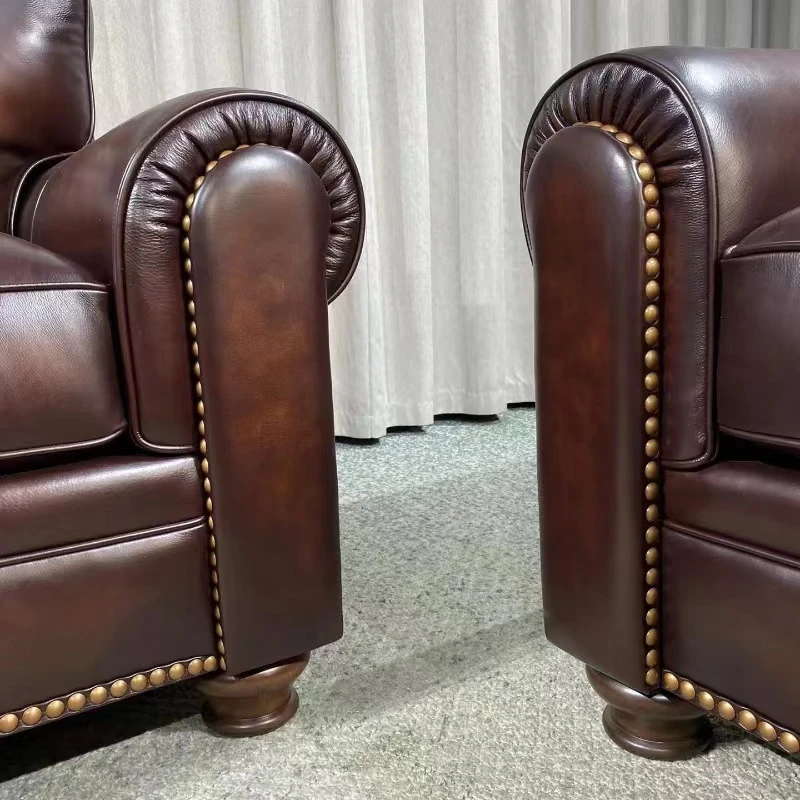 Genuine Leather Recliner Sofa - Handcrafted Top Grain Cowhide with Elegant Patina, Premium Feather Filling, Vintage Style for Cigar Rooms and Luxurious Living Spaces