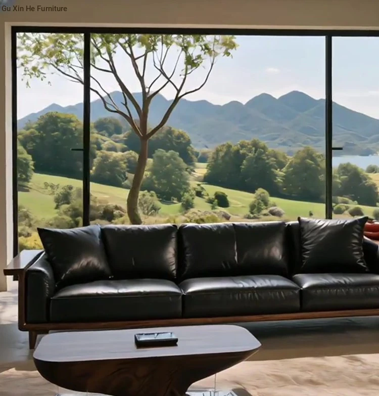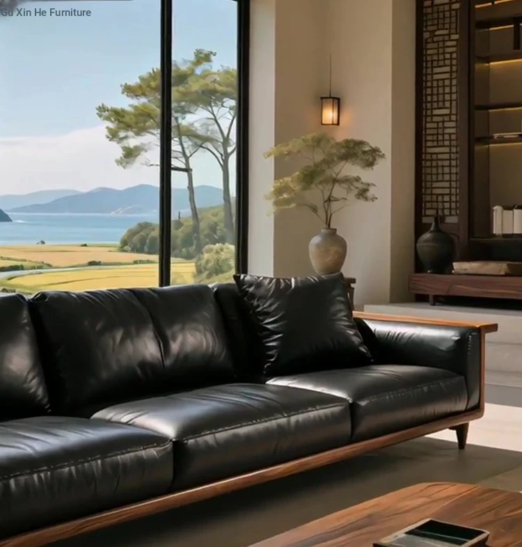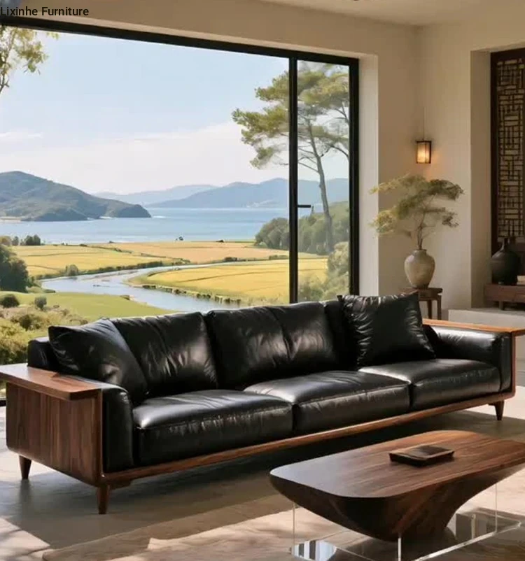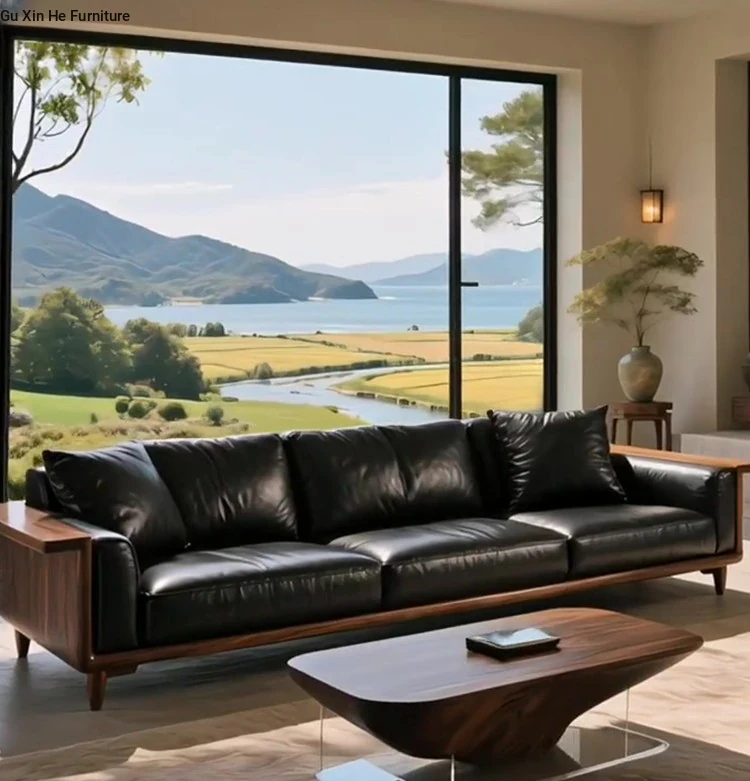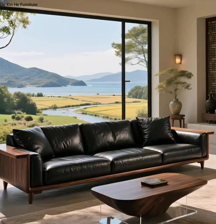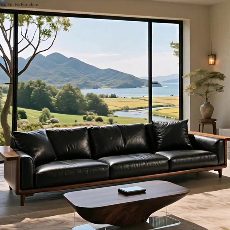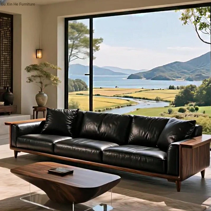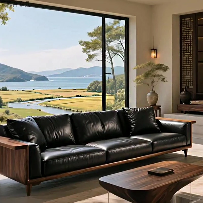 Italian Minimalist Luxury Genuine Leather Sofa - Retro Solid Wood Living Room Piece, 2025 New Arrival in North American Black Walnut - Elevate Your Space with Timeless Elegance!