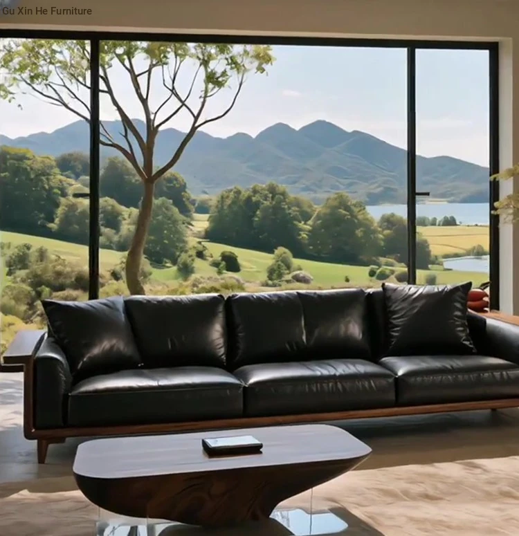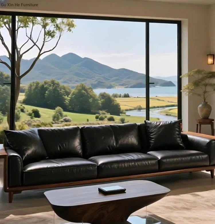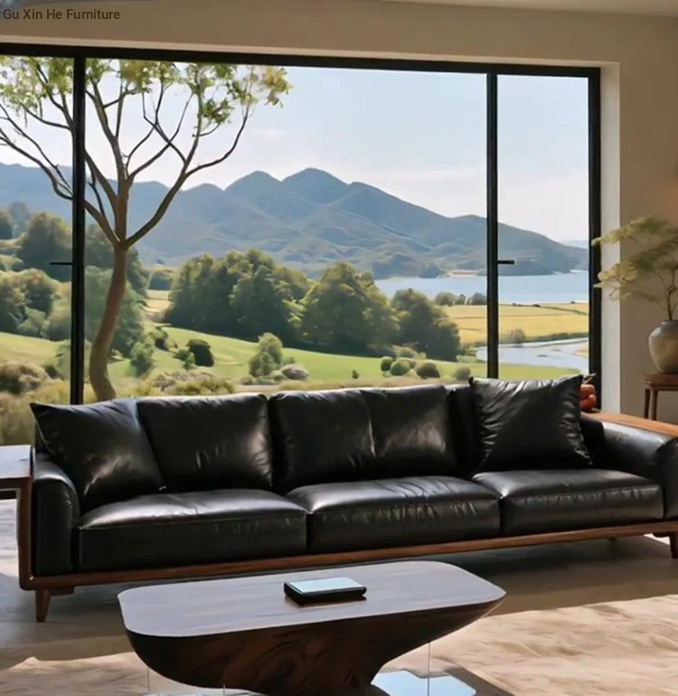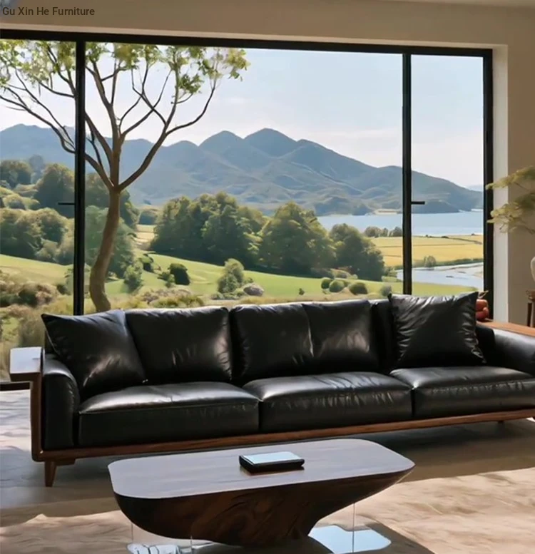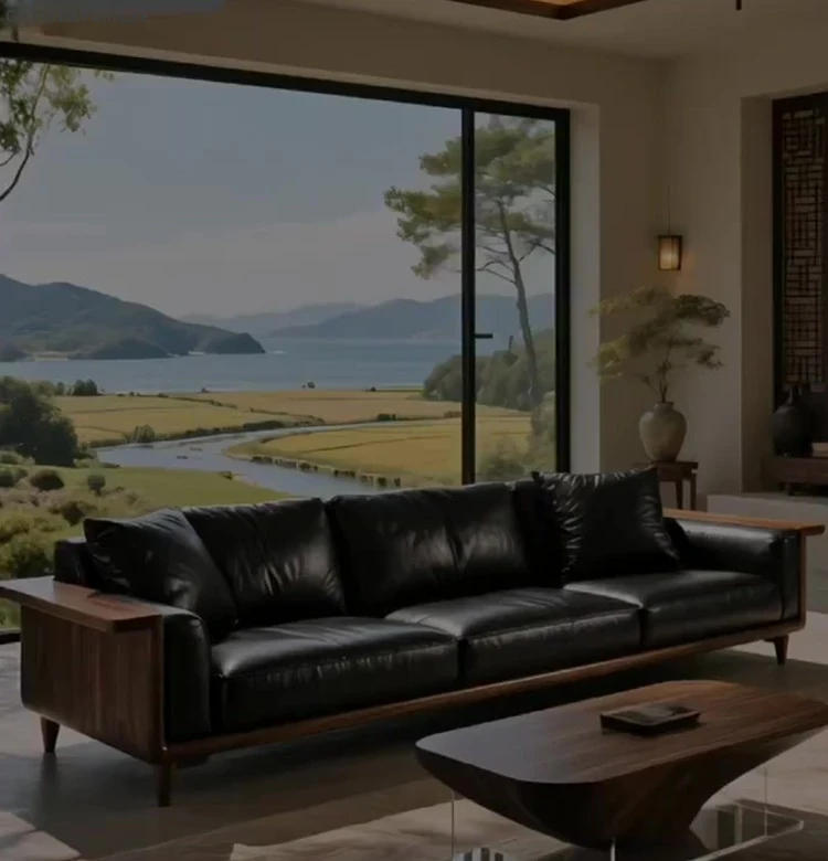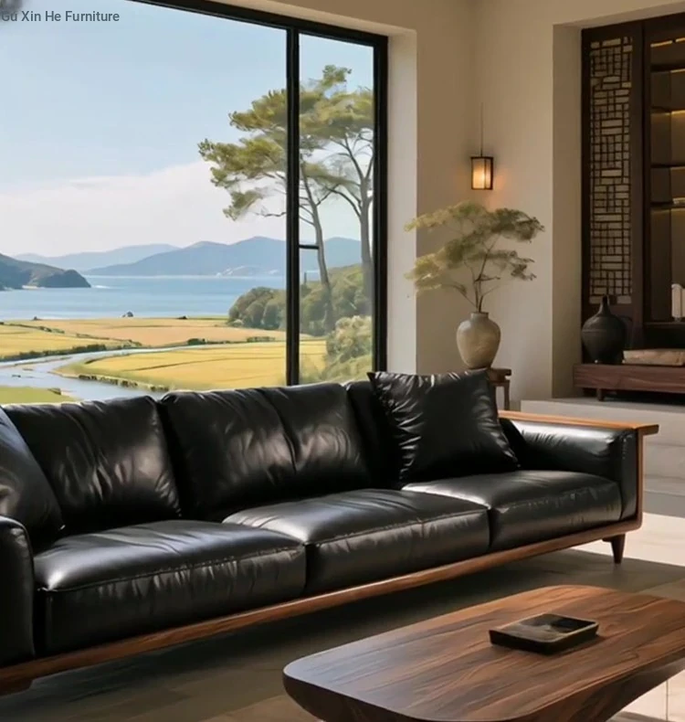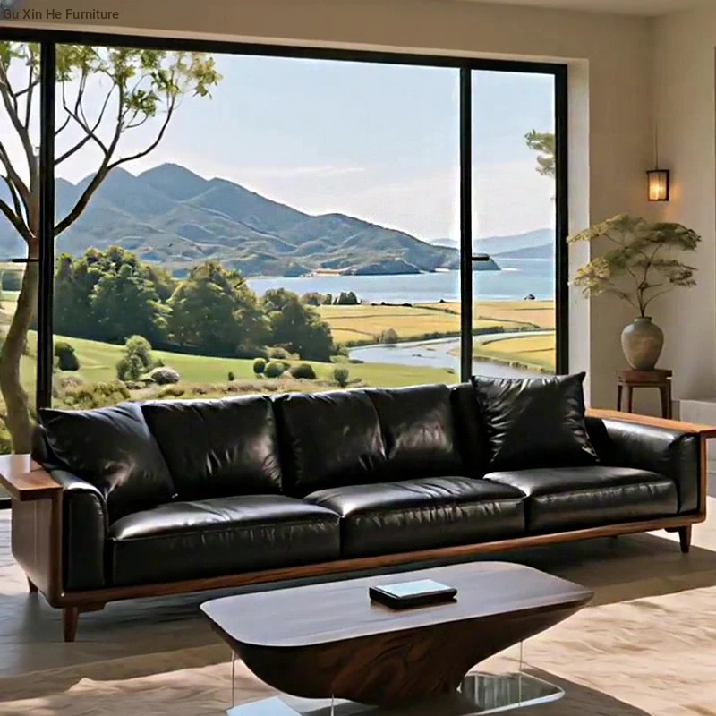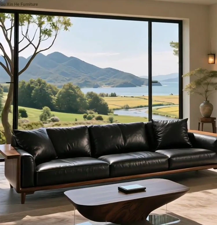 Italian Minimalist Luxury Genuine Leather Sofa - Retro Solid Wood Living Room Piece, 2025 New Arrival in North American Black Walnut - Elevate Your Space with Timeless Elegance!
