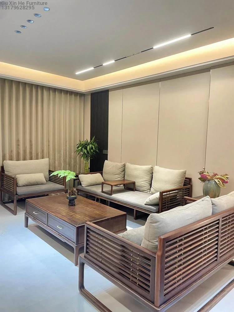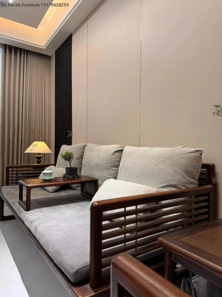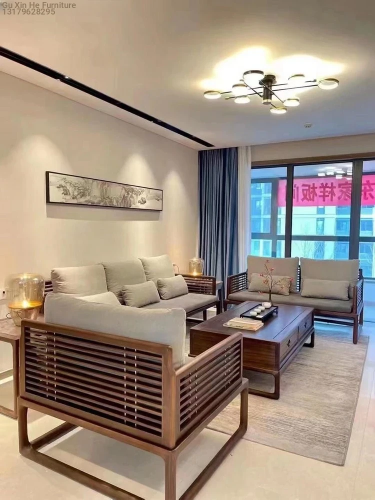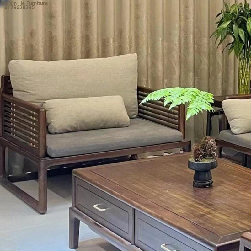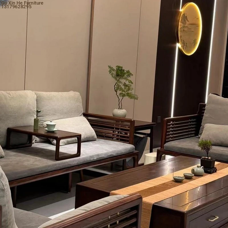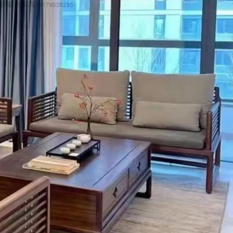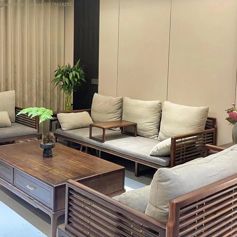 Modern Minimalist New Chinese Style Solid Wood Sofa Set - Versatile Winter/Summer Use, Perfect for Small and Large Spaces, Featuring Elegant Fabric Design and Zen Aesthetic.