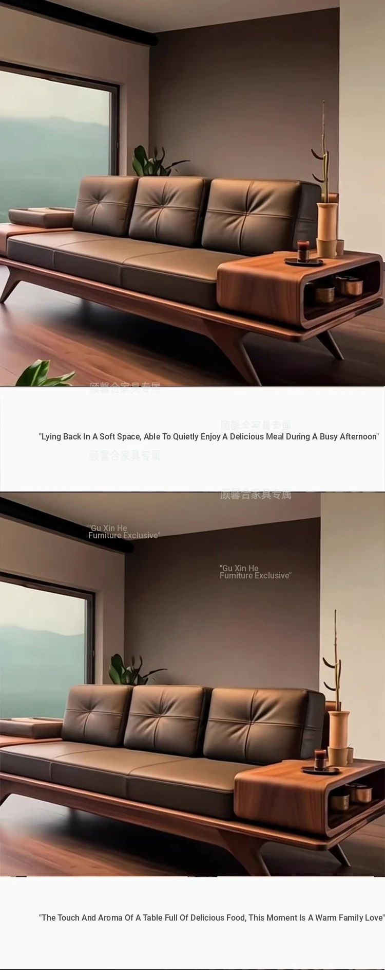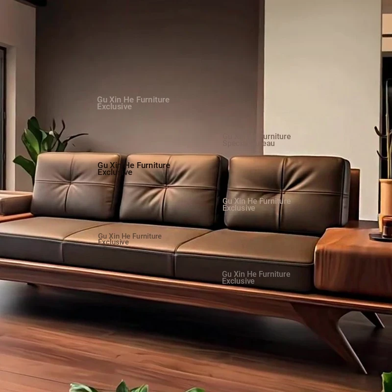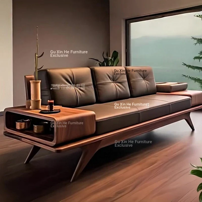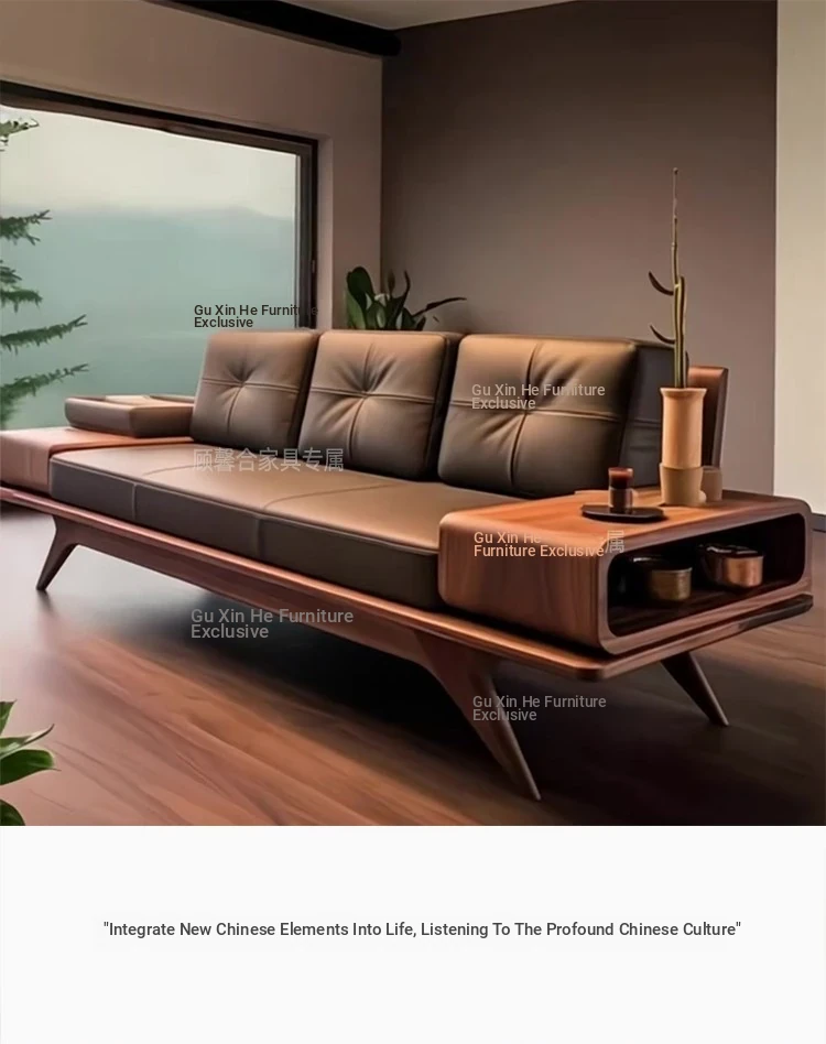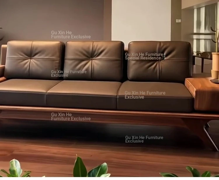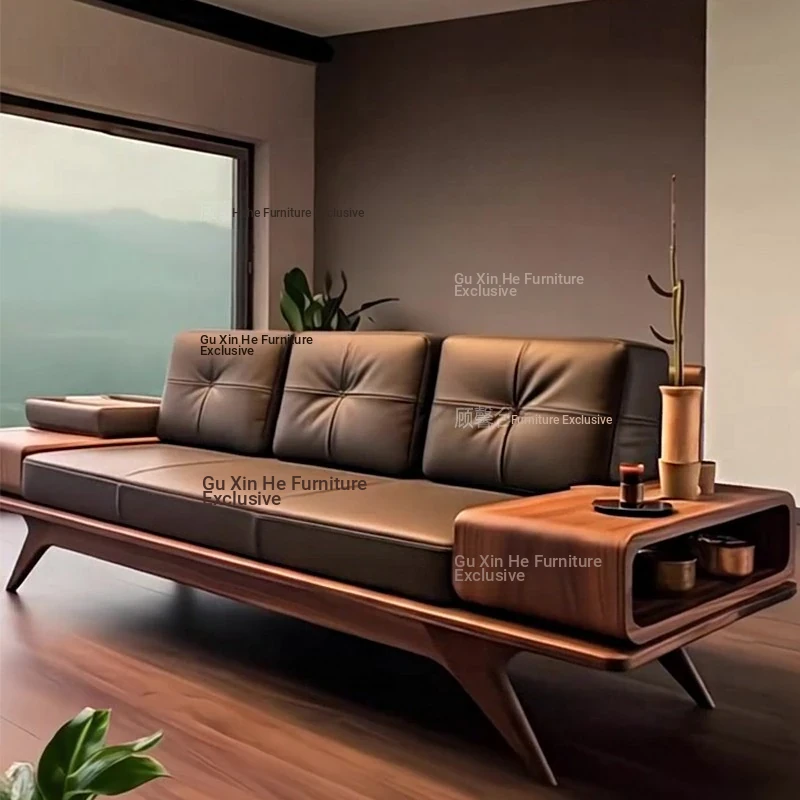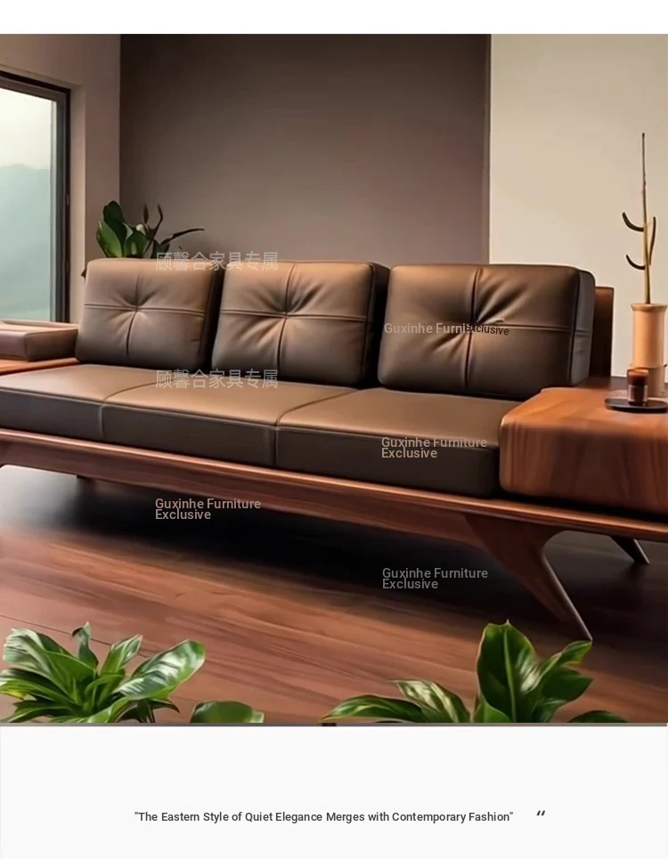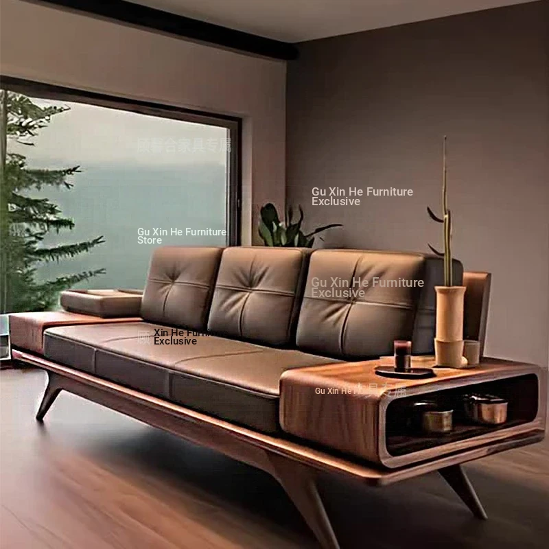 New Chinese Style Genuine Leather Solid Wood Sofa - Song Aesthetics 2025 Collection, Three-Seater in North American Black Walnut for Your Living Room