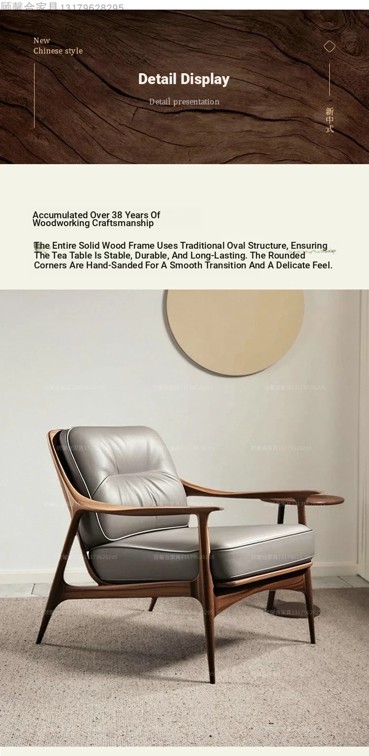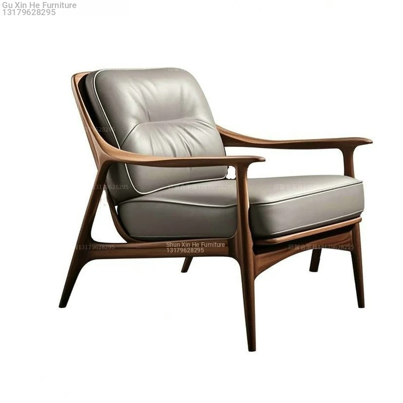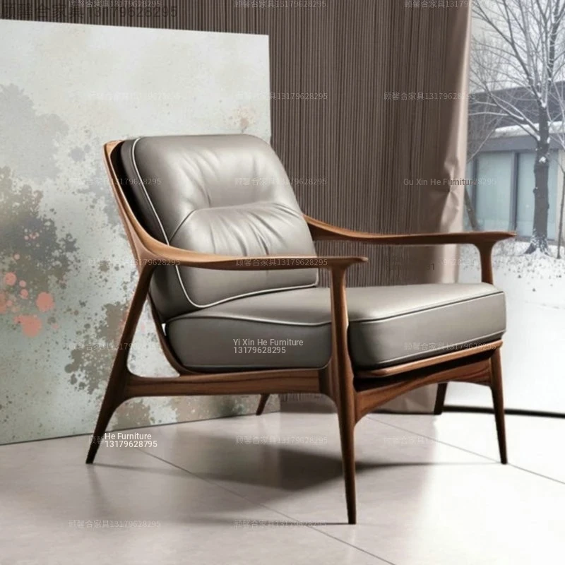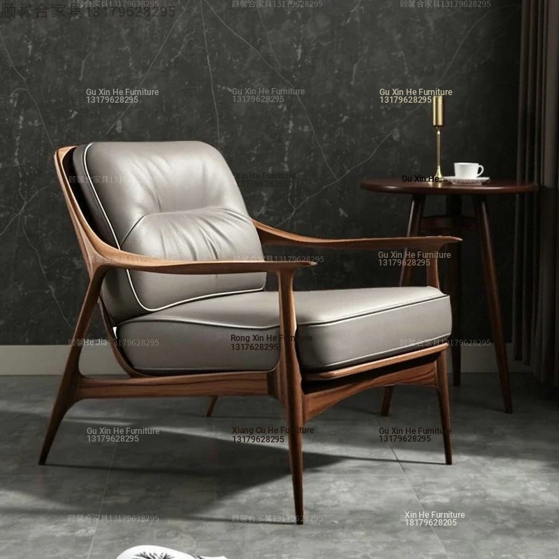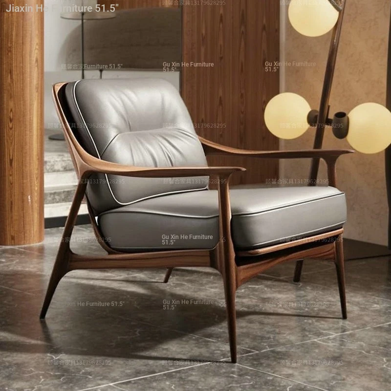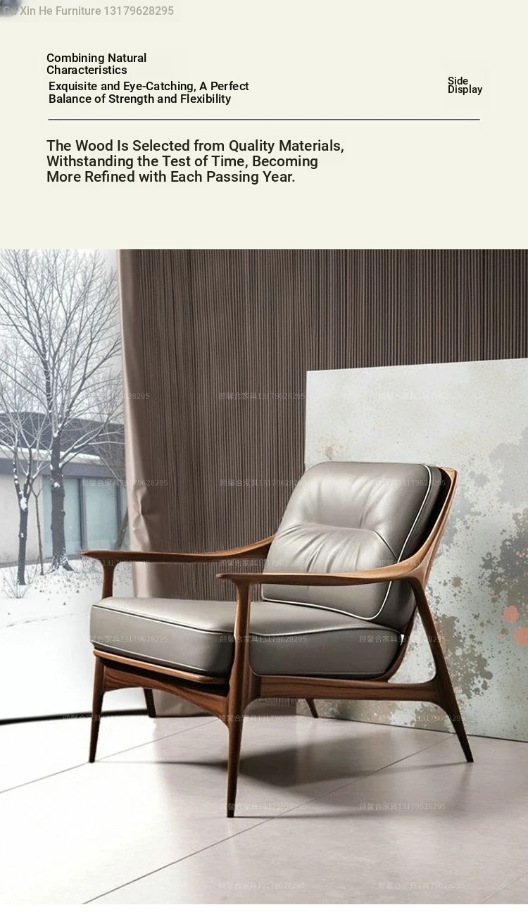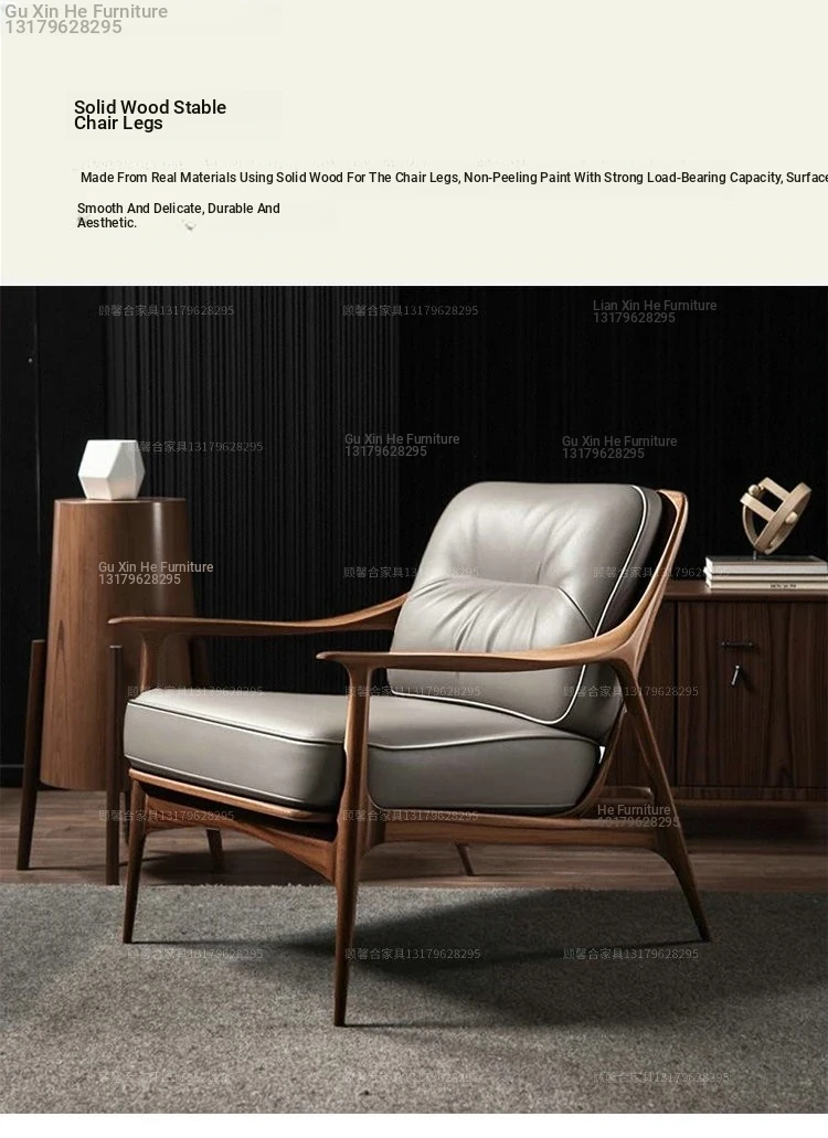 North American Black Walnut Leather Armchair - Designer Single Sofa for Living Room, Luxurious High-Back Accent Chair