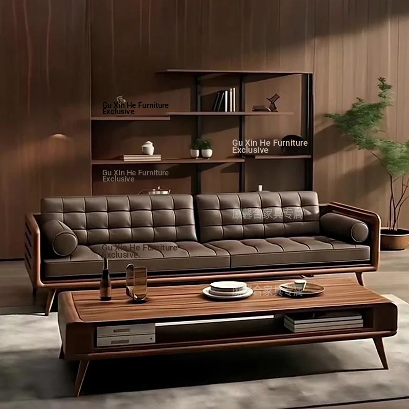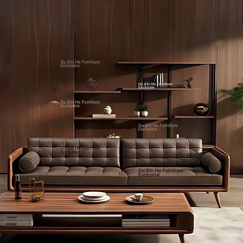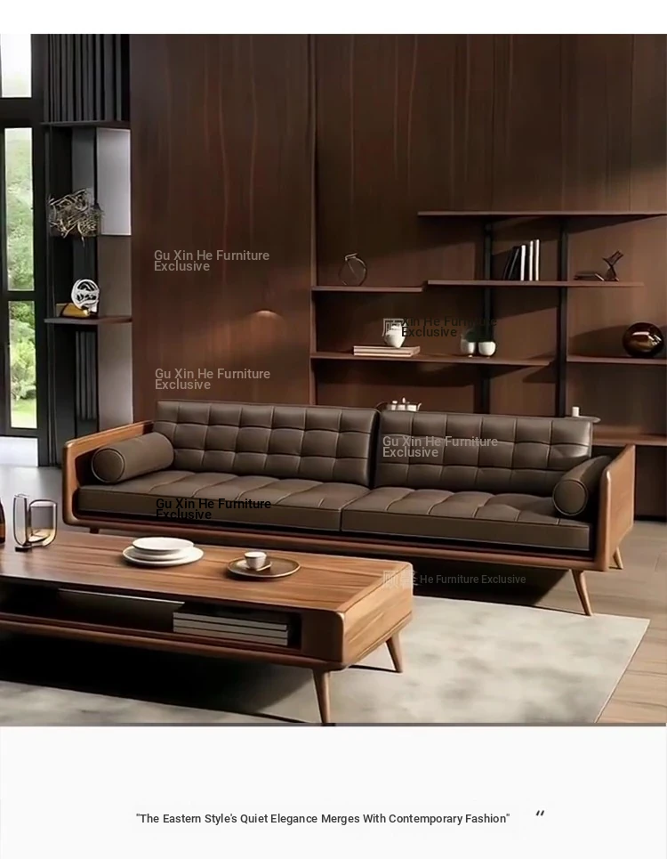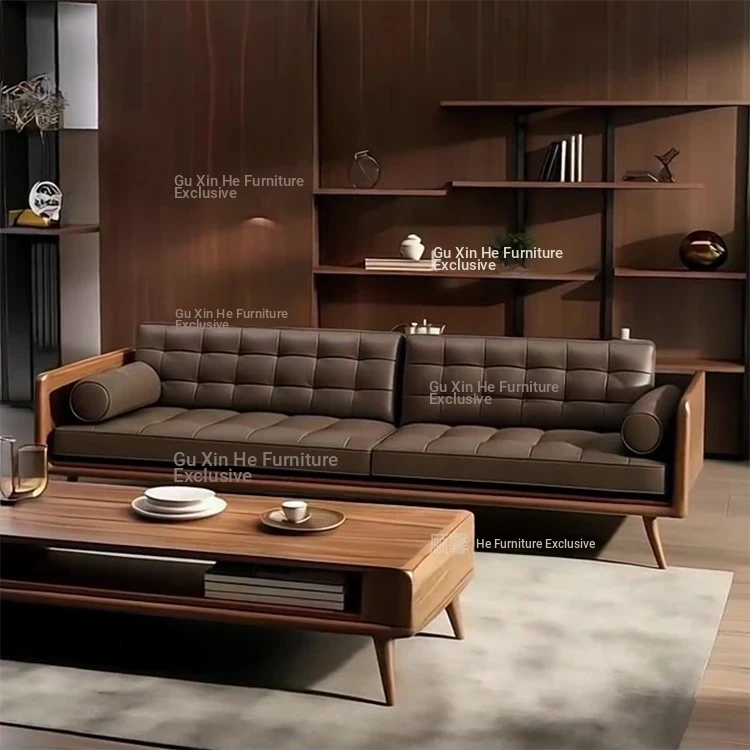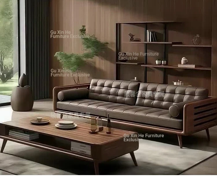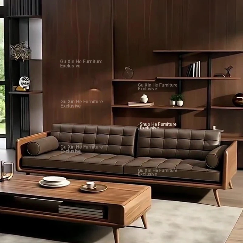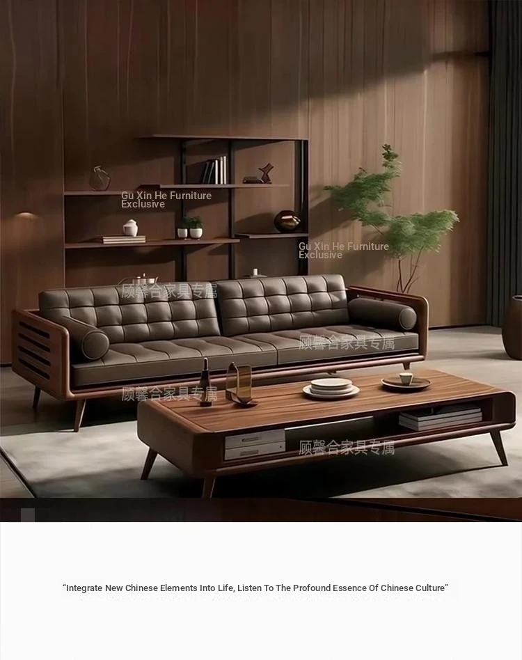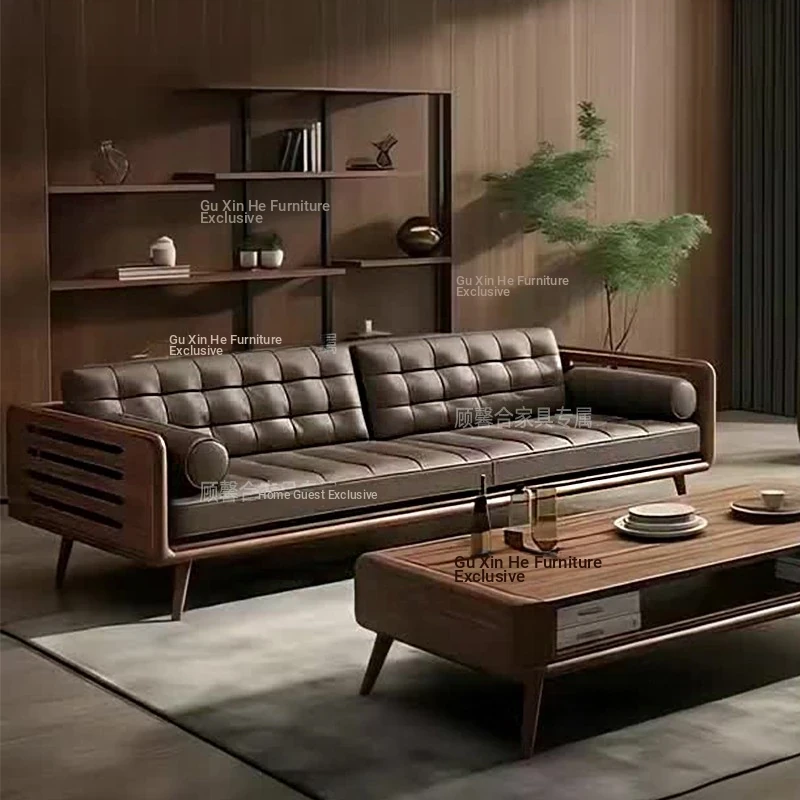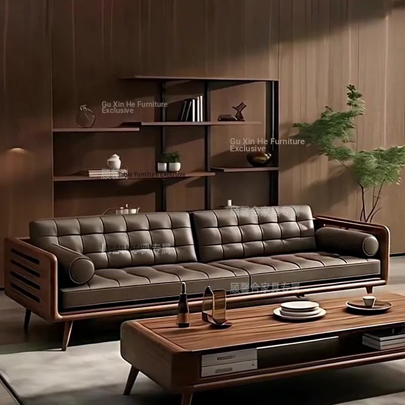 North American Black Walnut Song Aesthetic Straight Sofa - New Chinese Style Light Luxury Minimalist Living Room Genuine Leather Solid Wood Sofa