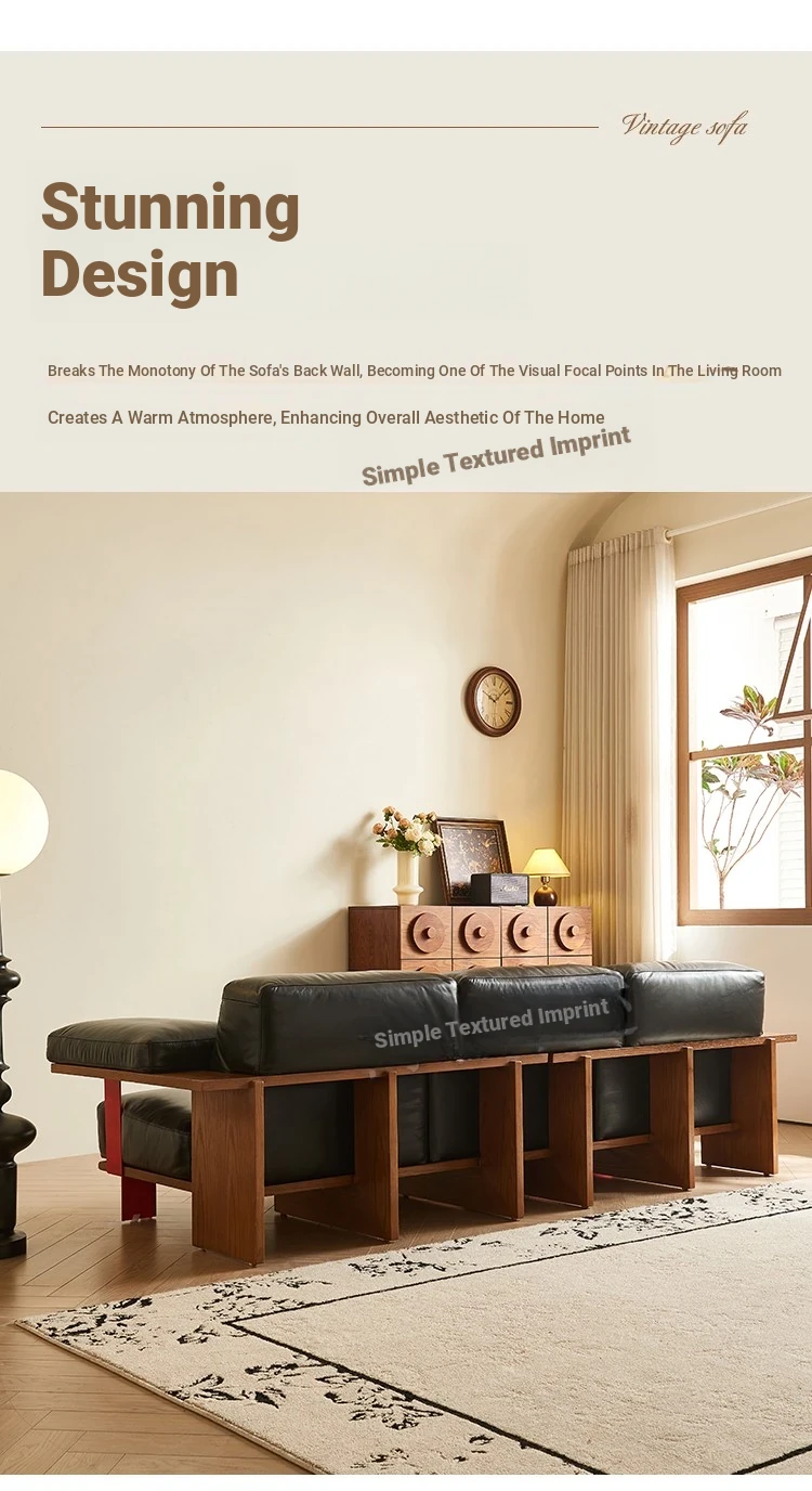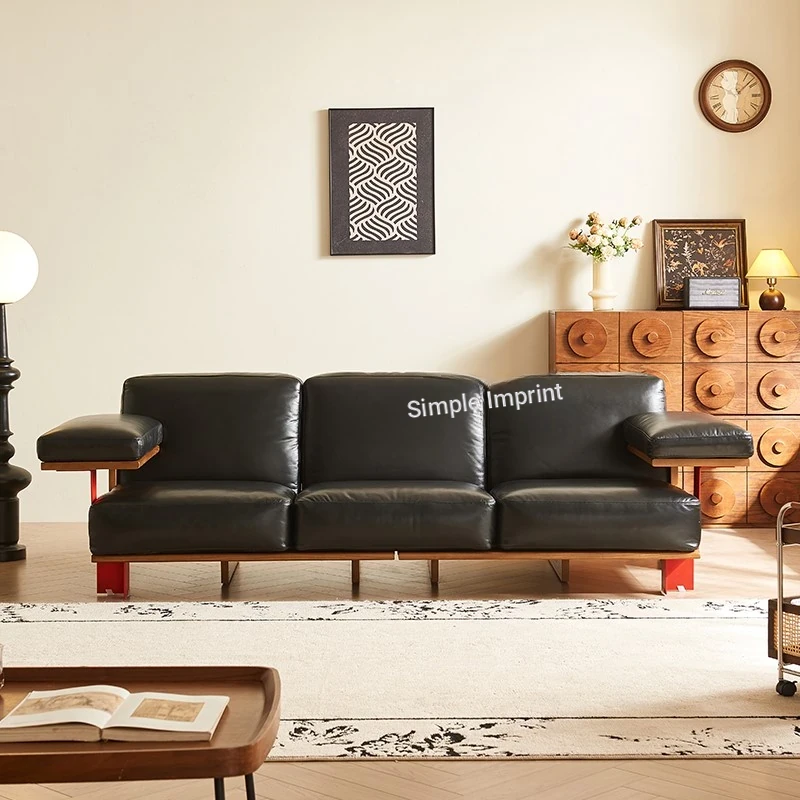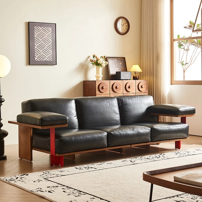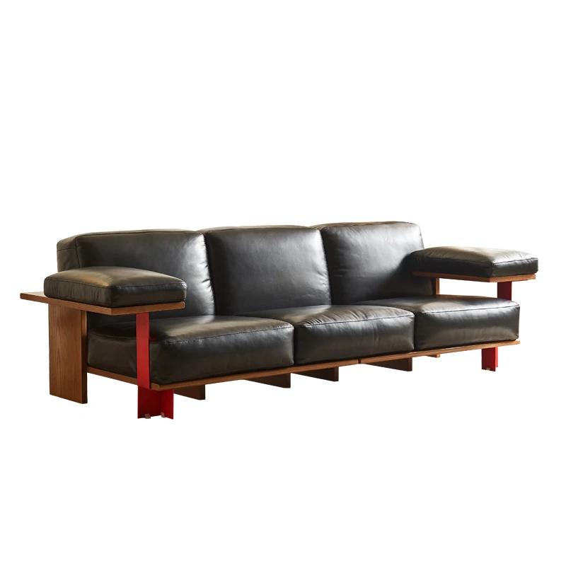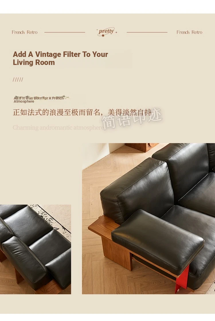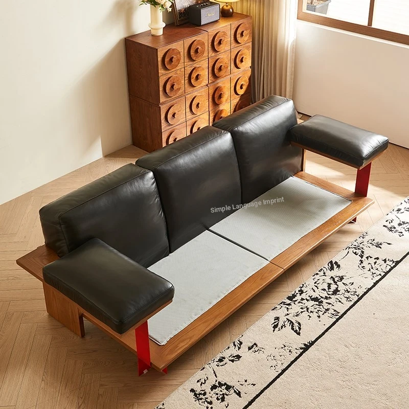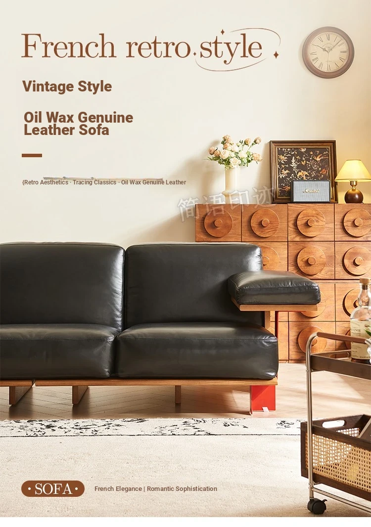 Vintage Style New White Ash Wood Solid Sofa with Black Waxed Leather - French Triple Seat Retro Straight Sofa for Your Living Room