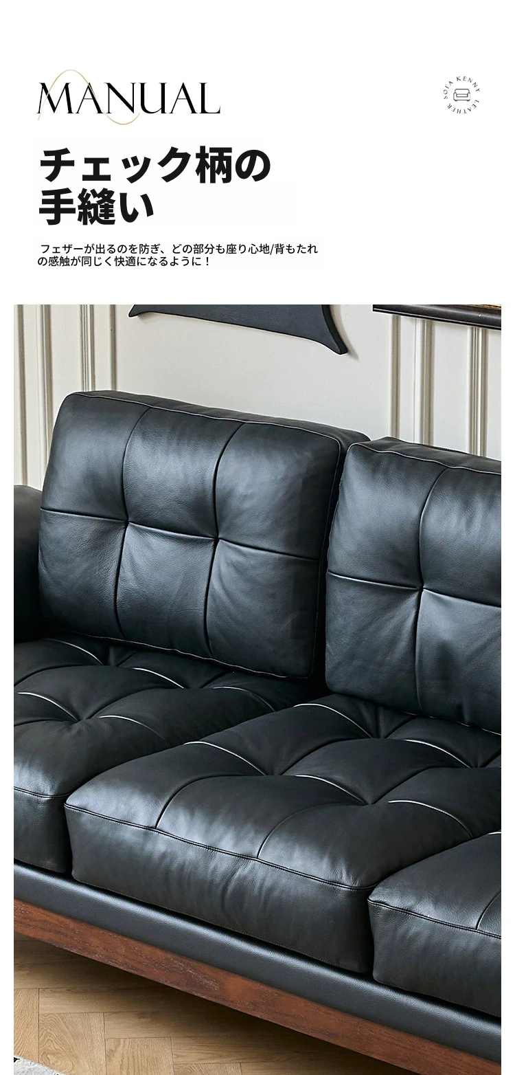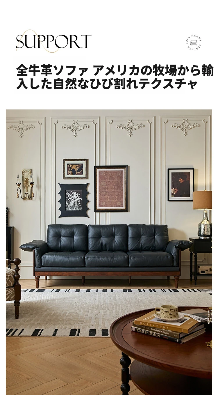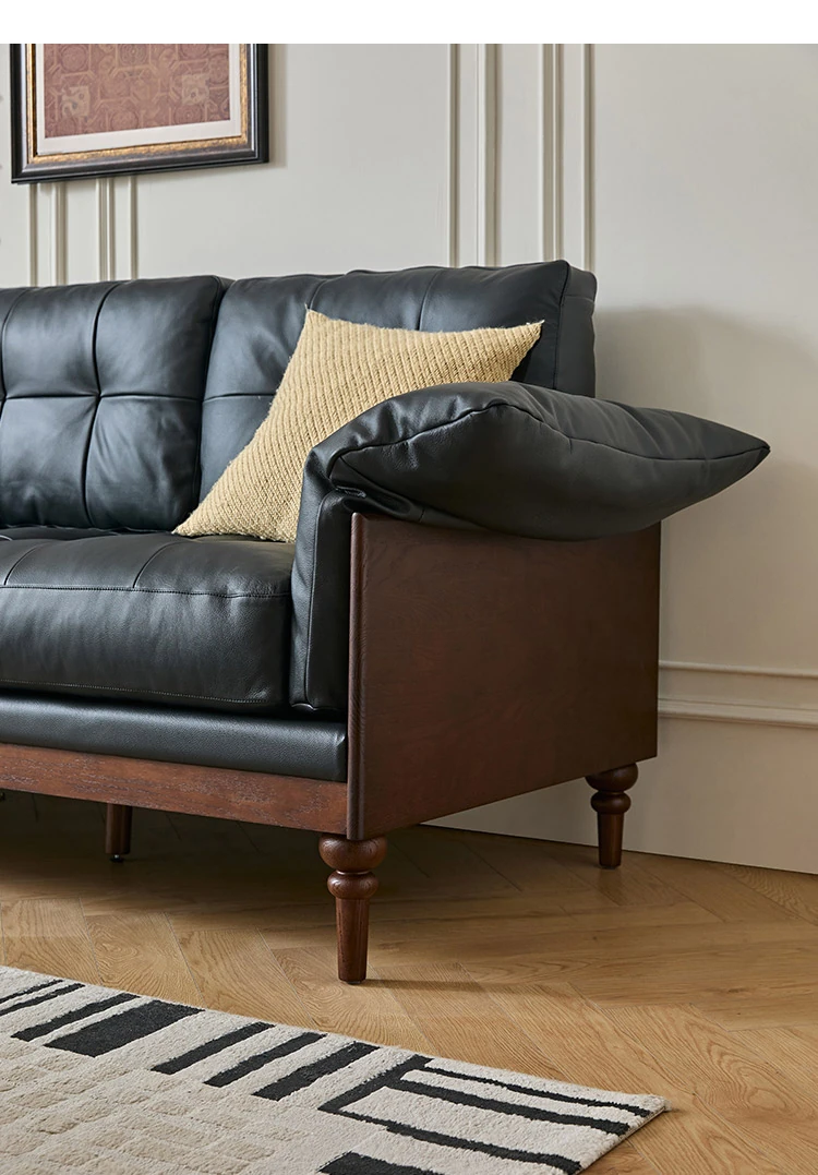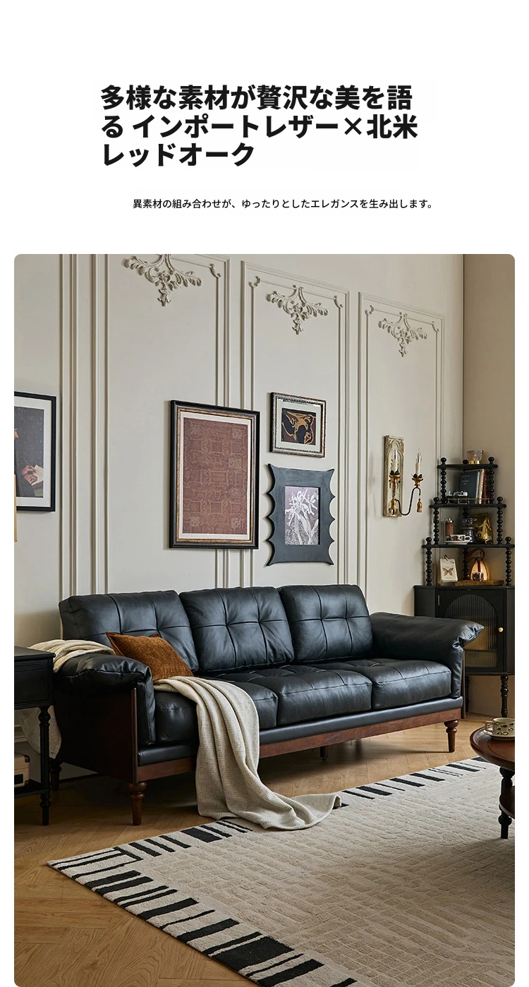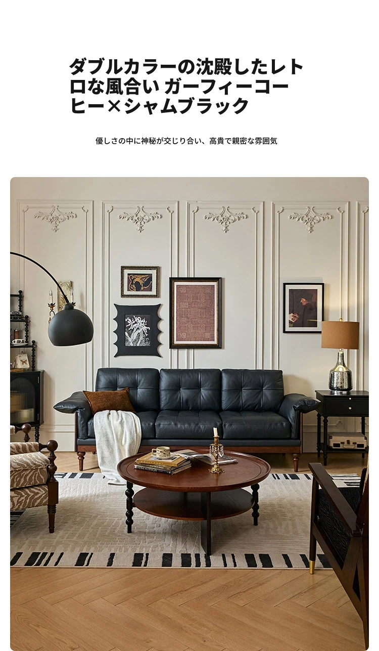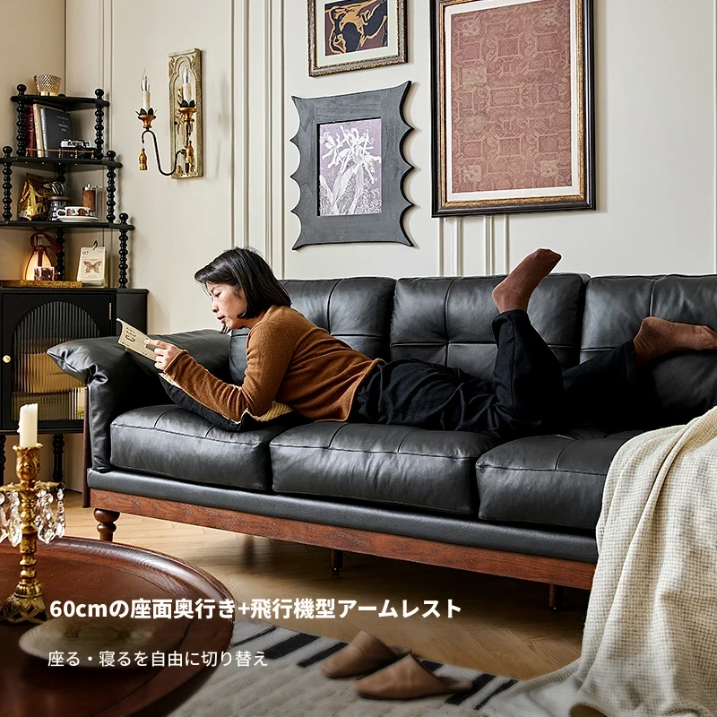 2025年新作!アメリカンスタイルの軽奢華全皮ブラックリアルウッドソファ。リビングルームにぴったりなリラックス三人掛け、最高級のトップグレインレザー使用。贅沢な空間を演出します!