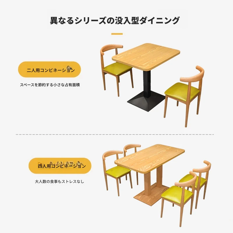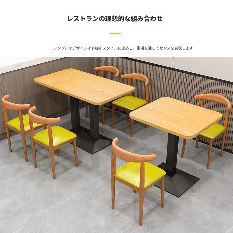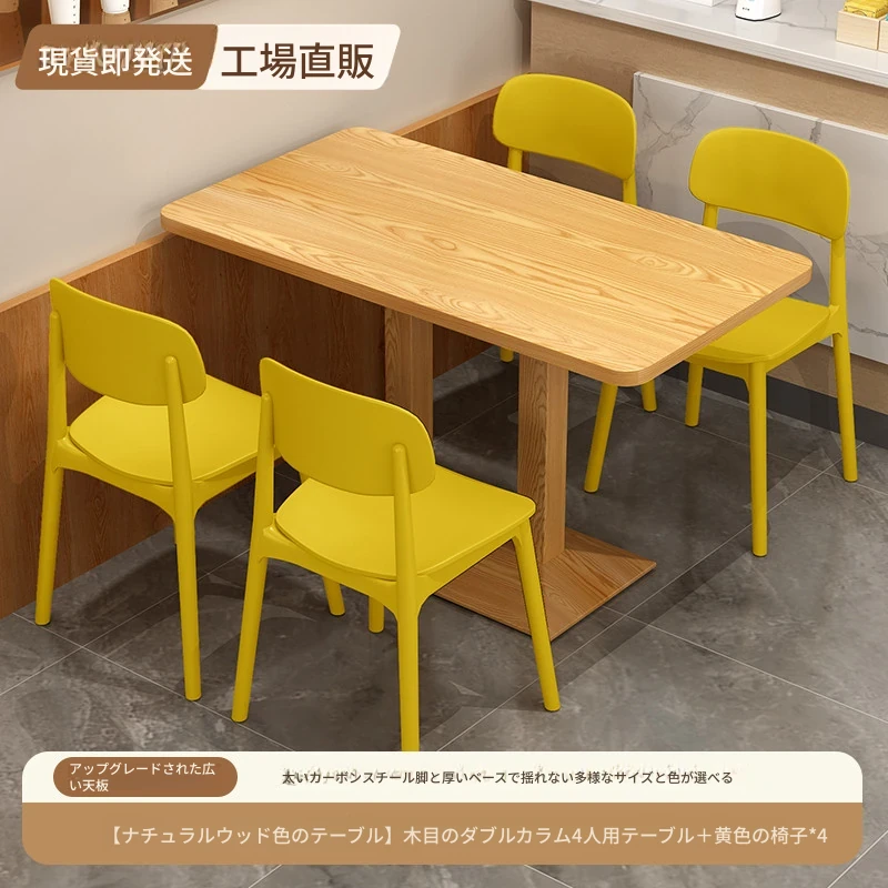 120*60ナチュラルウッド色テーブル黒ダブル柱シングルテーブル+イエロー椅子*4