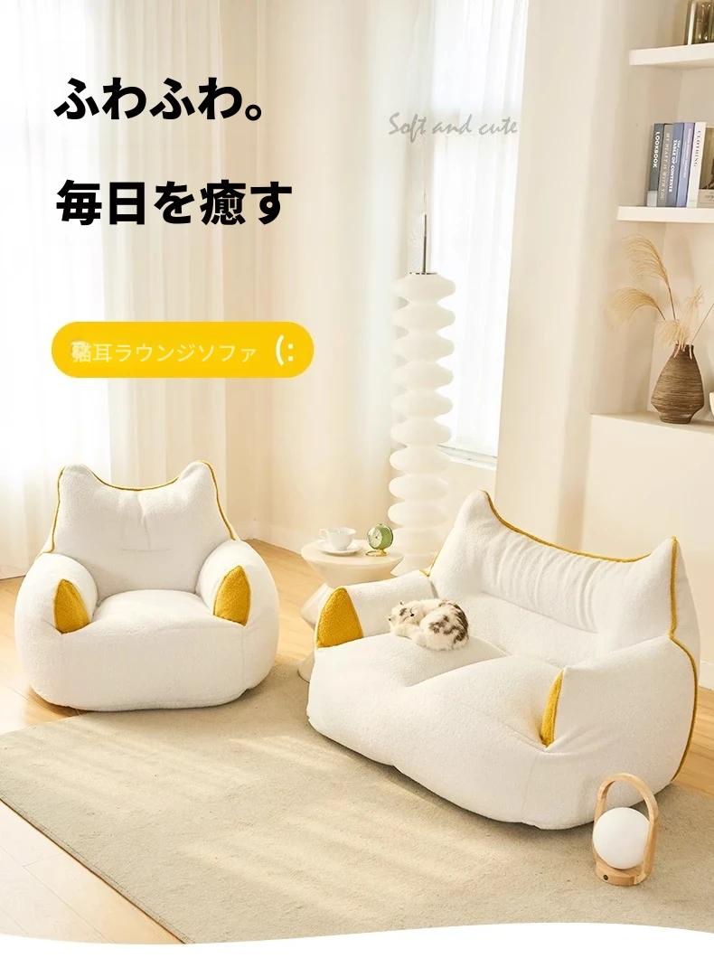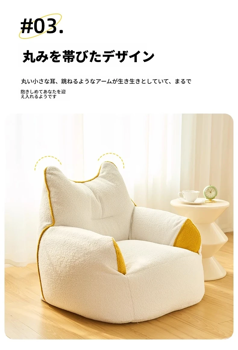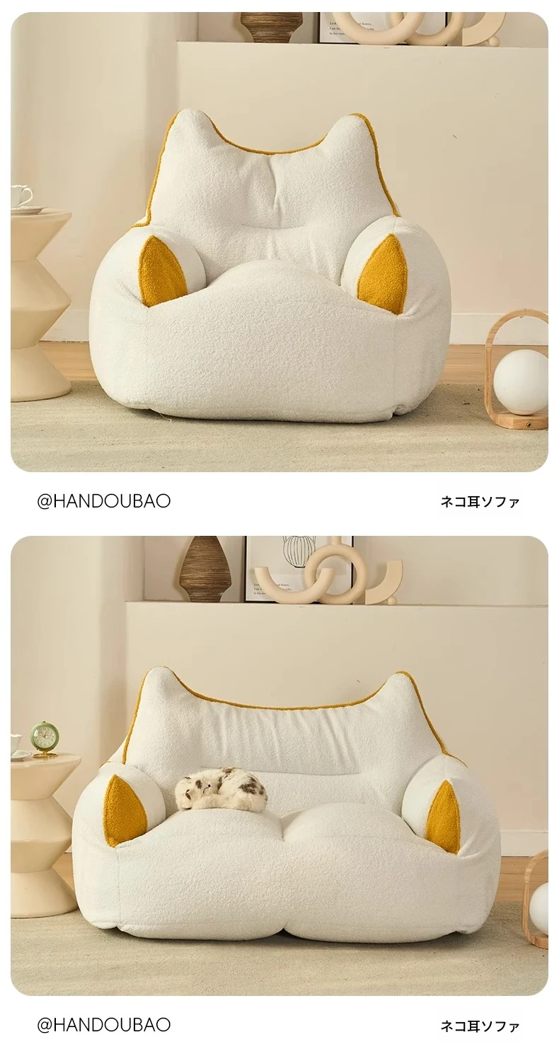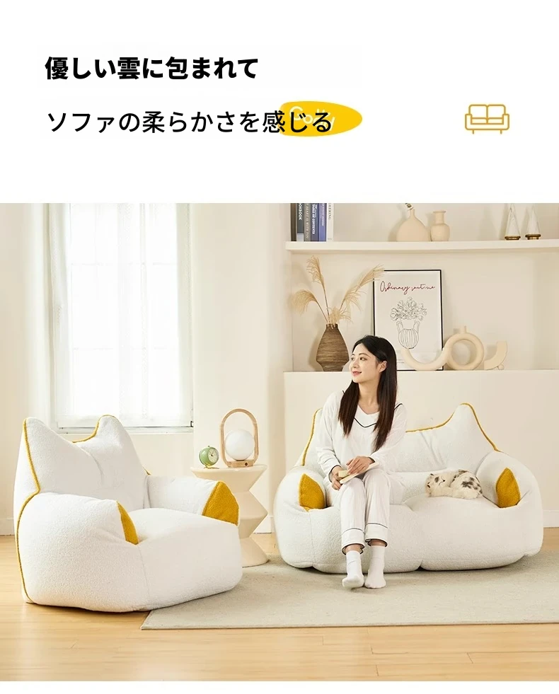 猫耳デザインのリラックス豆袋ソファ - 寝転びもできるダブルシート!小さなお部屋やリビングに最適な畳スタイルの快適チェア。心地よいくつろぎをお届けします。