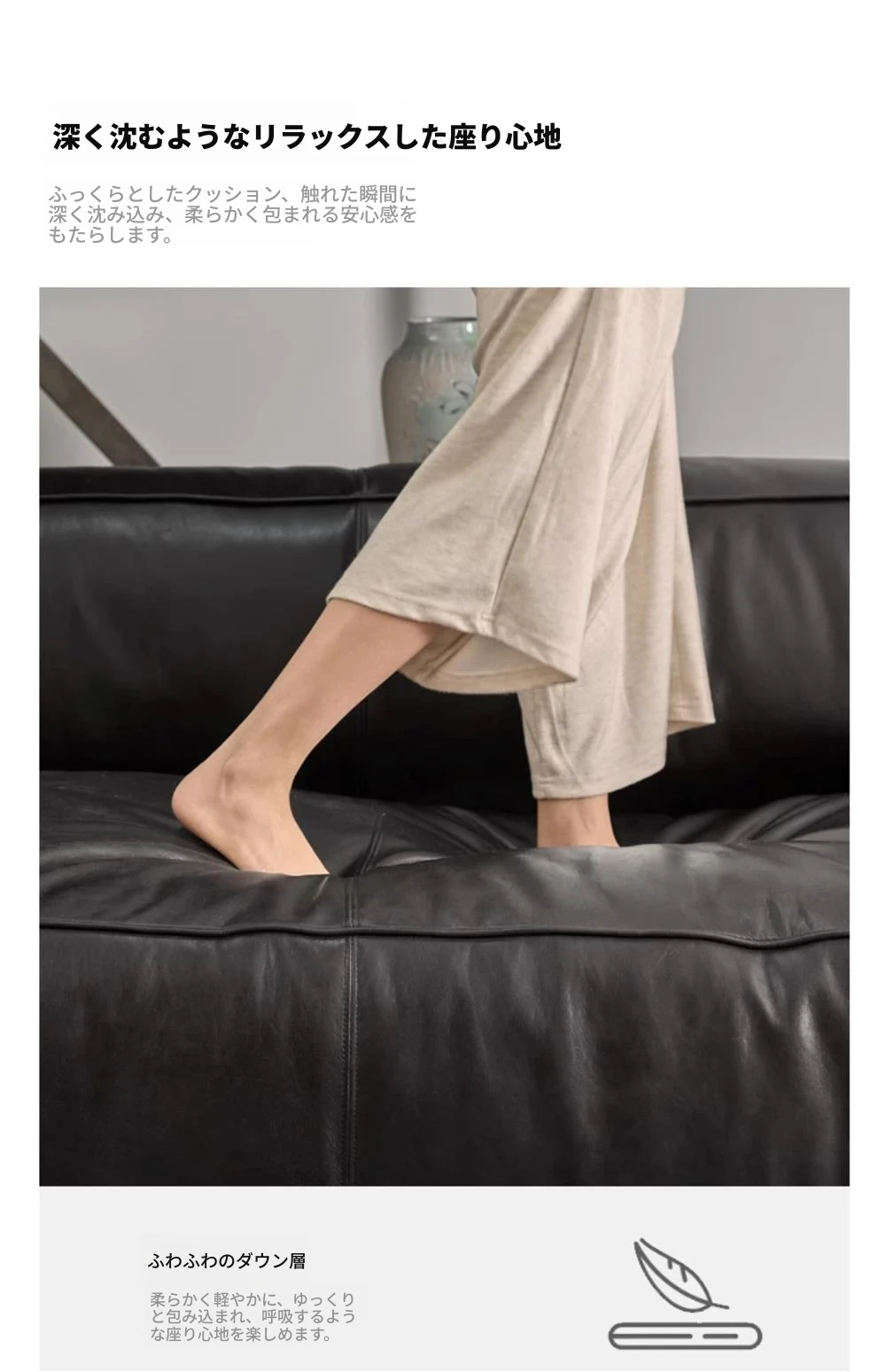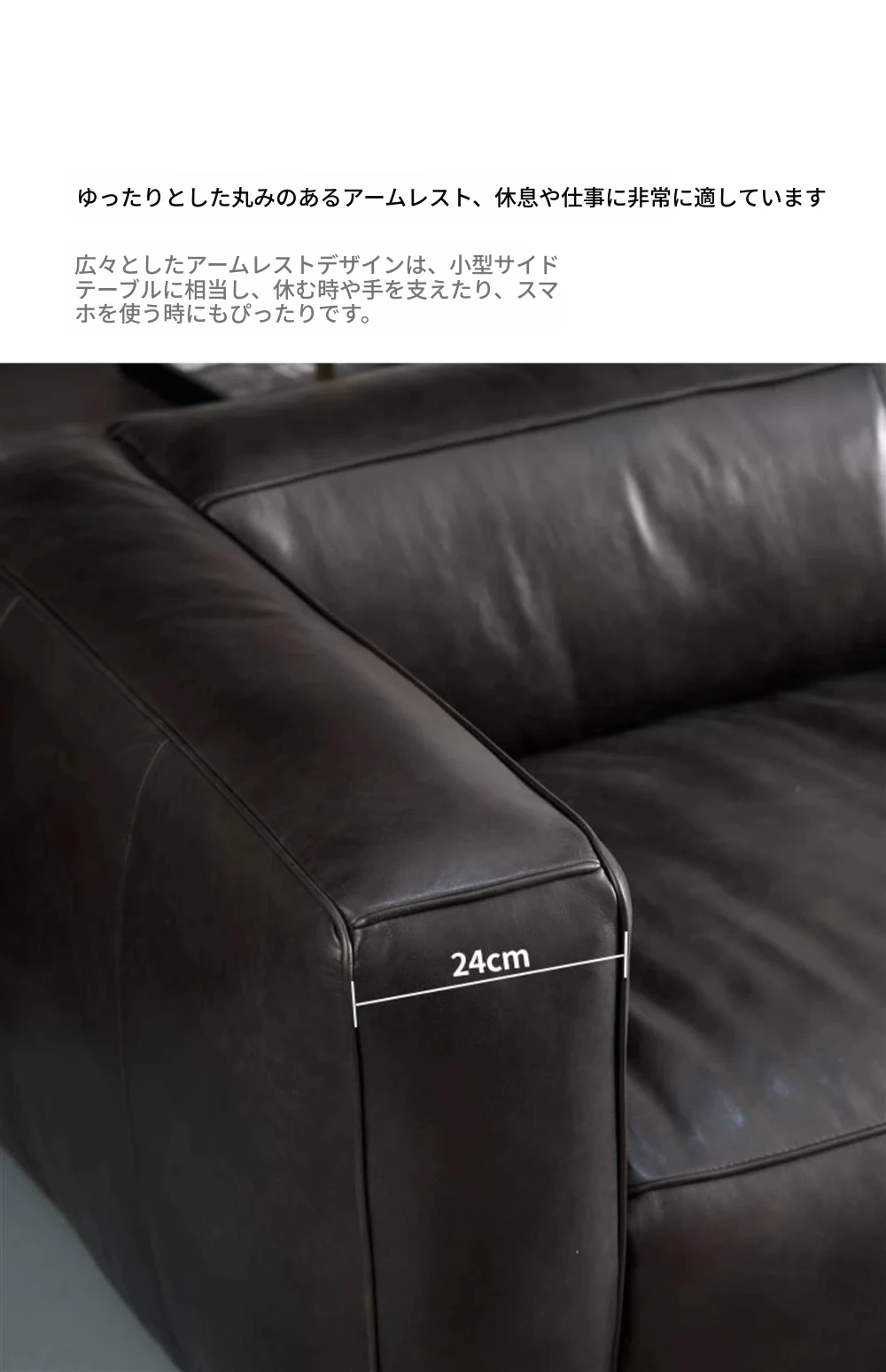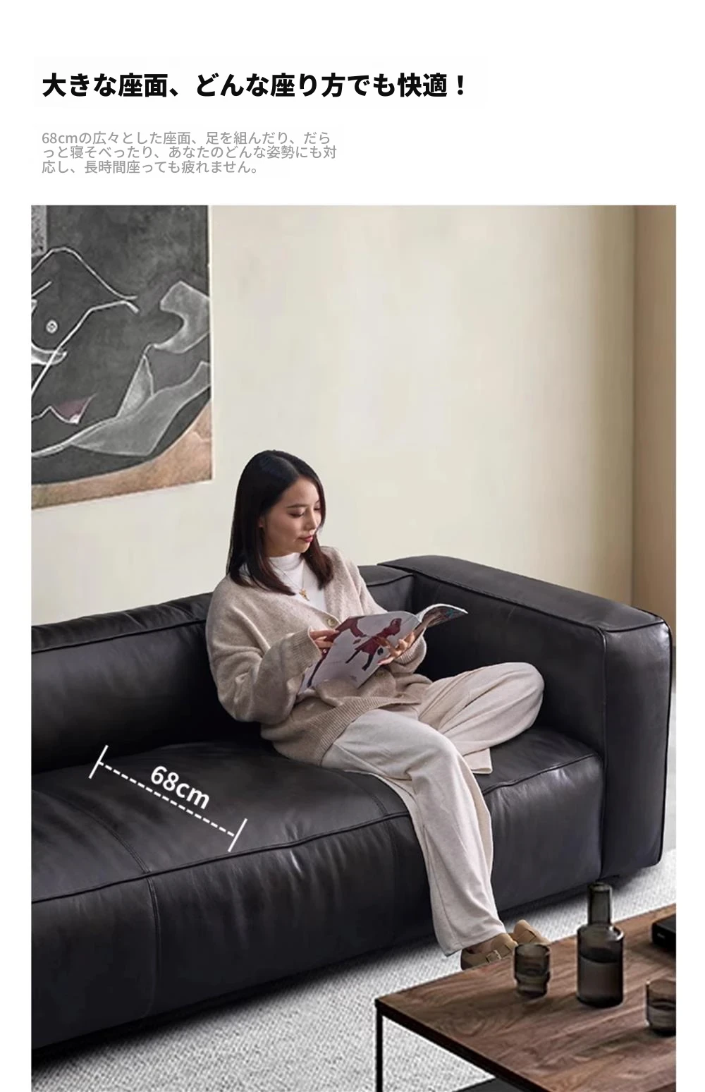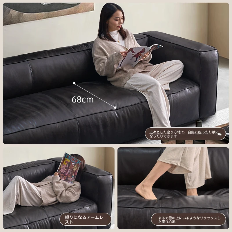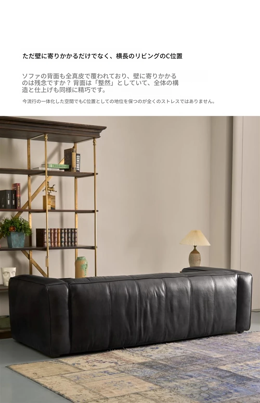 デザイナーズスタイルの本革ブラックソファ - ヴィンテージ感溢れる本革トーフブロックシート、リビングルームに最適な高級レザー使用!おしゃれで落ち着いた雰囲気を演出します。