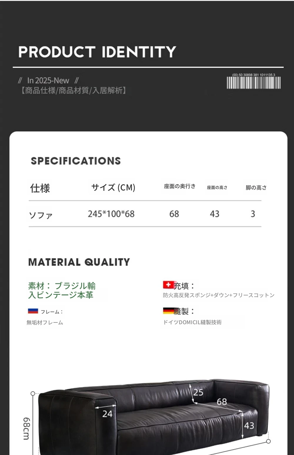 2.45m三人用 輸入接触面本革【家庭用おすすめ型】