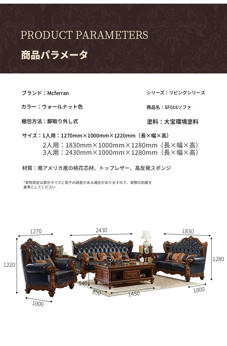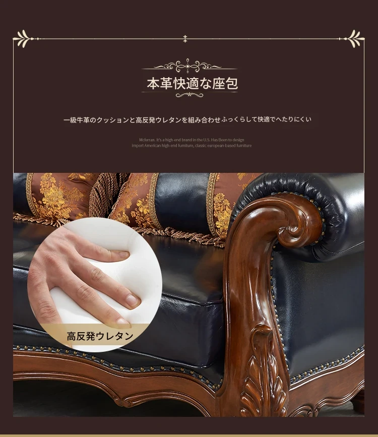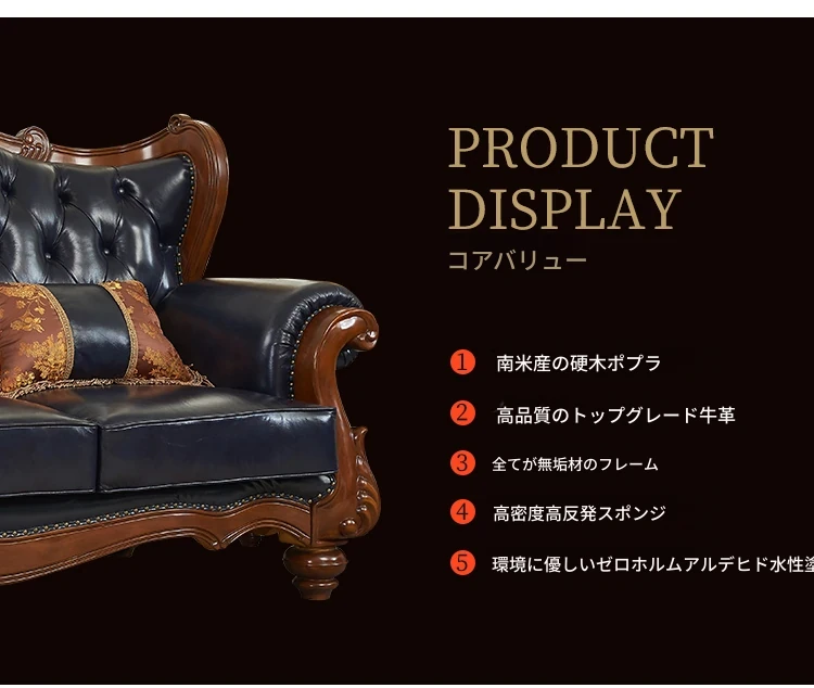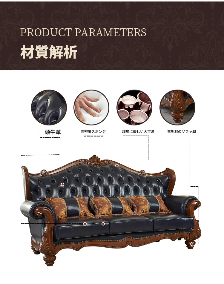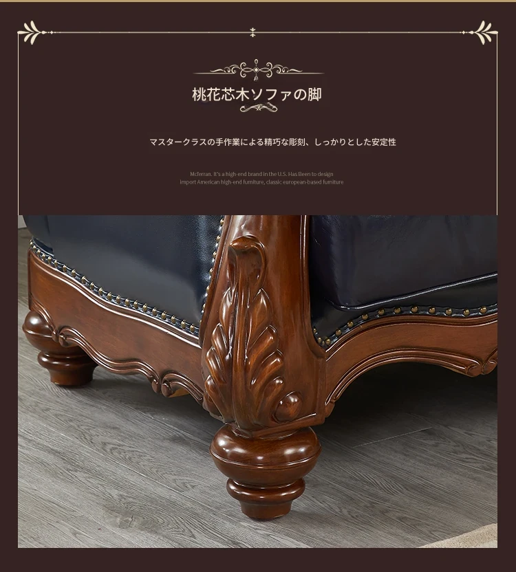高級欧式全実木真皮ソファー - 最高級の頭層牛革使用、豪華なデザインで広々としたリビングやヴィラにぴったり!天然木の彫刻が美しさを引き立てる、特別な空間を演出する家具016。