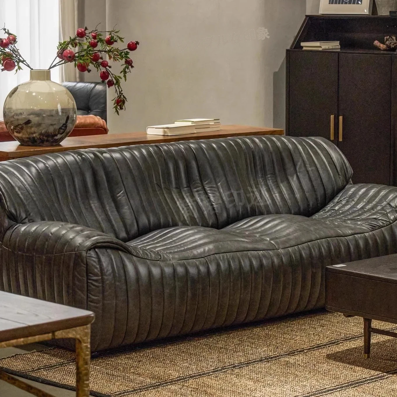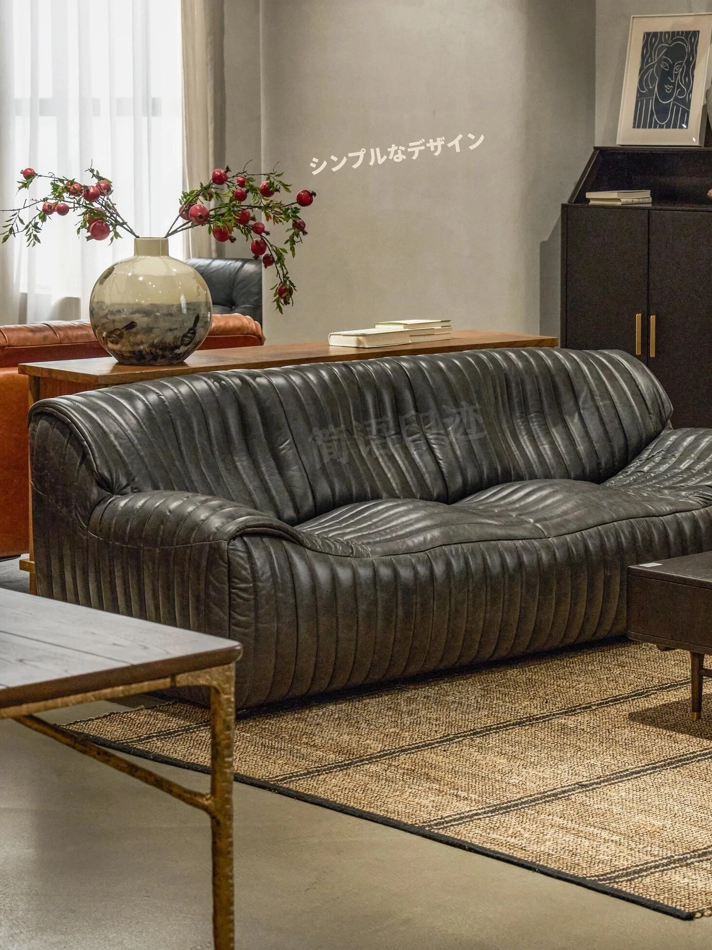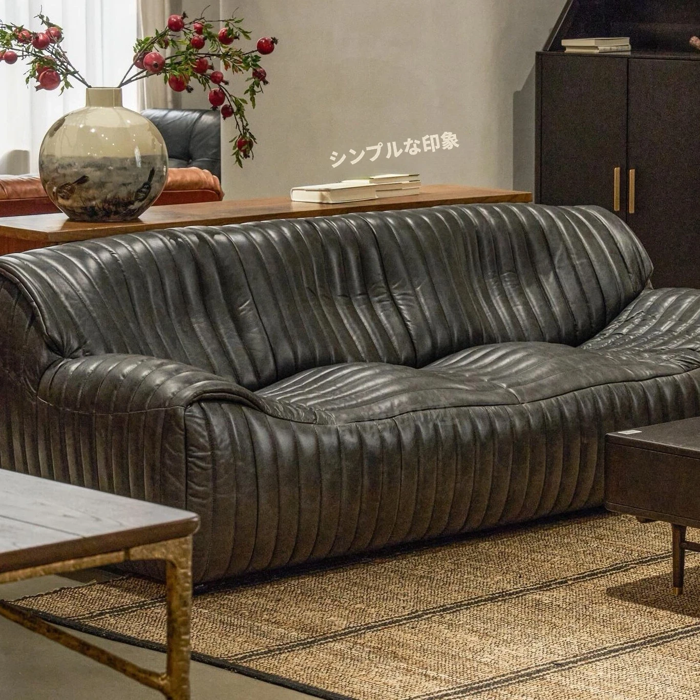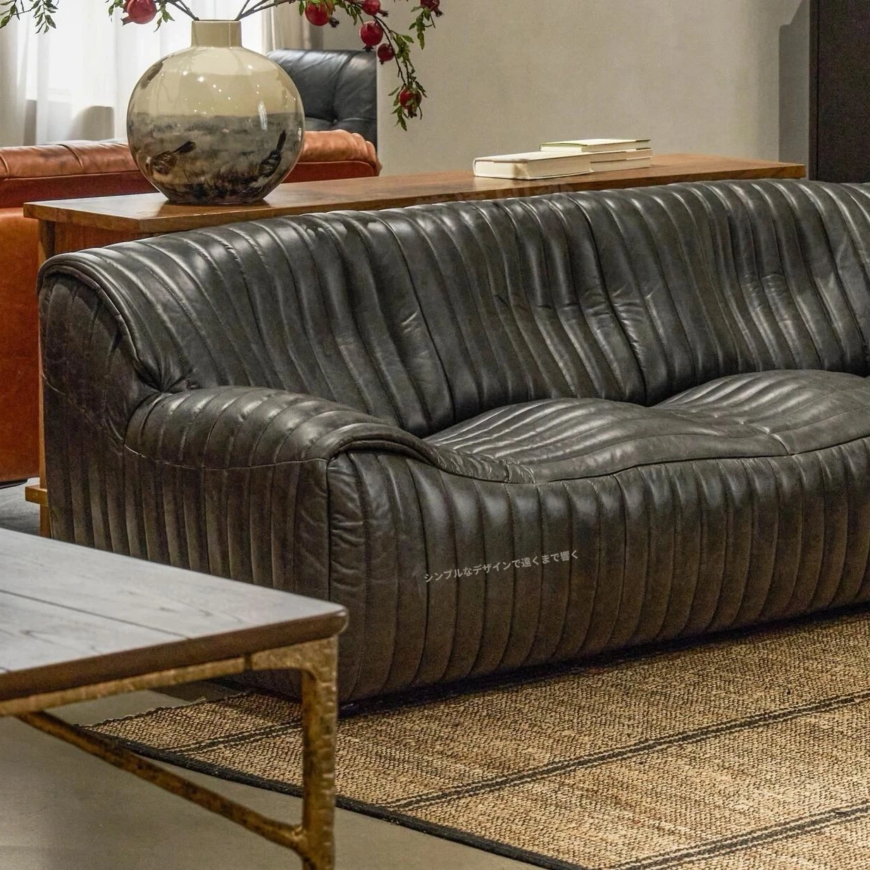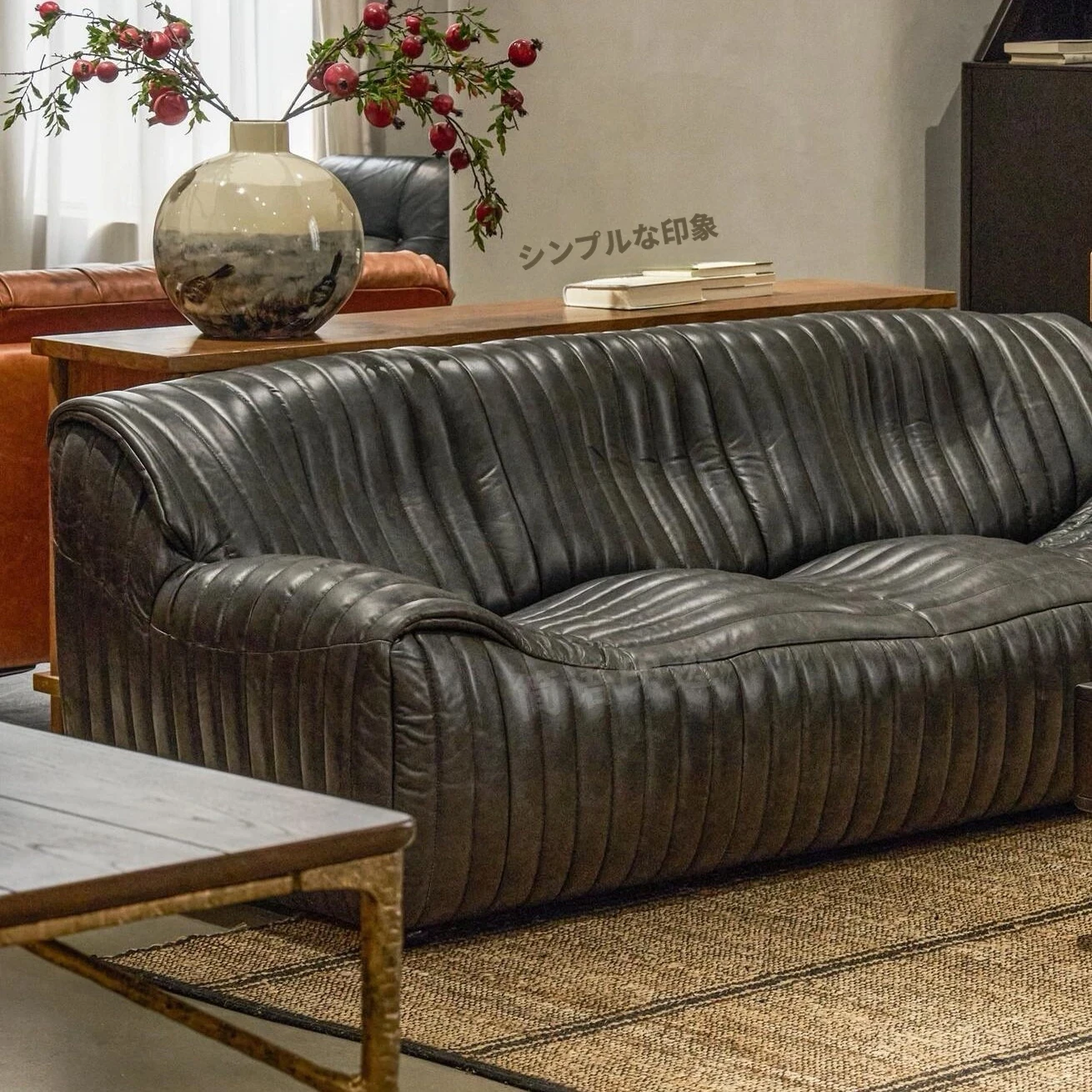 フランス風アンティーク波浪ソファー - 小型リビングにぴったりの本革ブラック、アメリカンレトロデザイン。接待室やシガーバーにも最適!おしゃれで高級感あふれる空間を演出します。