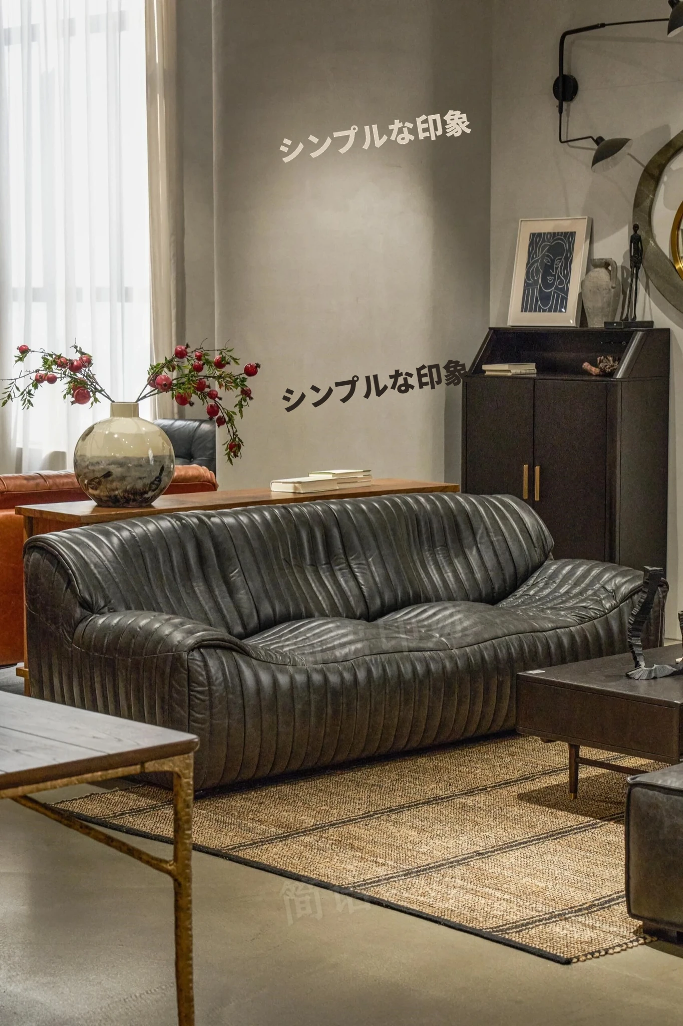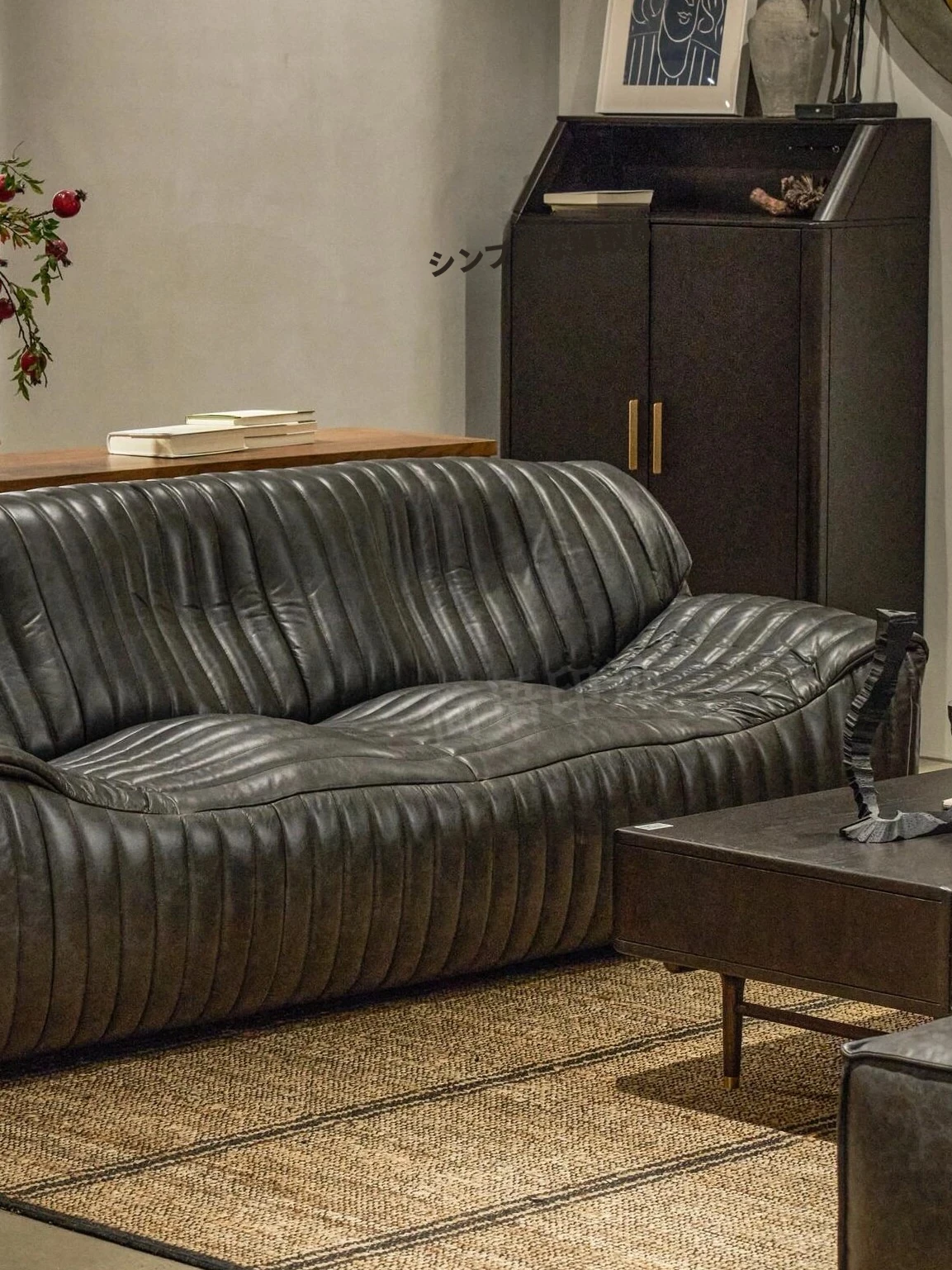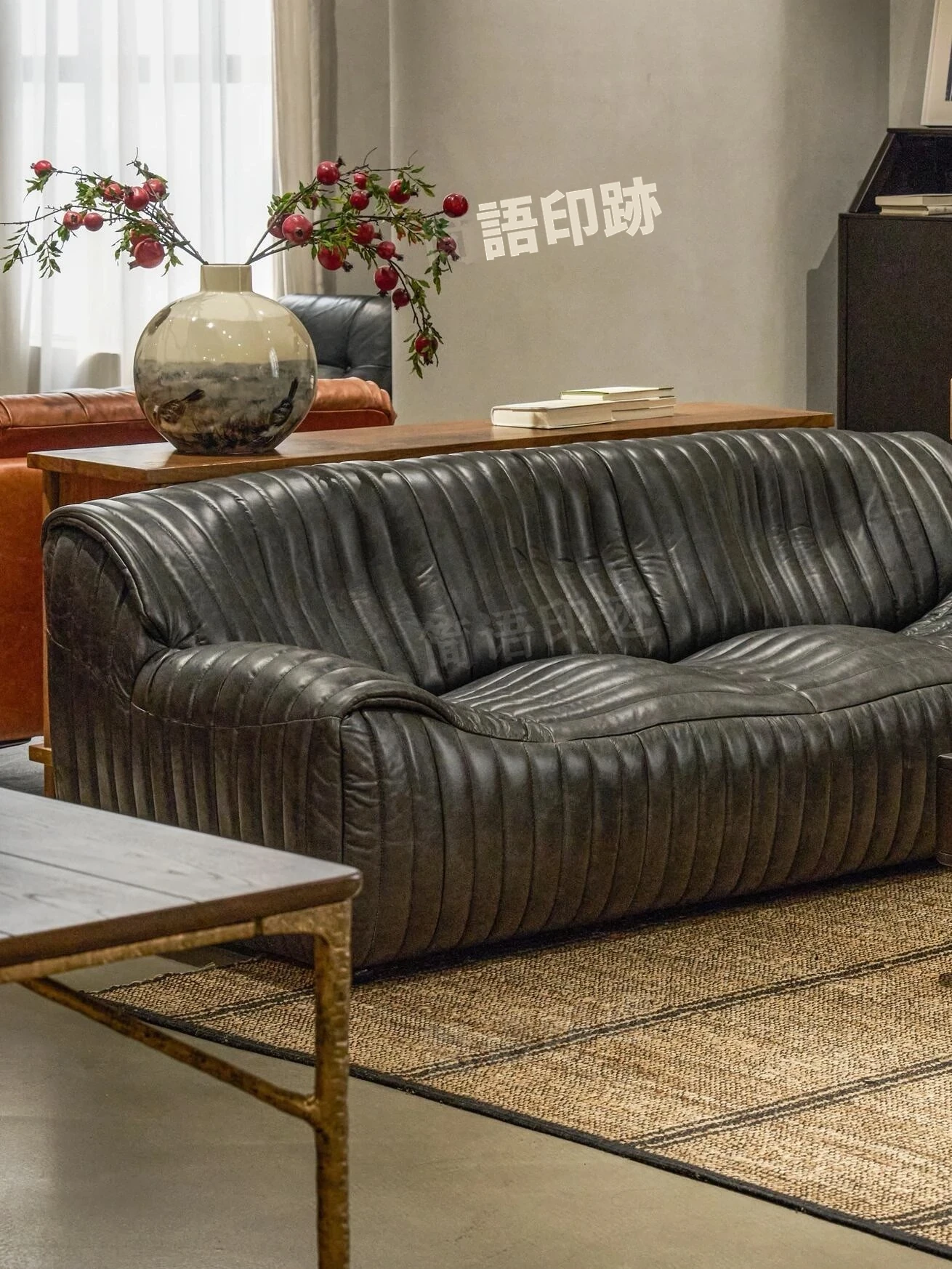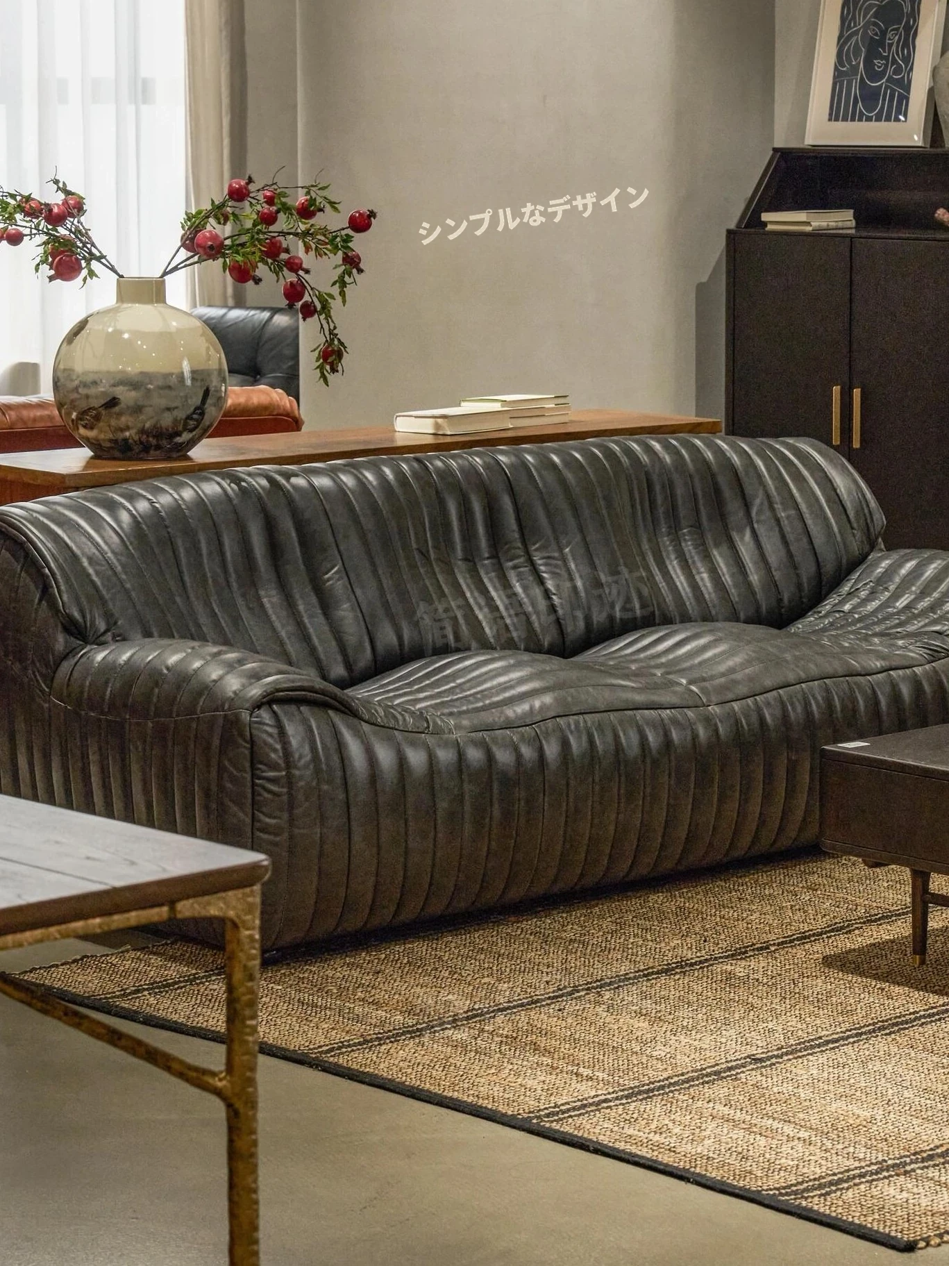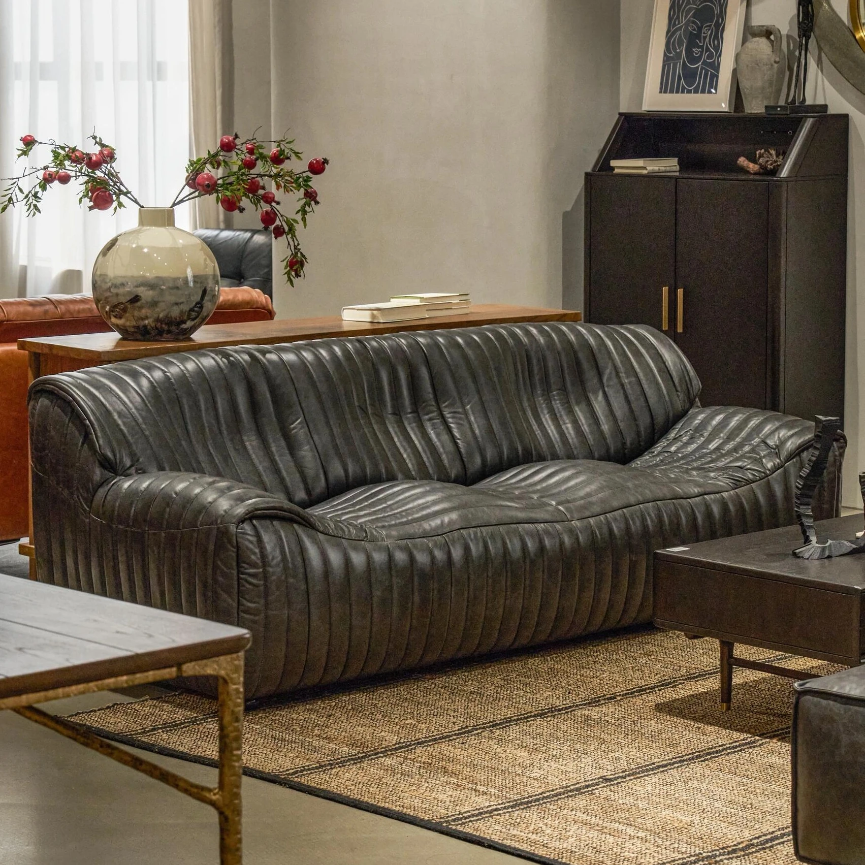 フランス風アンティーク波浪ソファー - 小型リビングにぴったりの本革ブラック、アメリカンレトロデザイン。接待室やシガーバーにも最適!おしゃれで高級感あふれる空間を演出します。