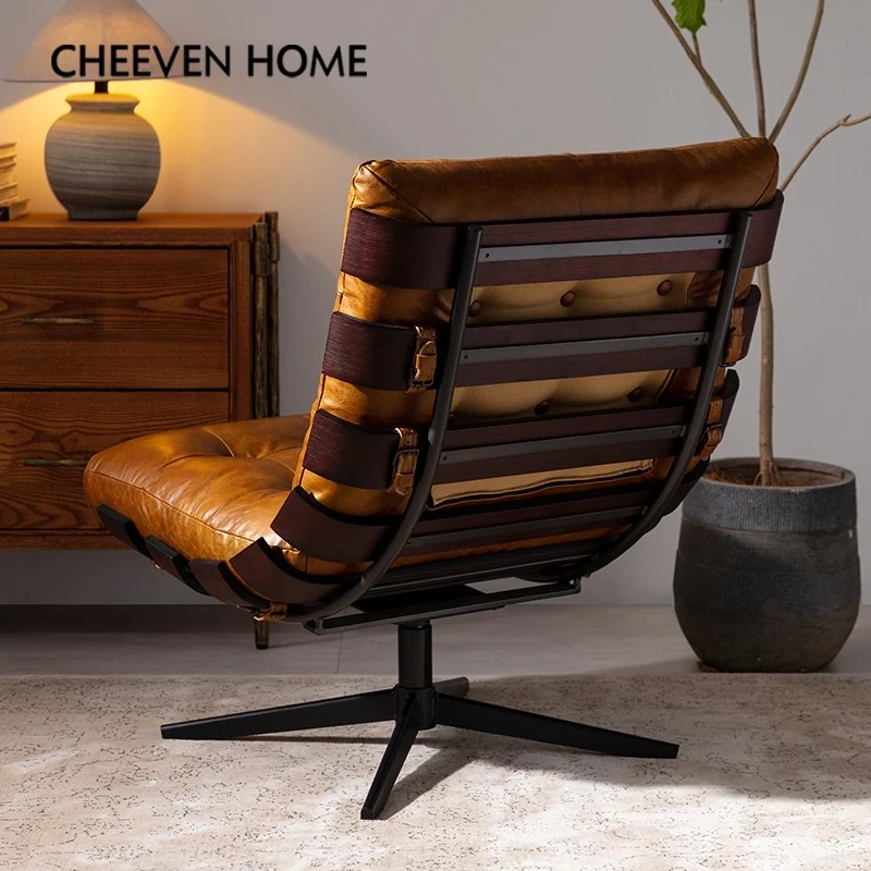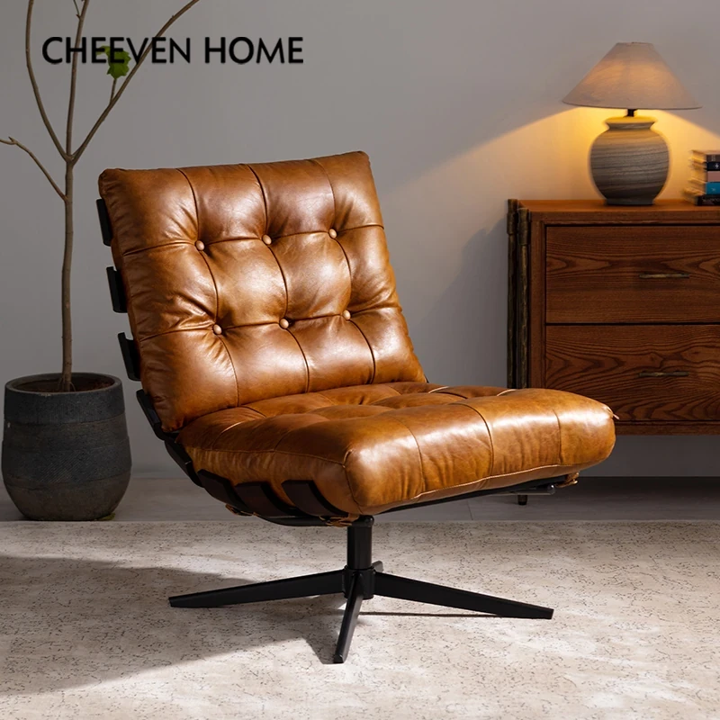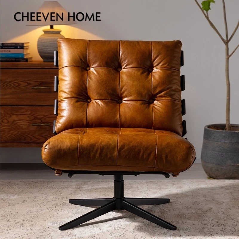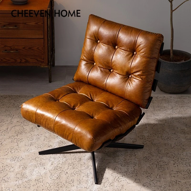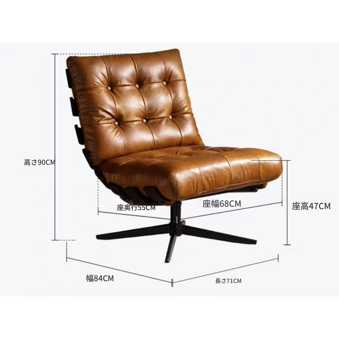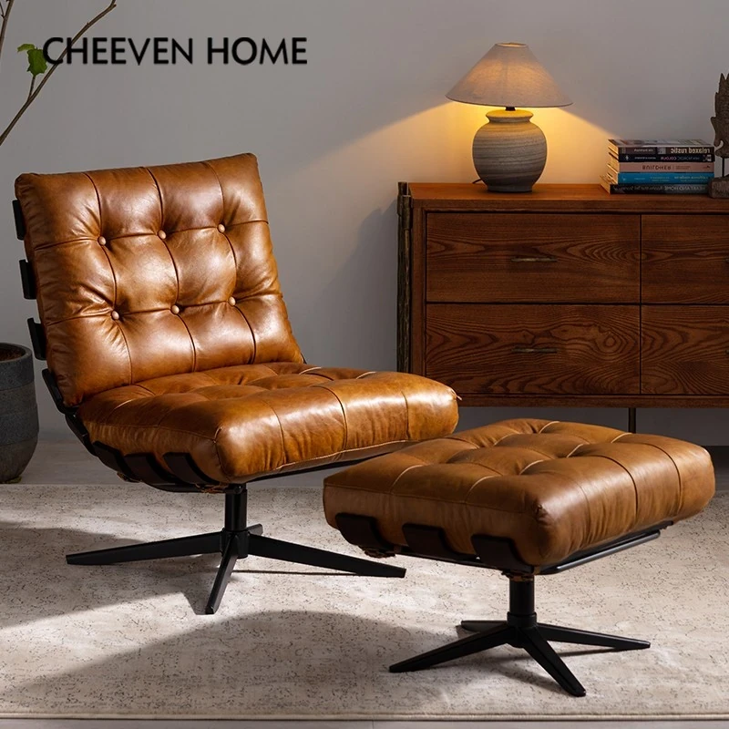 本革製シングルソファチェア|リビング・バルコニーに最適なレトロデザインのリラックスチェア|快適な足置き付き|スタイリッシュで洗練されたグリッドパターンで、あなたの空間を一層引き立てます!