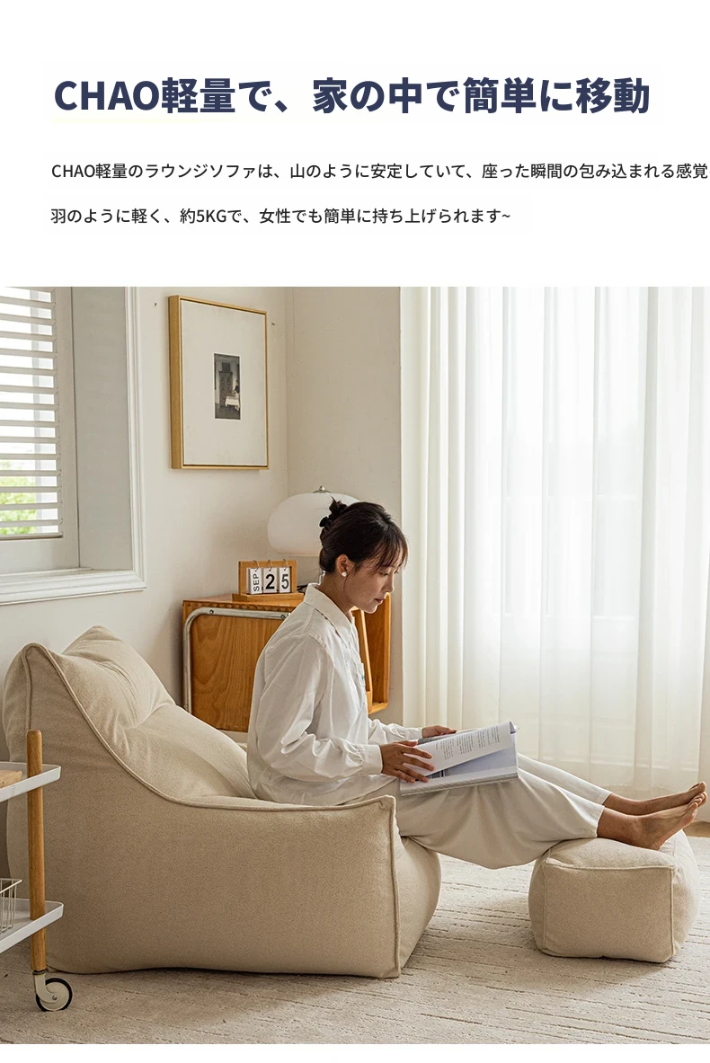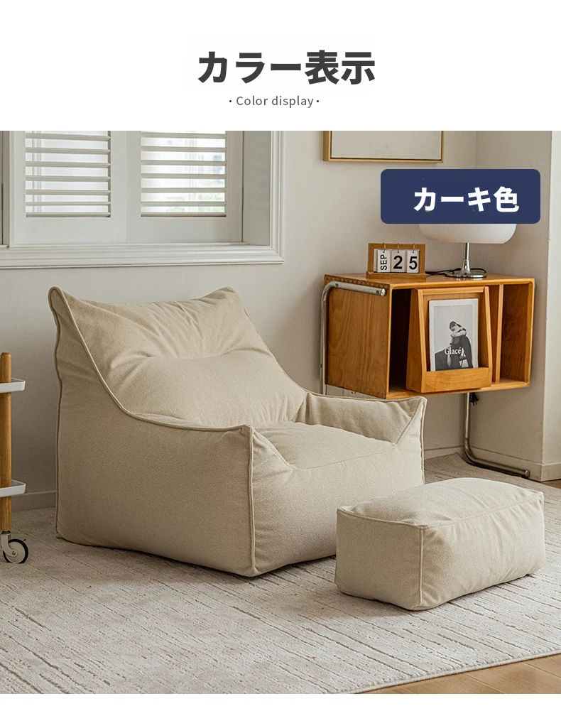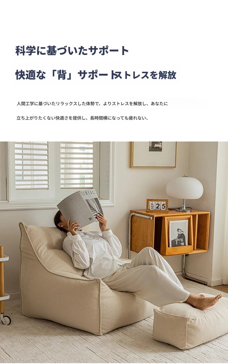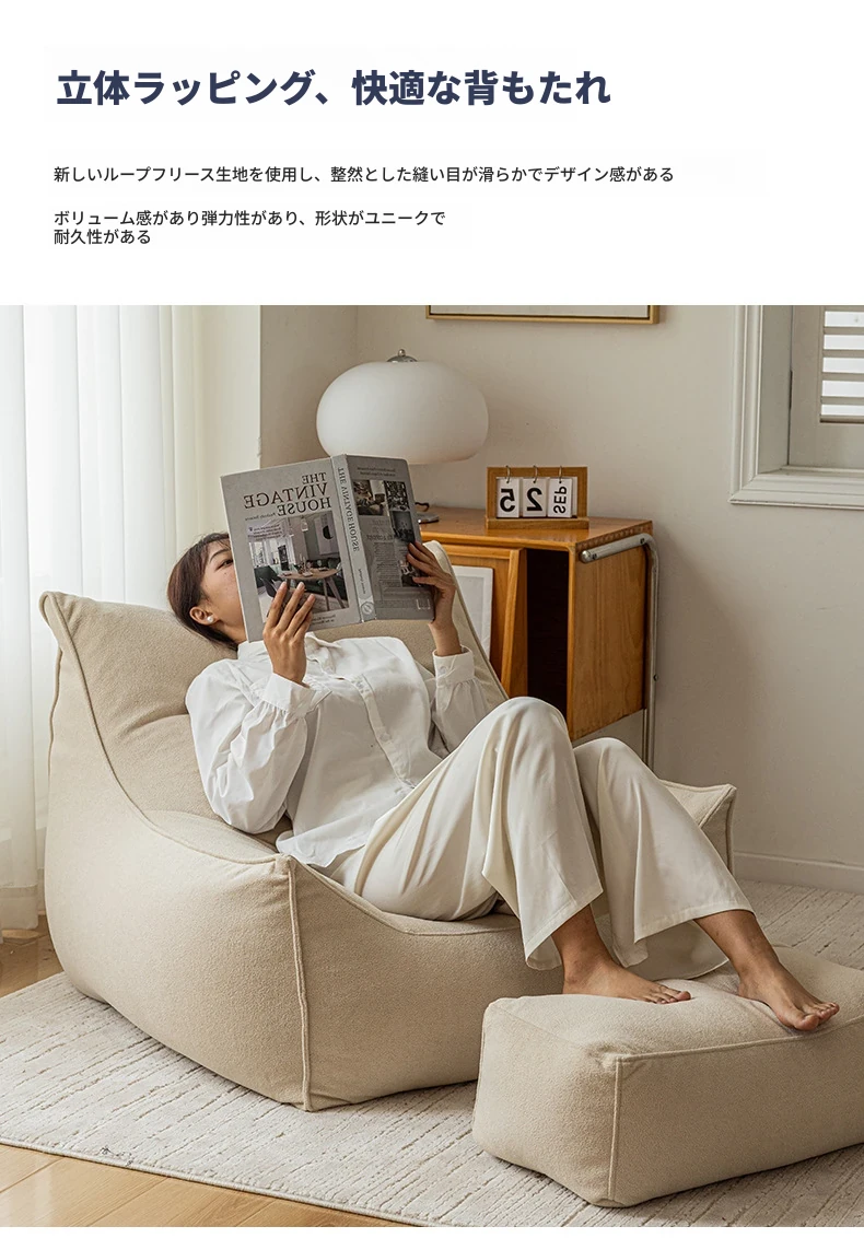 くつろぎのリクライニングソファチェア!寝転んでも快適な豆袋ソファ、リビングやバルコニーにぴったり。長時間座っても疲れない、あなたの特別な一人用ソファ。