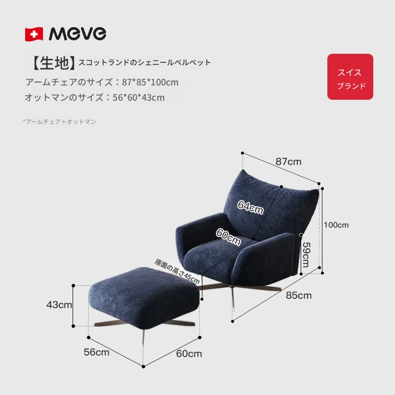 青色の単椅子+足置き-50DスポンジMDI【スコットランド輸入シェニールベルベット】