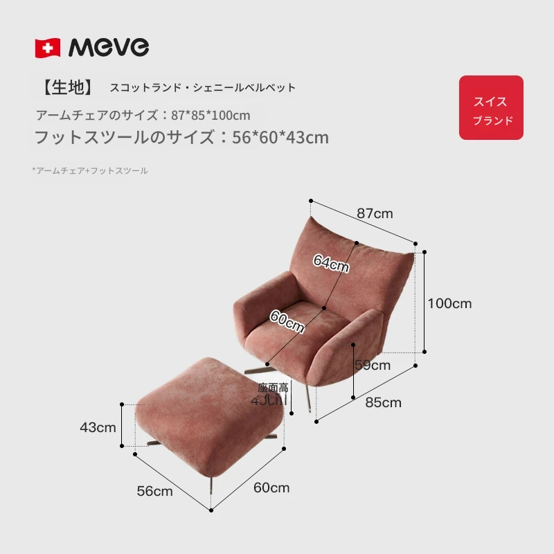 ピンクの単椅子+足置き-50DスポンジMDI【スコットランド輸入シェニールベルベット】