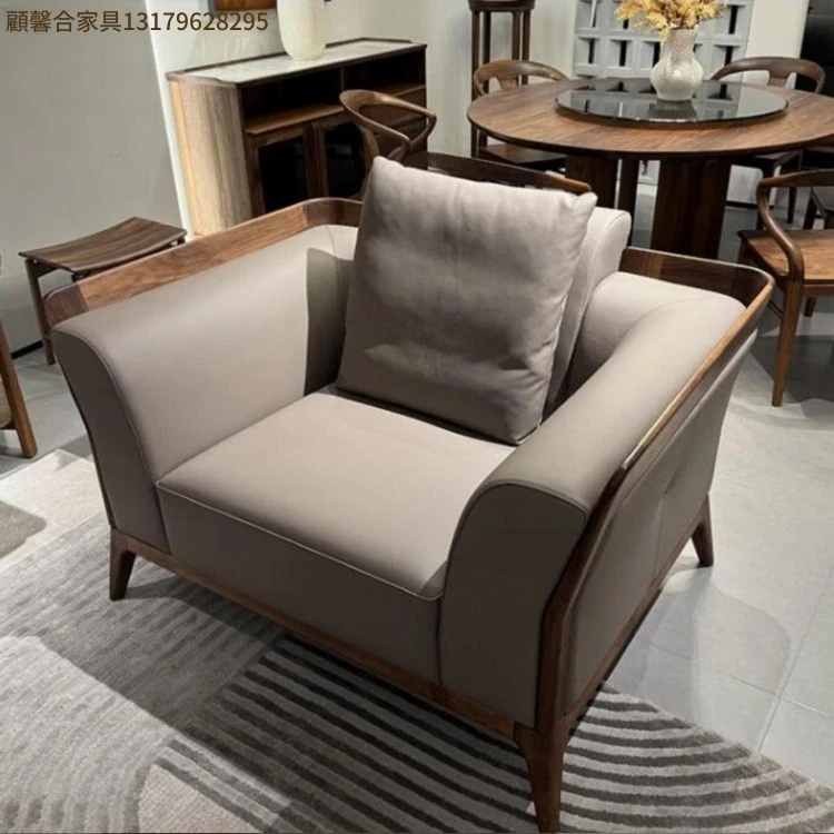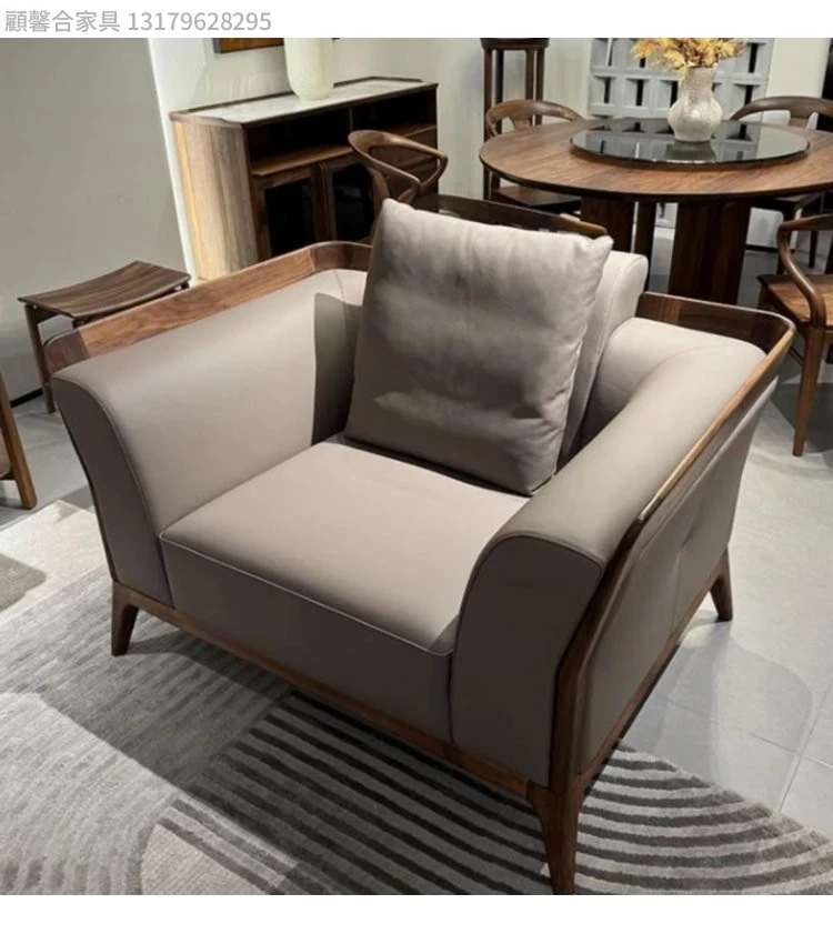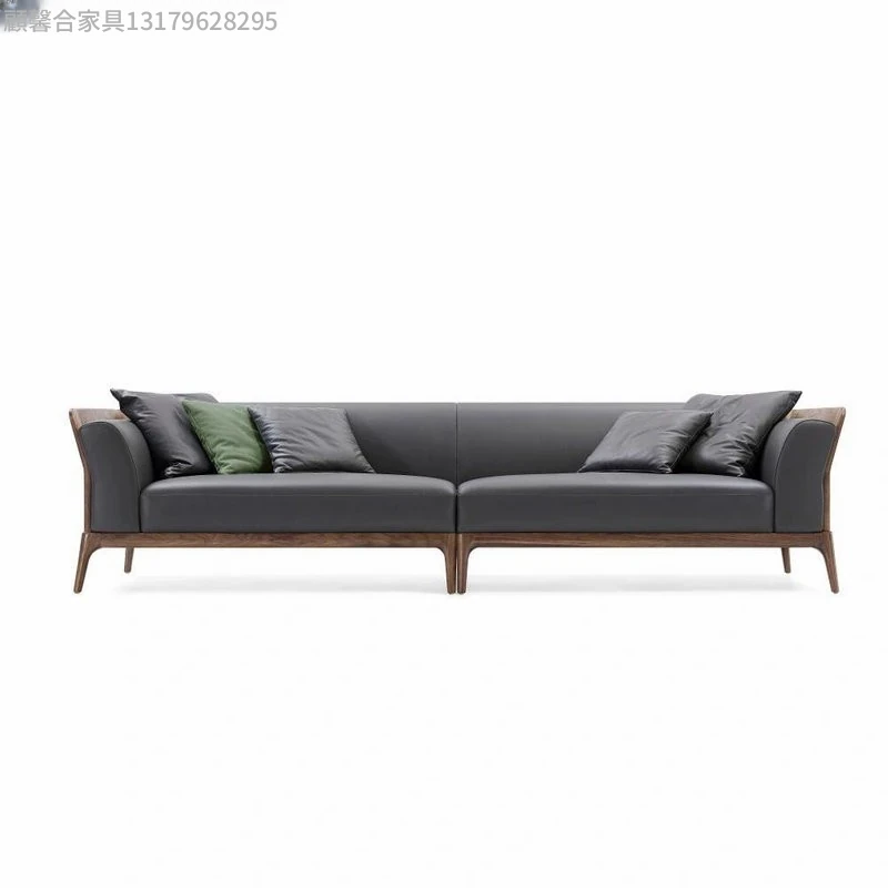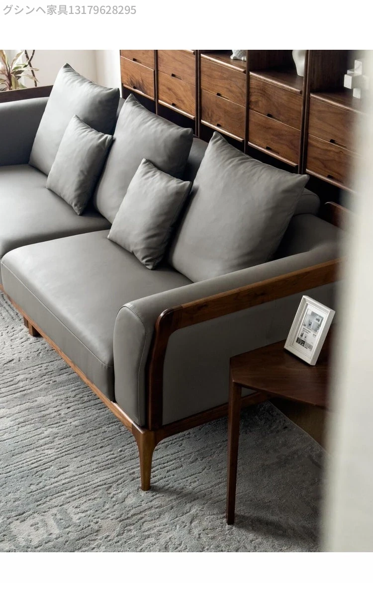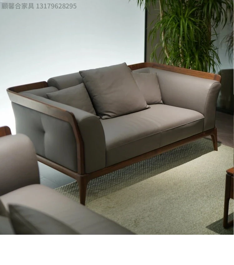 新中式デザインのブラックウォールナットソファ - シンプルで洗練されたイタリアンスタイル、軽やかなラグジュアリーを実現!本物のレザー使用で、小型住宅にもぴったりの洗練された直線美をお楽しみください。
