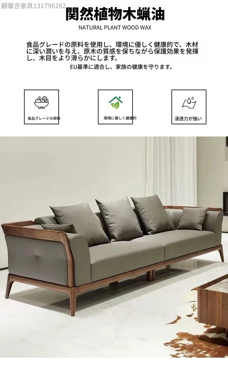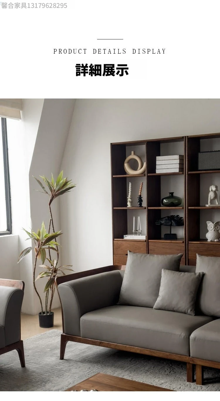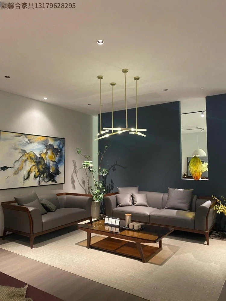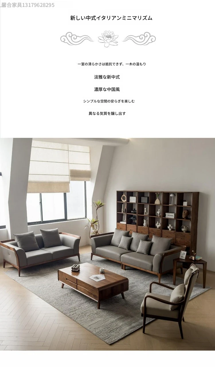 新中式デザインのブラックウォールナットソファ - シンプルで洗練されたイタリアンスタイル、軽やかなラグジュアリーを実現!本物のレザー使用で、小型住宅にもぴったりの洗練された直線美をお楽しみください。
