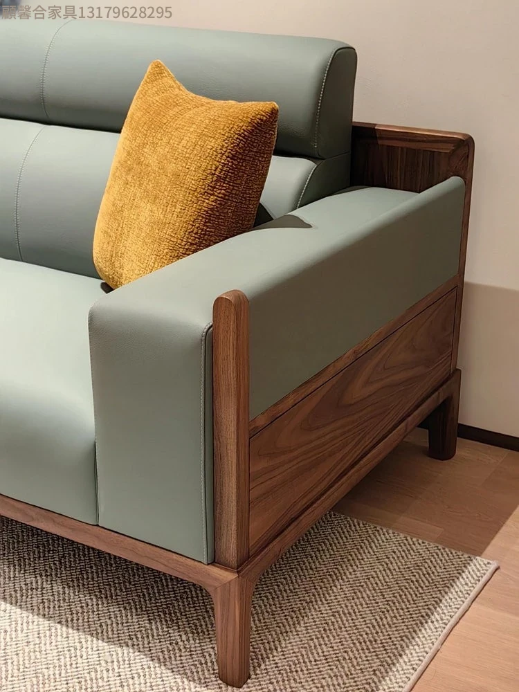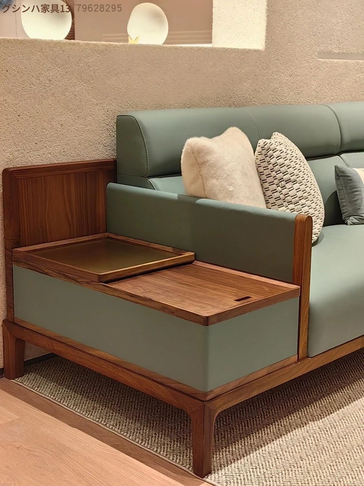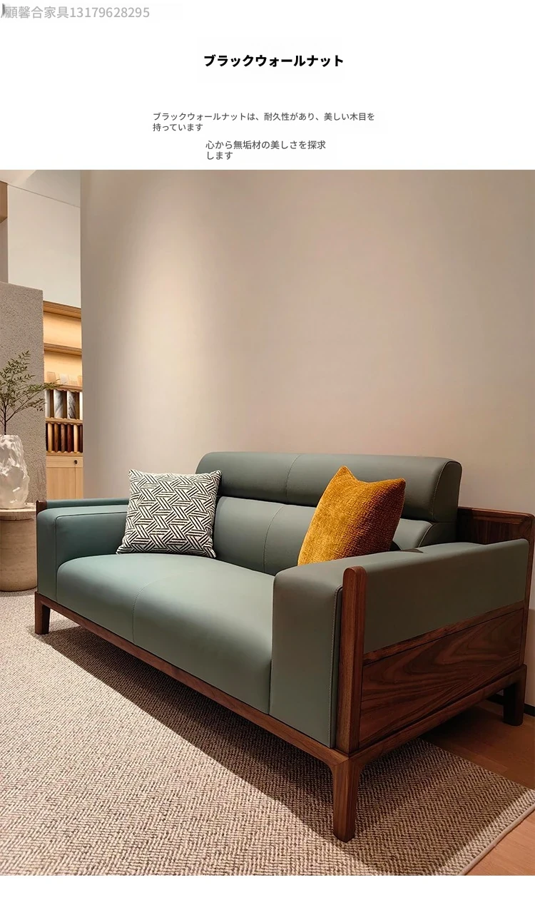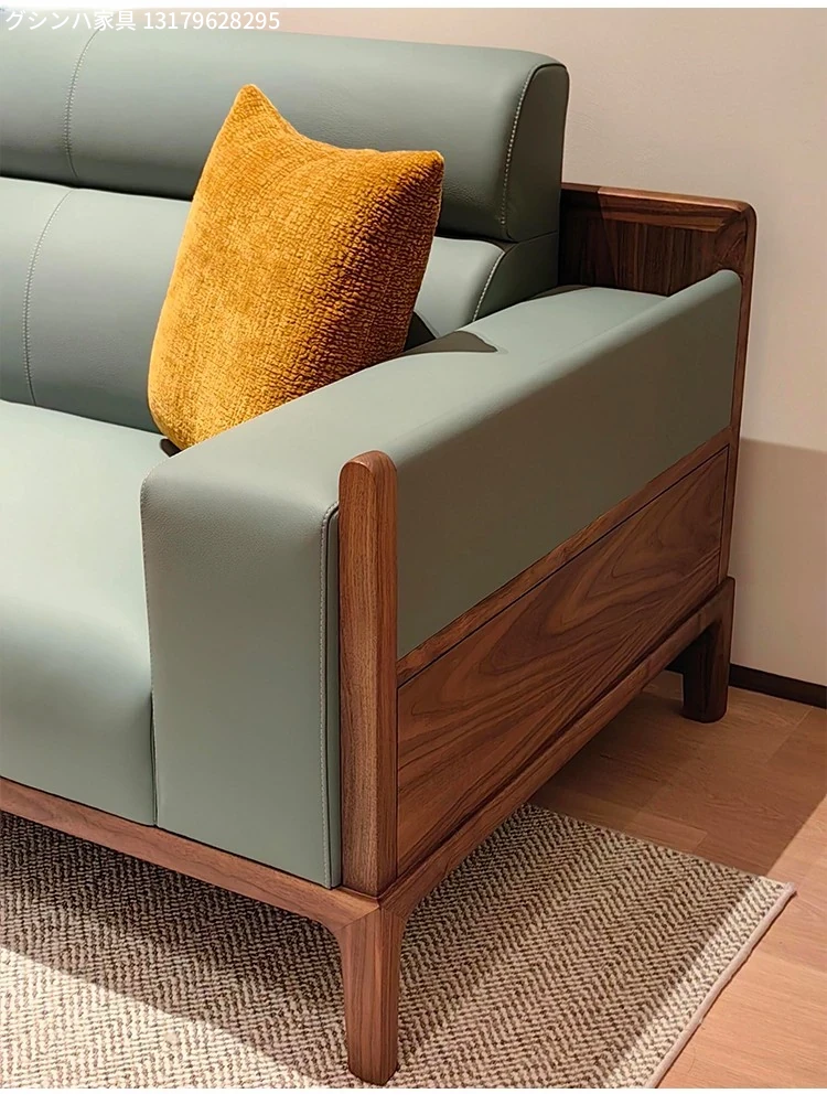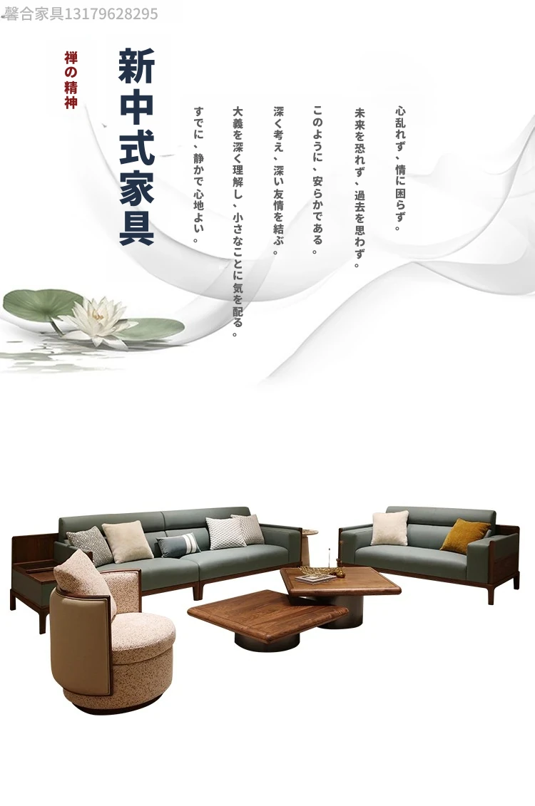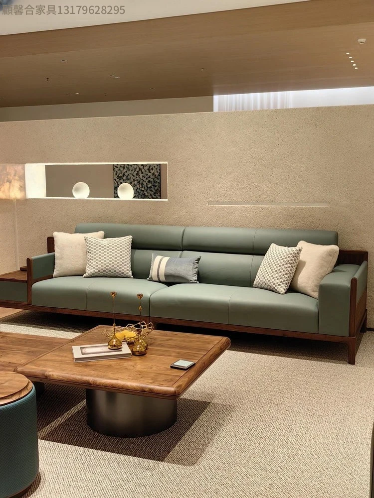 新中式デザインの無垢材ソファセット - ブラックウォールナット製、モダンでシンプルな直線美を追求した小型リビング向け。禅の心を感じる本革ソファで、心地よいくつろぎの空間を演出します。