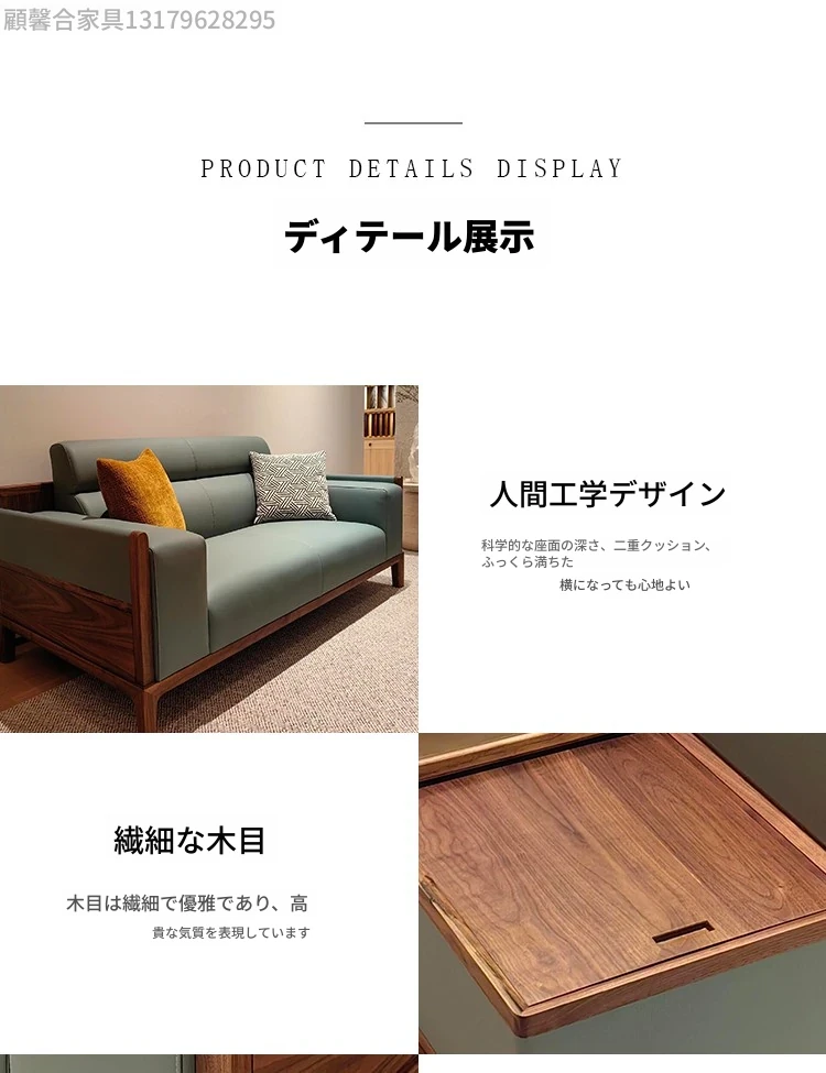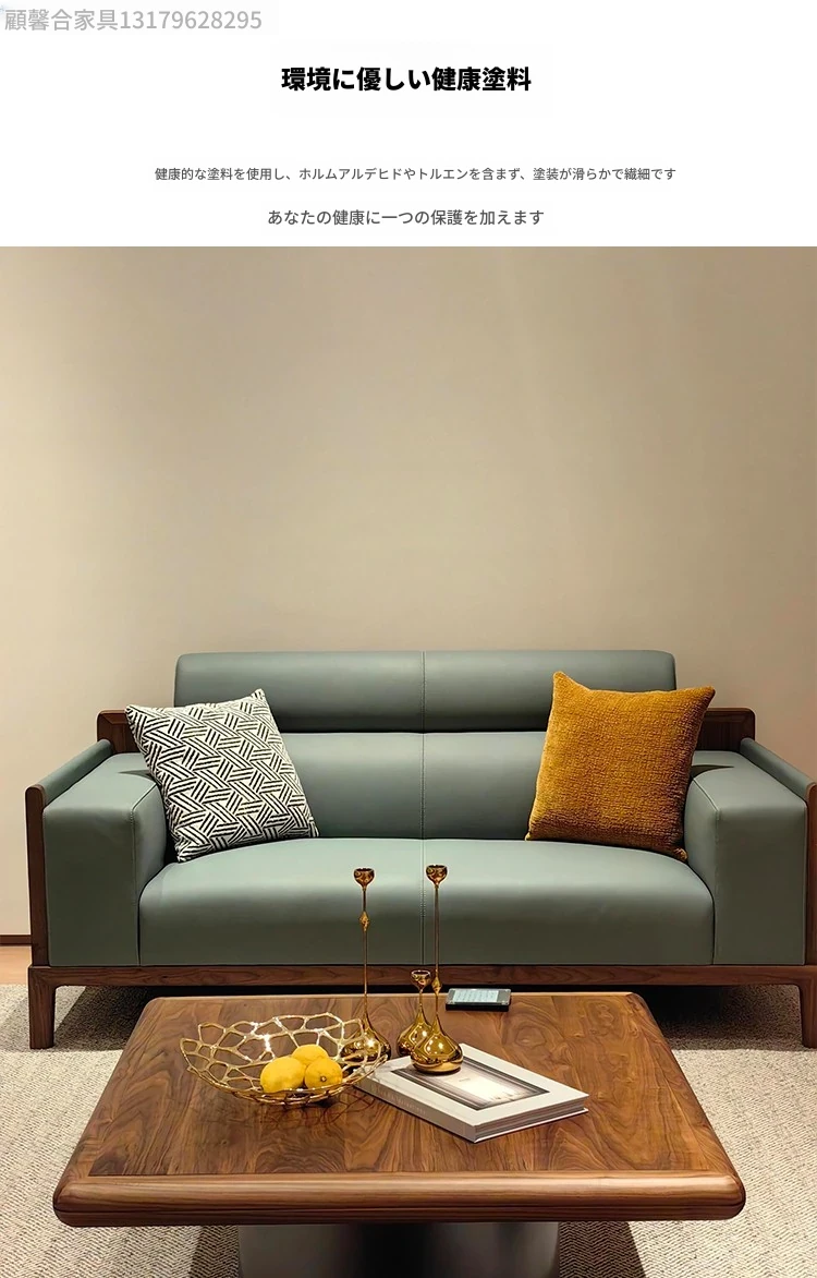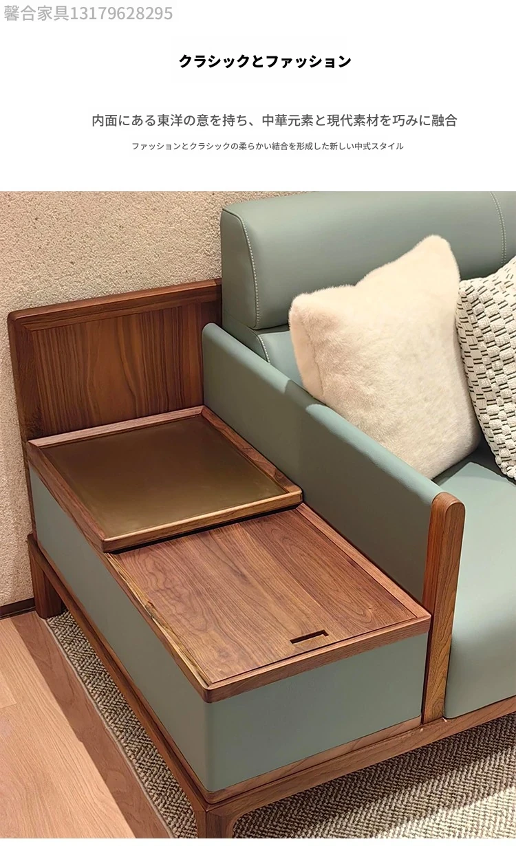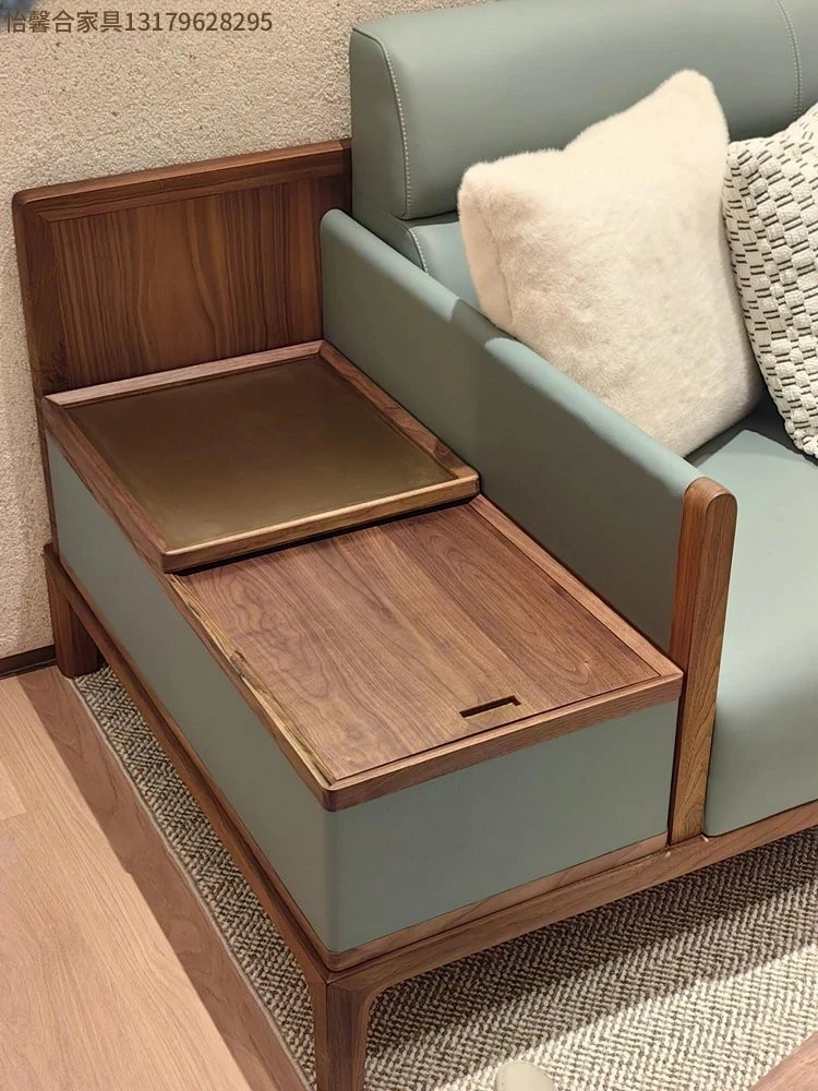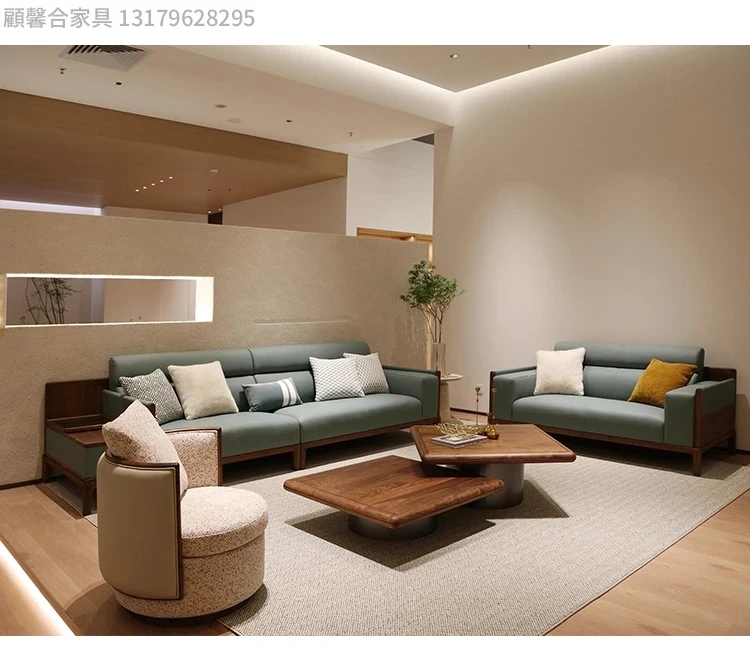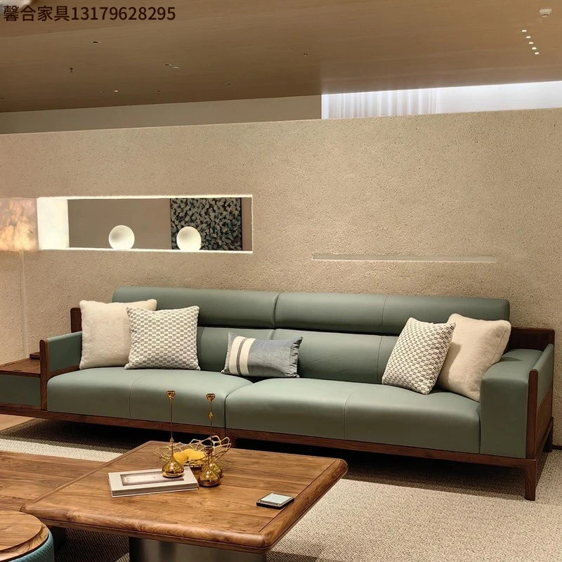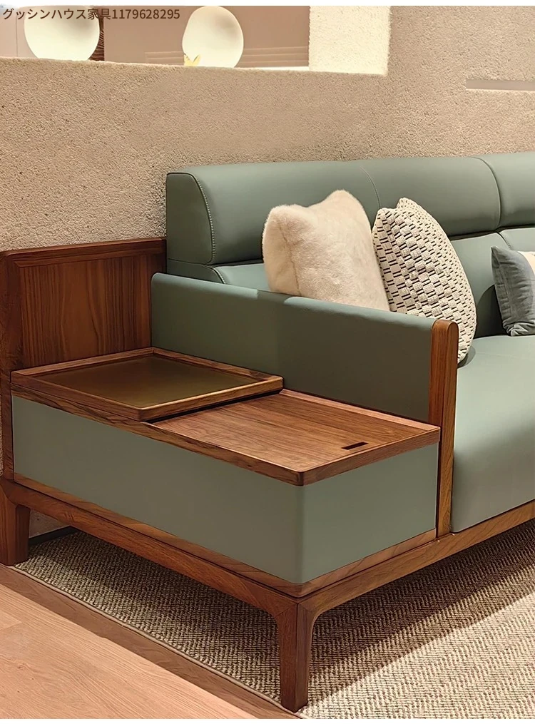 新中式デザインの無垢材ソファセット - ブラックウォールナット製、モダンでシンプルな直線美を追求した小型リビング向け。禅の心を感じる本革ソファで、心地よいくつろぎの空間を演出します。