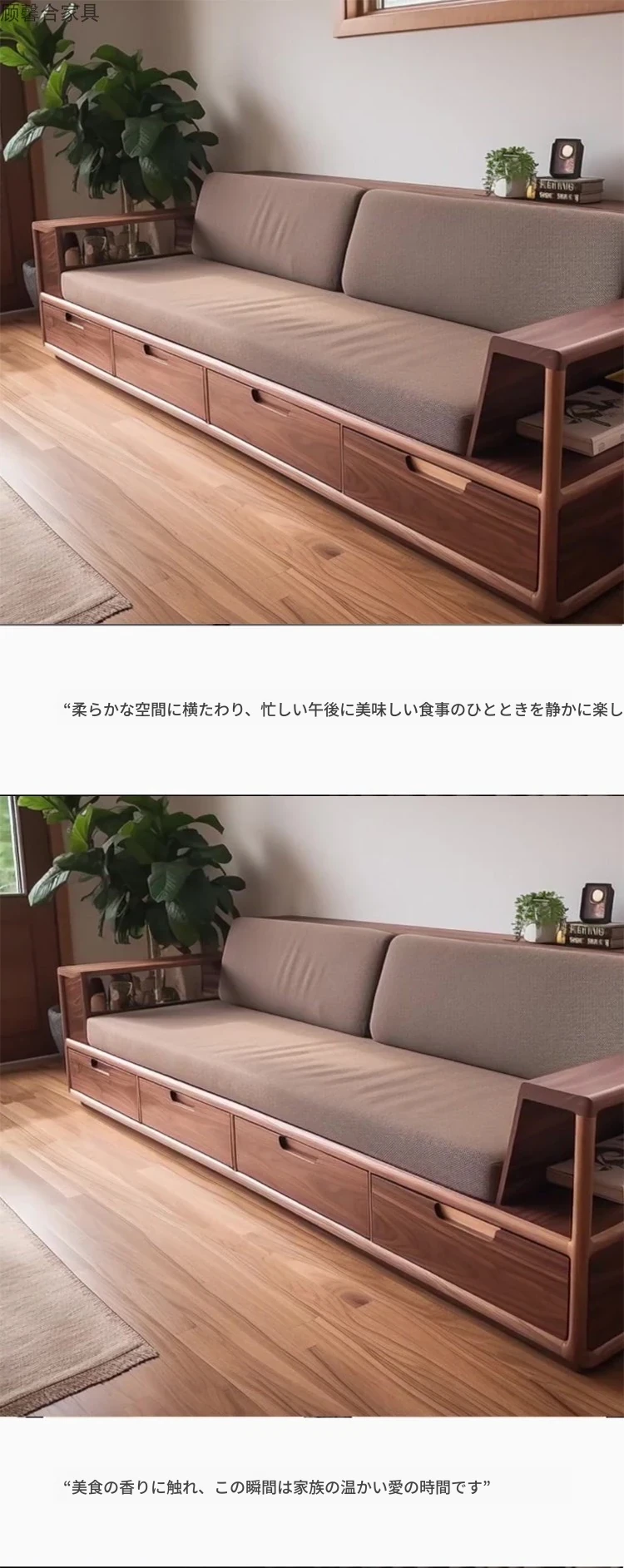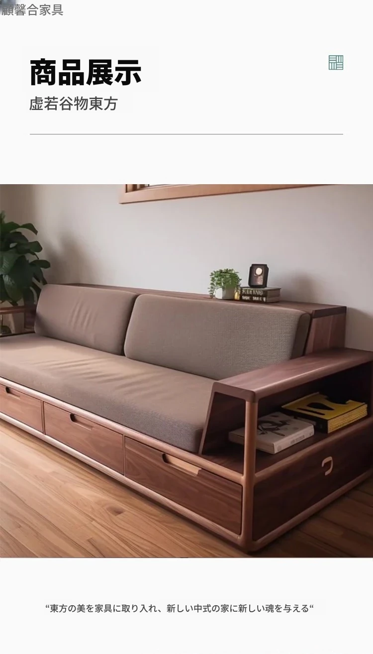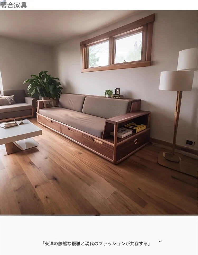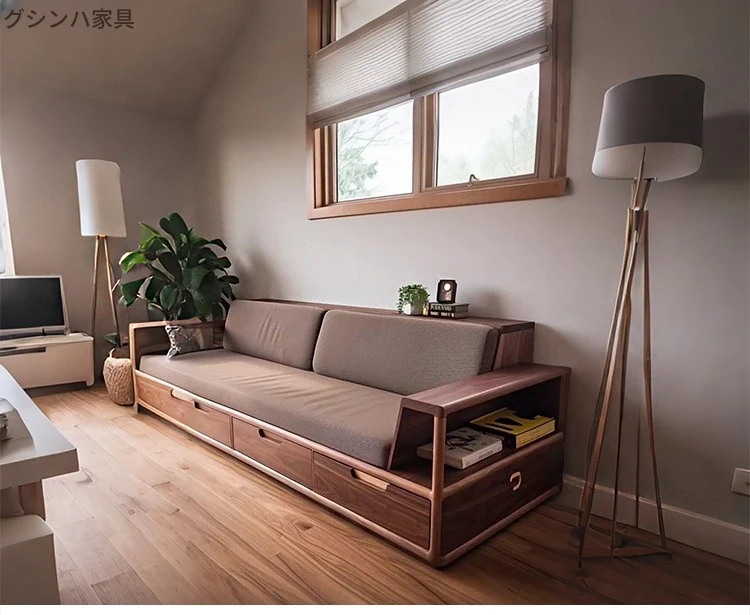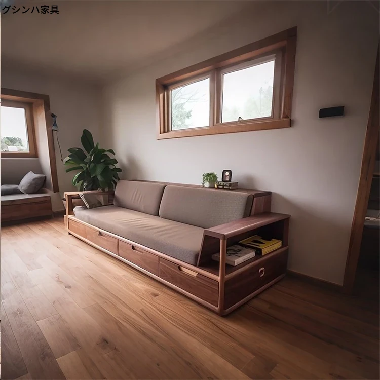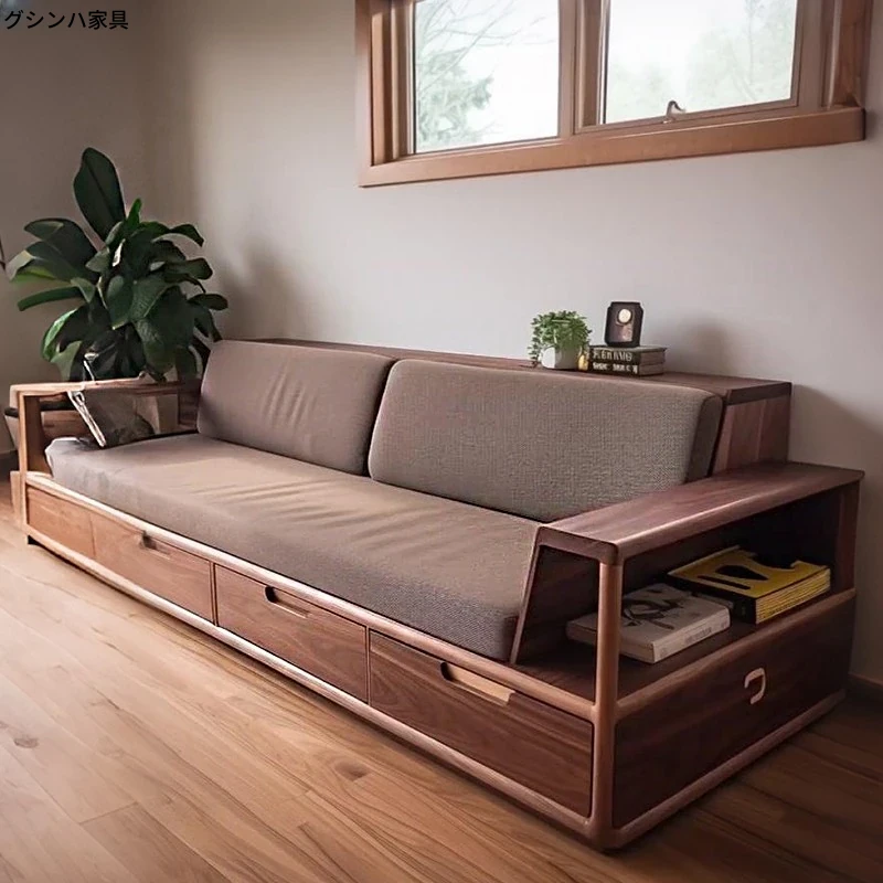 2025年新作!モダンでシンプルなリビングソファ - 高級感漂う北米産ブラックウォールナット無垢材使用、引き出し付きで収納も便利!
