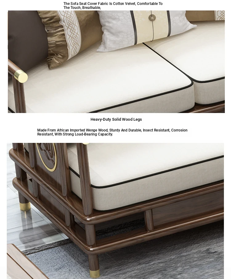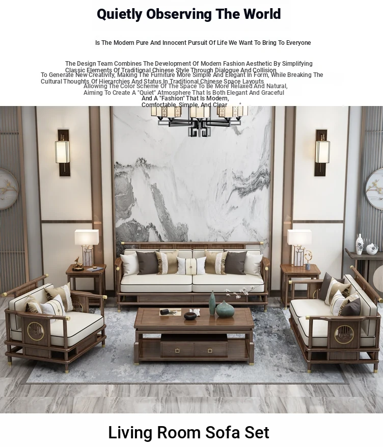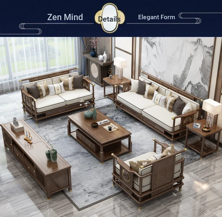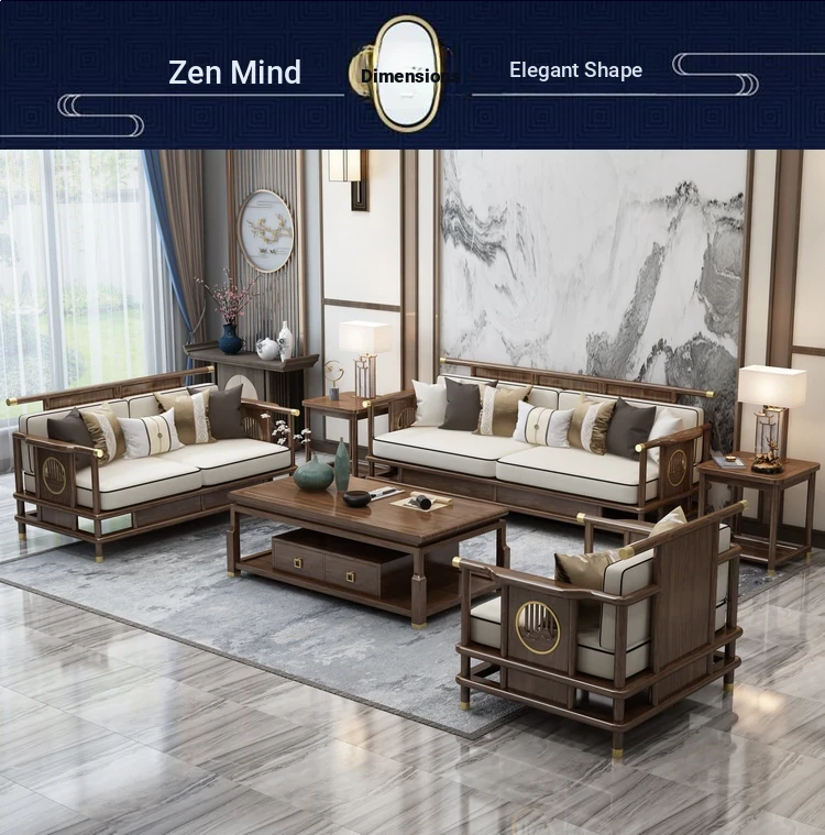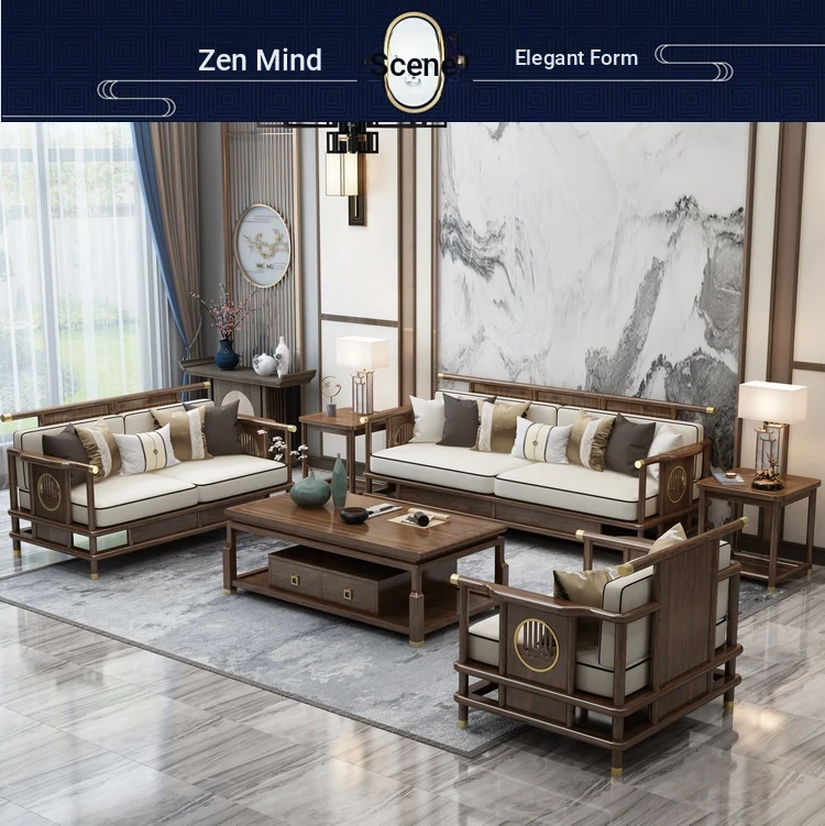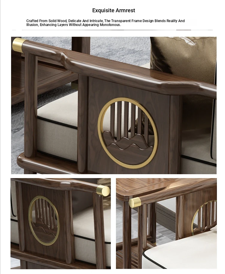Modern Minimalist Zen-Style Sofa Set in Black Gold Wood - Luxurious Solid Wood and Fabric Furniture for Villas and Home Decor, Available for Immediate Purchase