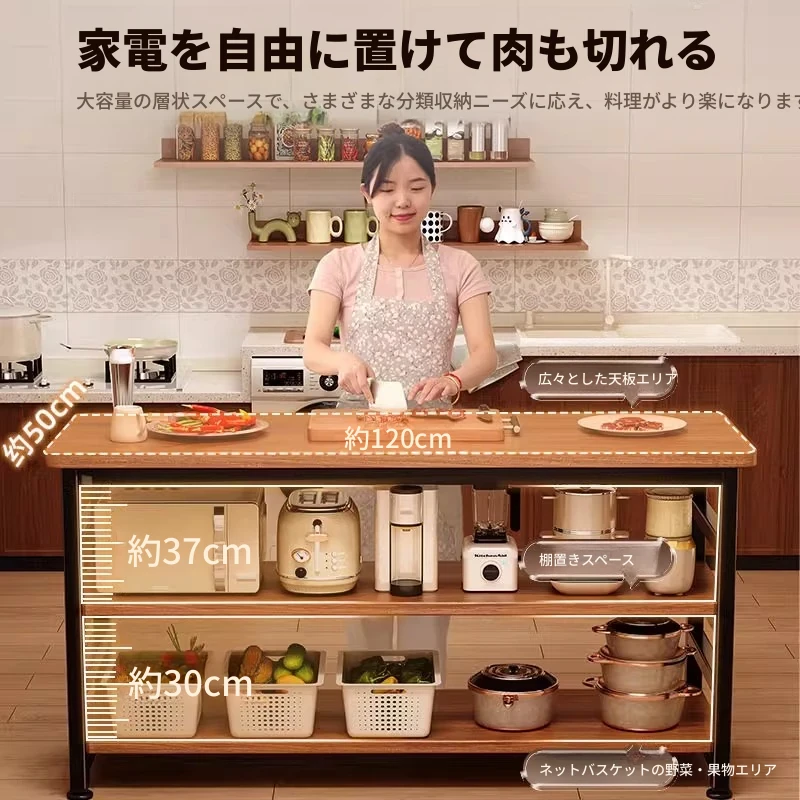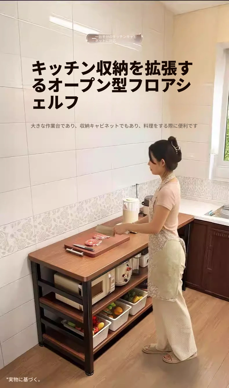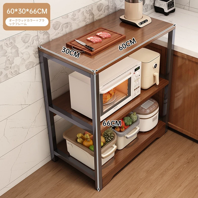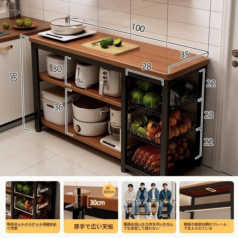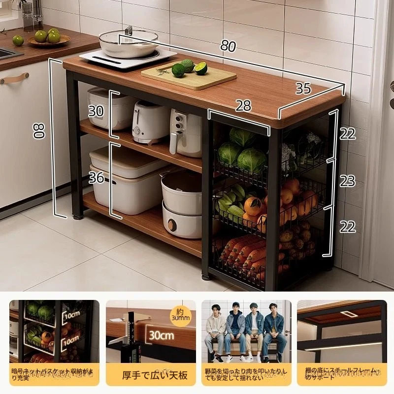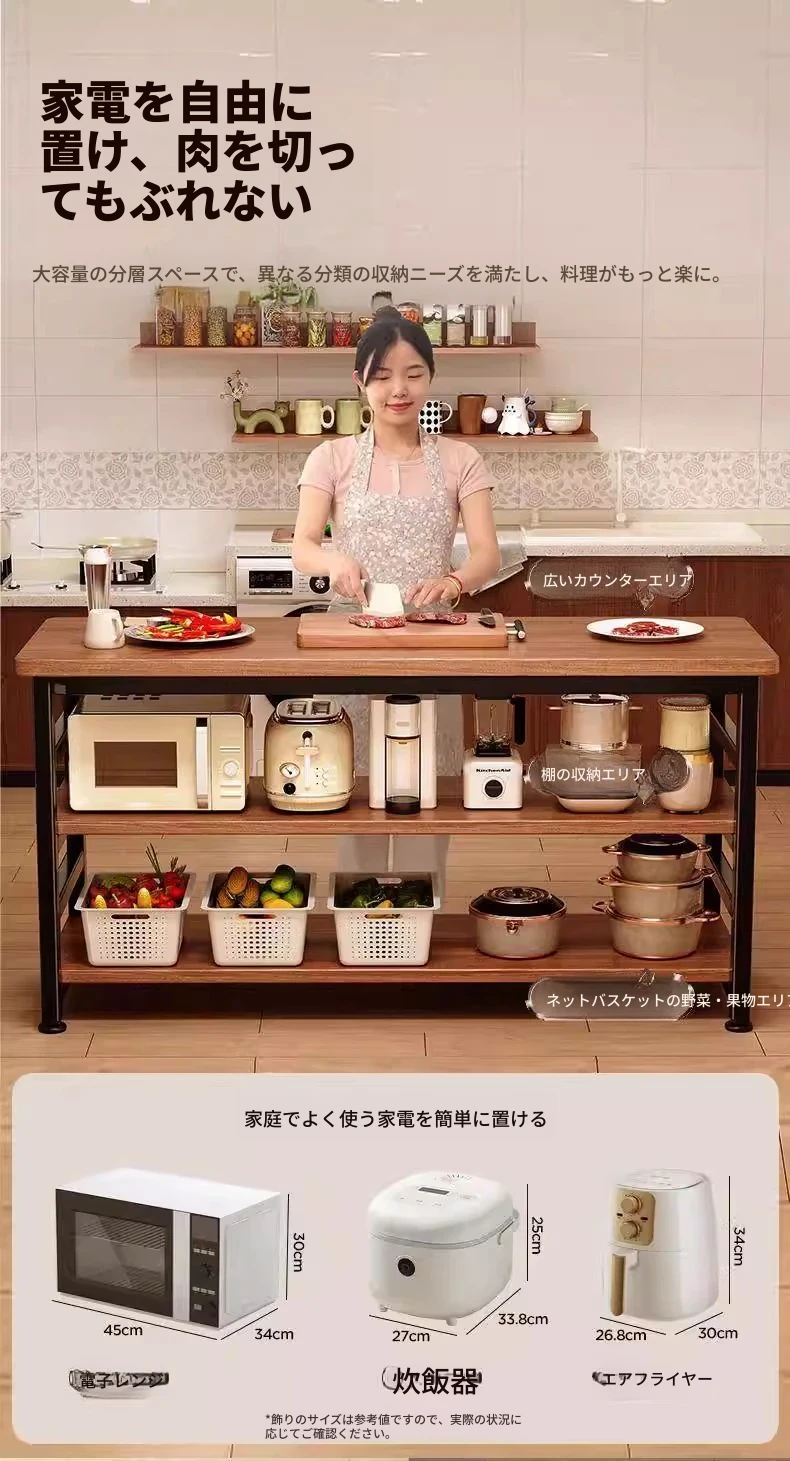 多機能キッチンラック!野菜カゴ&カッティングボード、電子レンジや鍋の収納もできる便利なサイドキャビネット。スペースを有効活用し、料理をもっと楽しく!