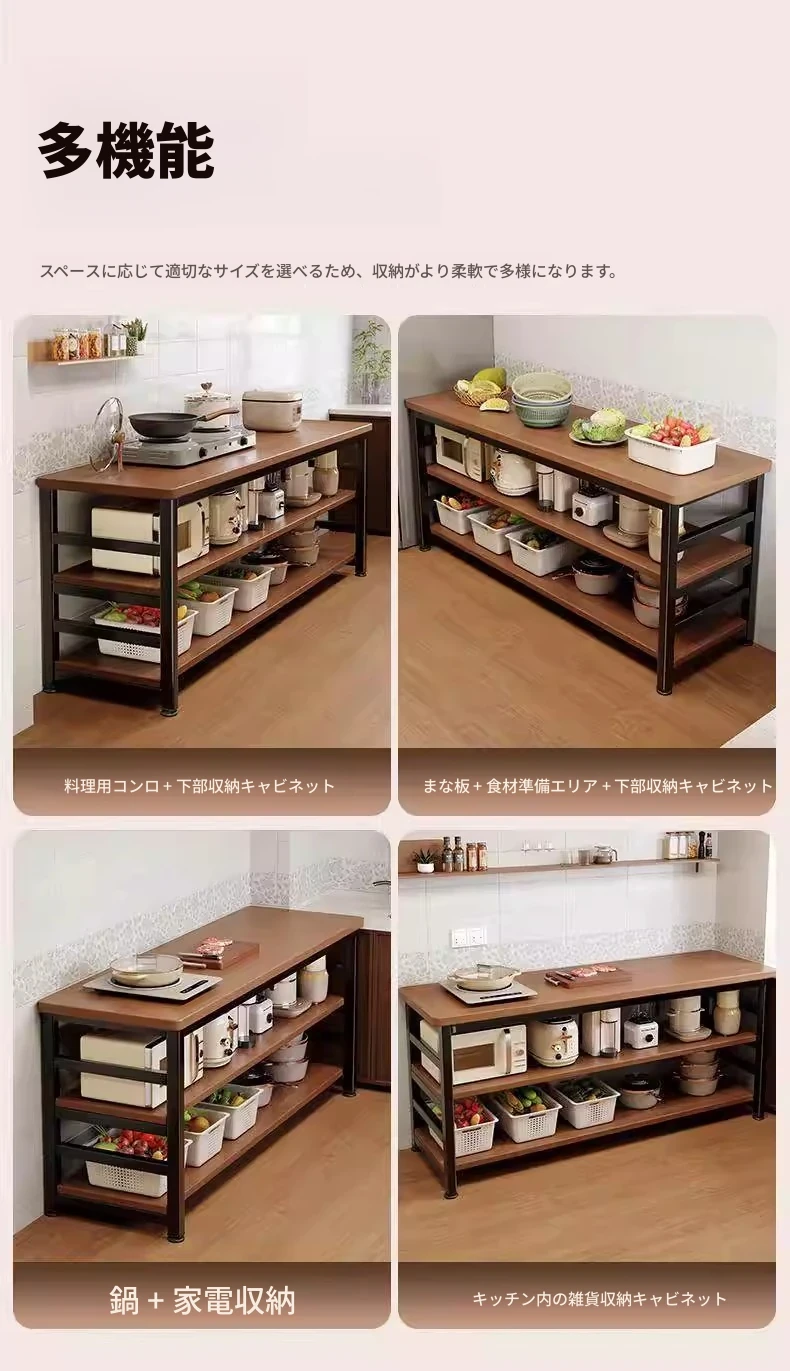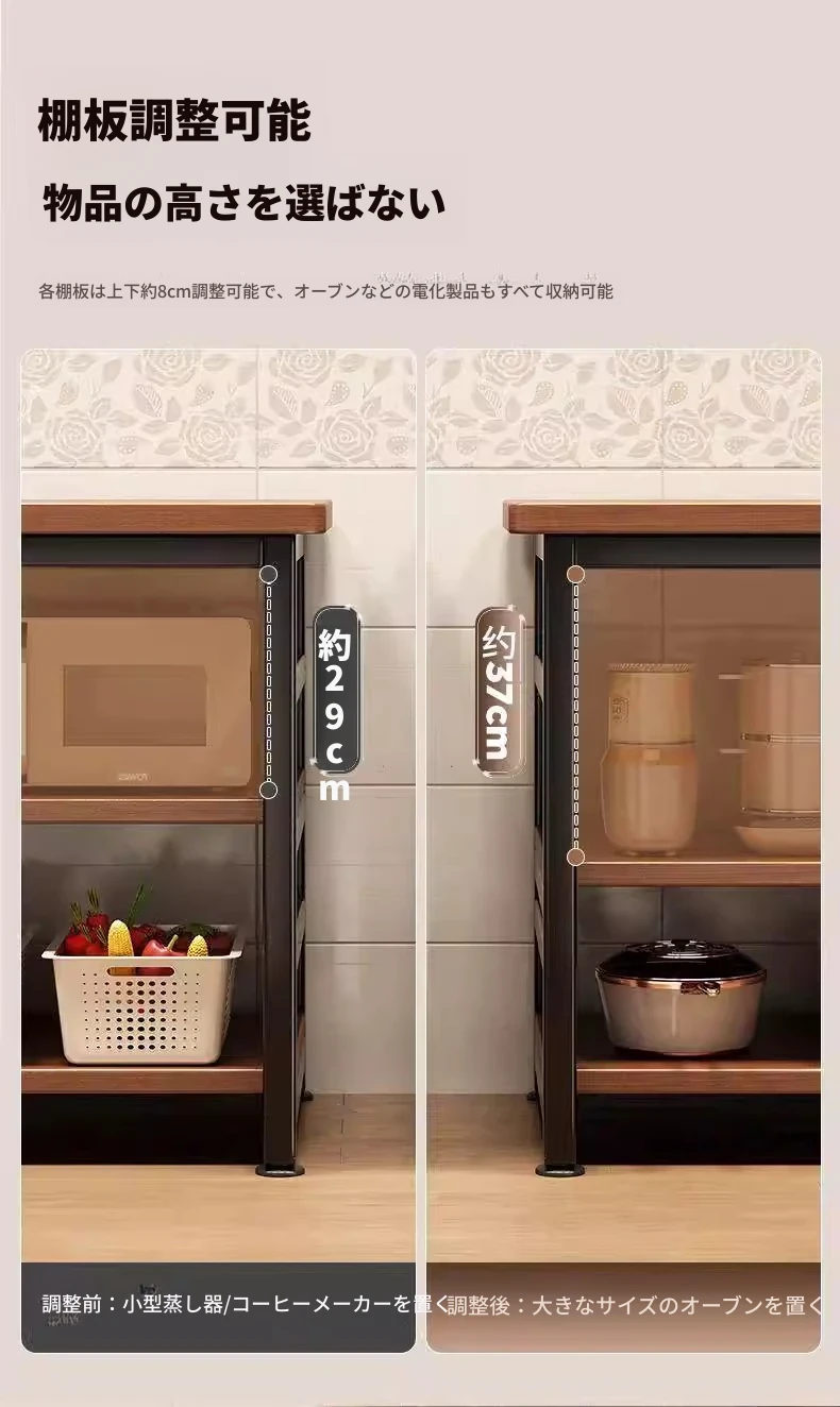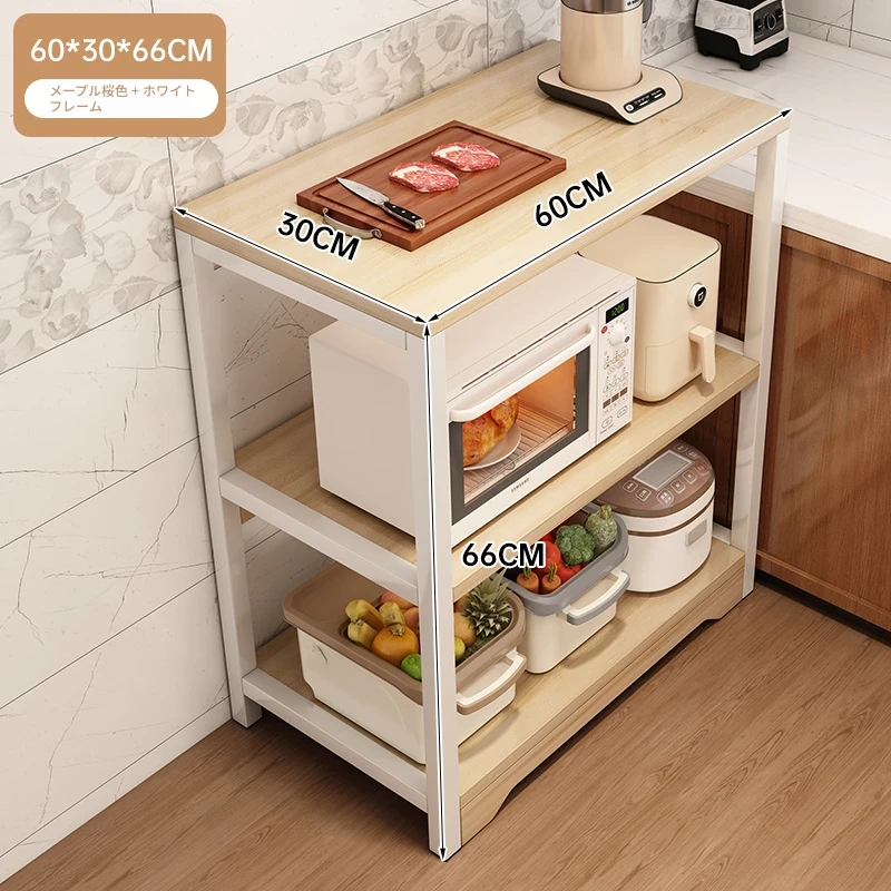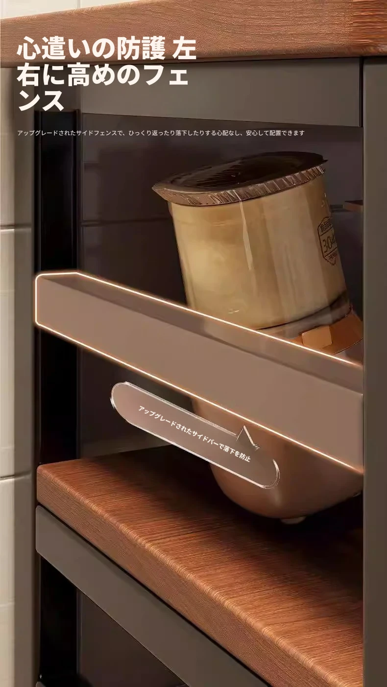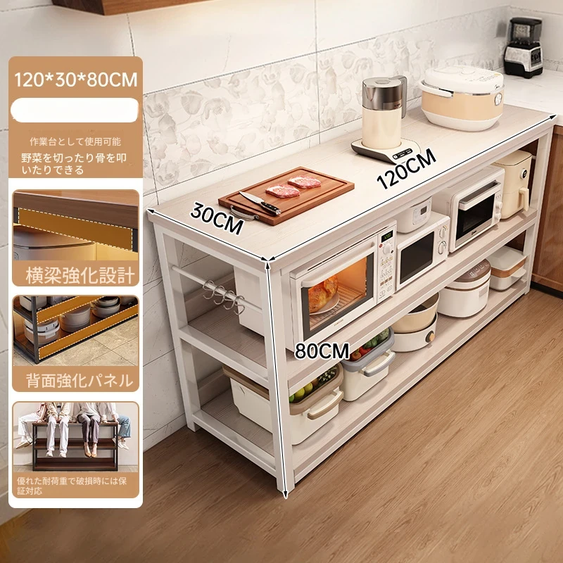 多機能キッチンラック!野菜カゴ&カッティングボード、電子レンジや鍋の収納もできる便利なサイドキャビネット。スペースを有効活用し、料理をもっと楽しく!