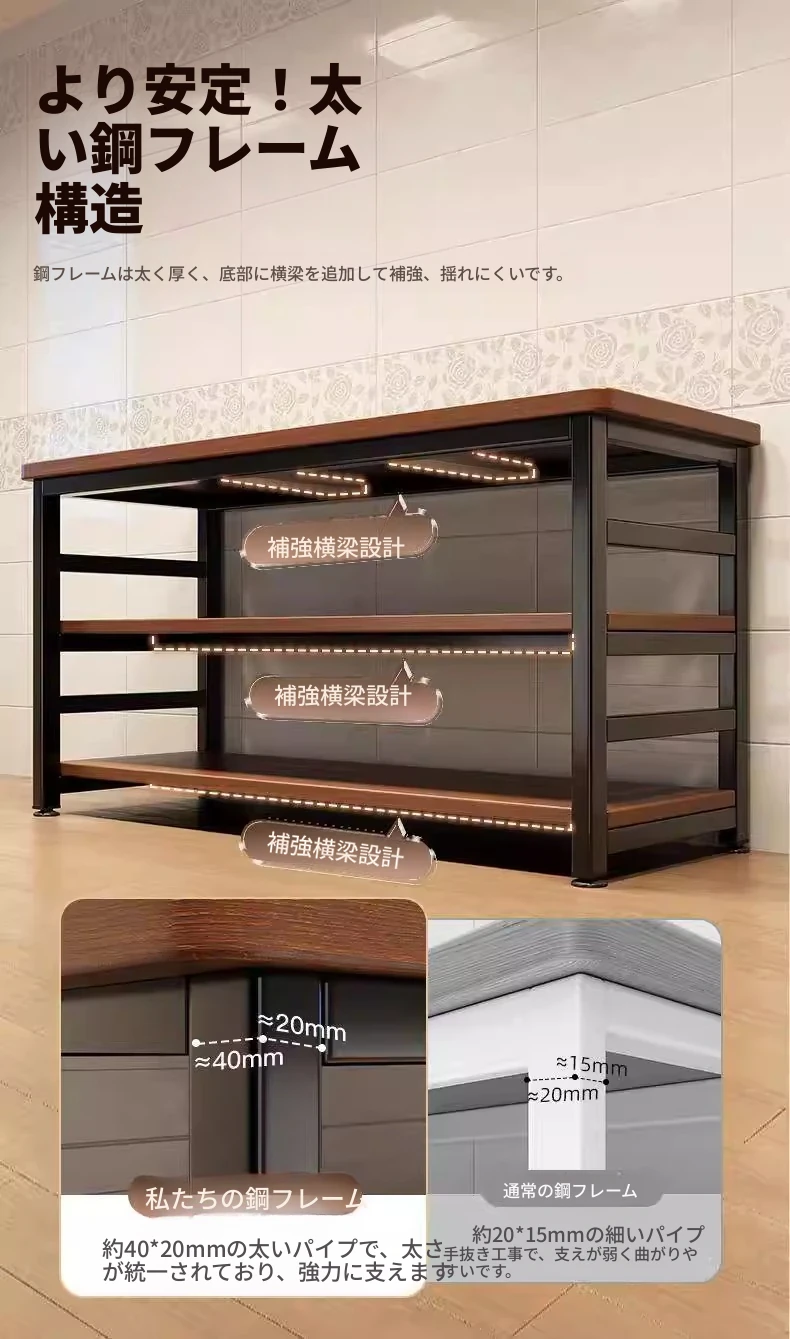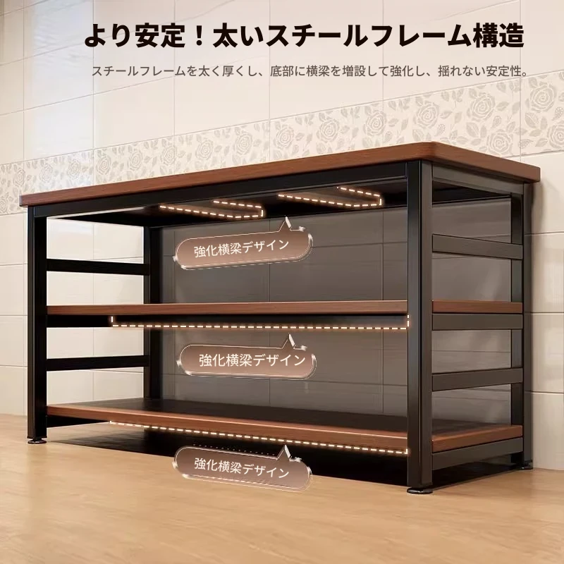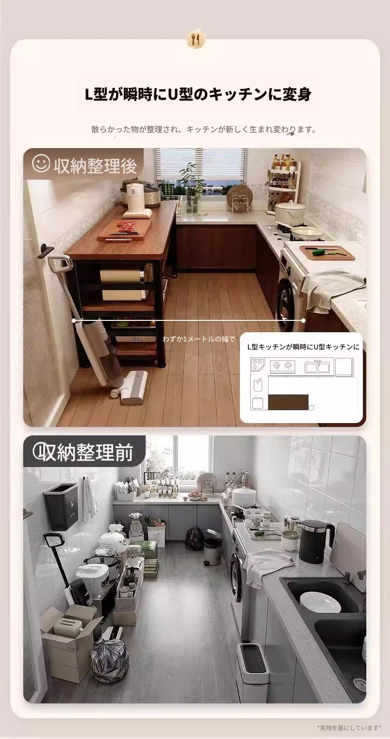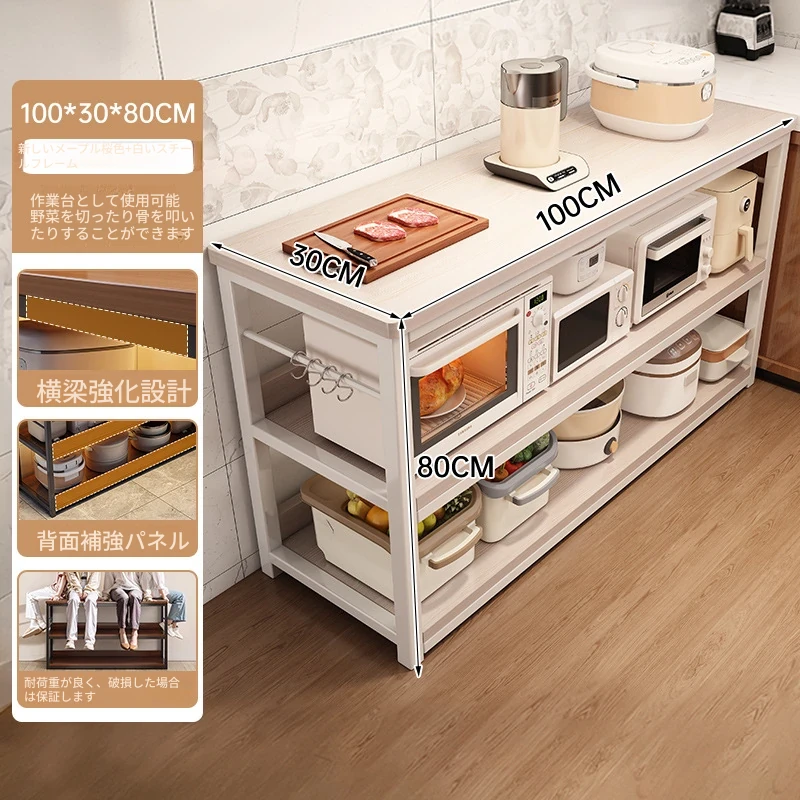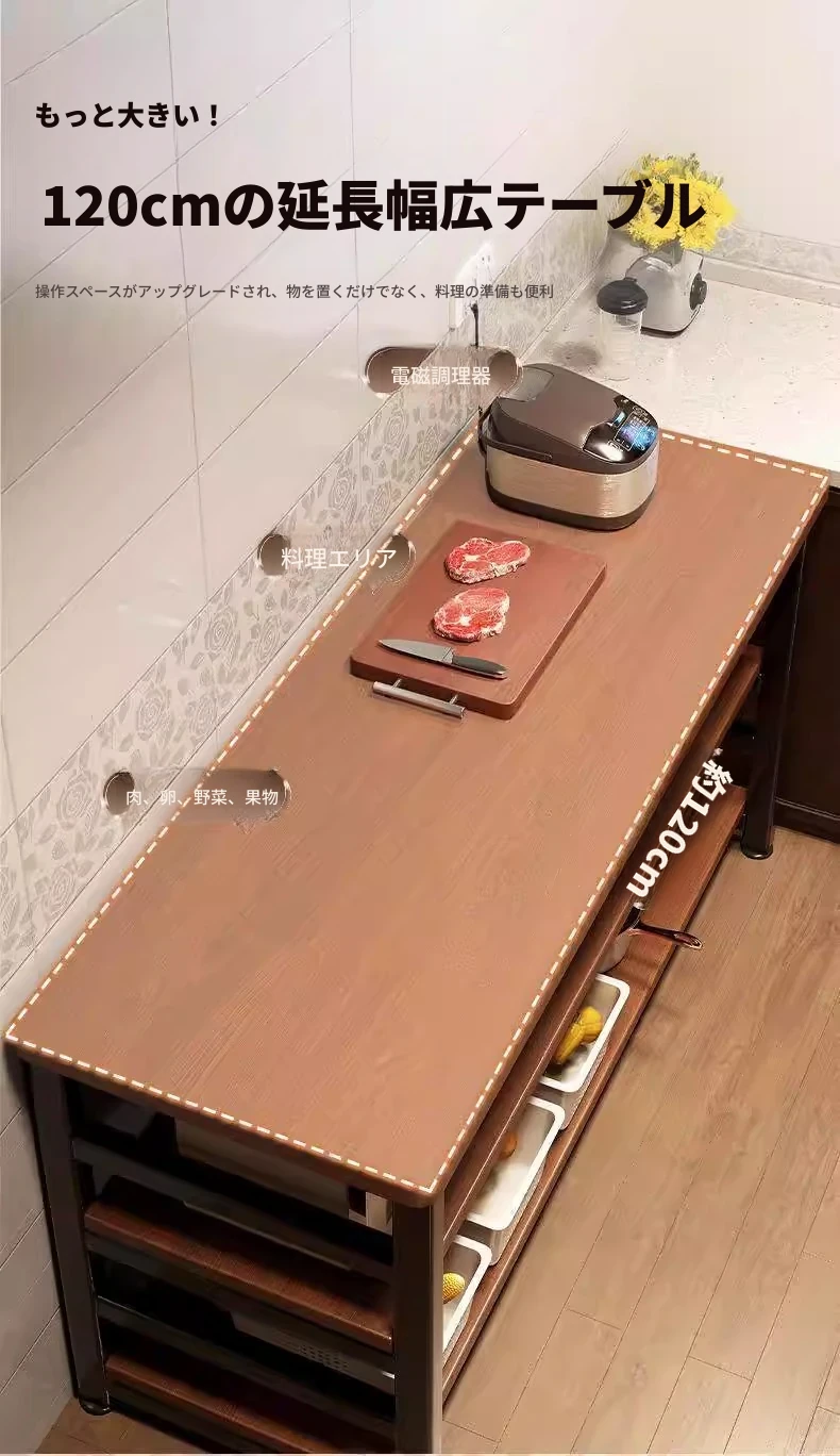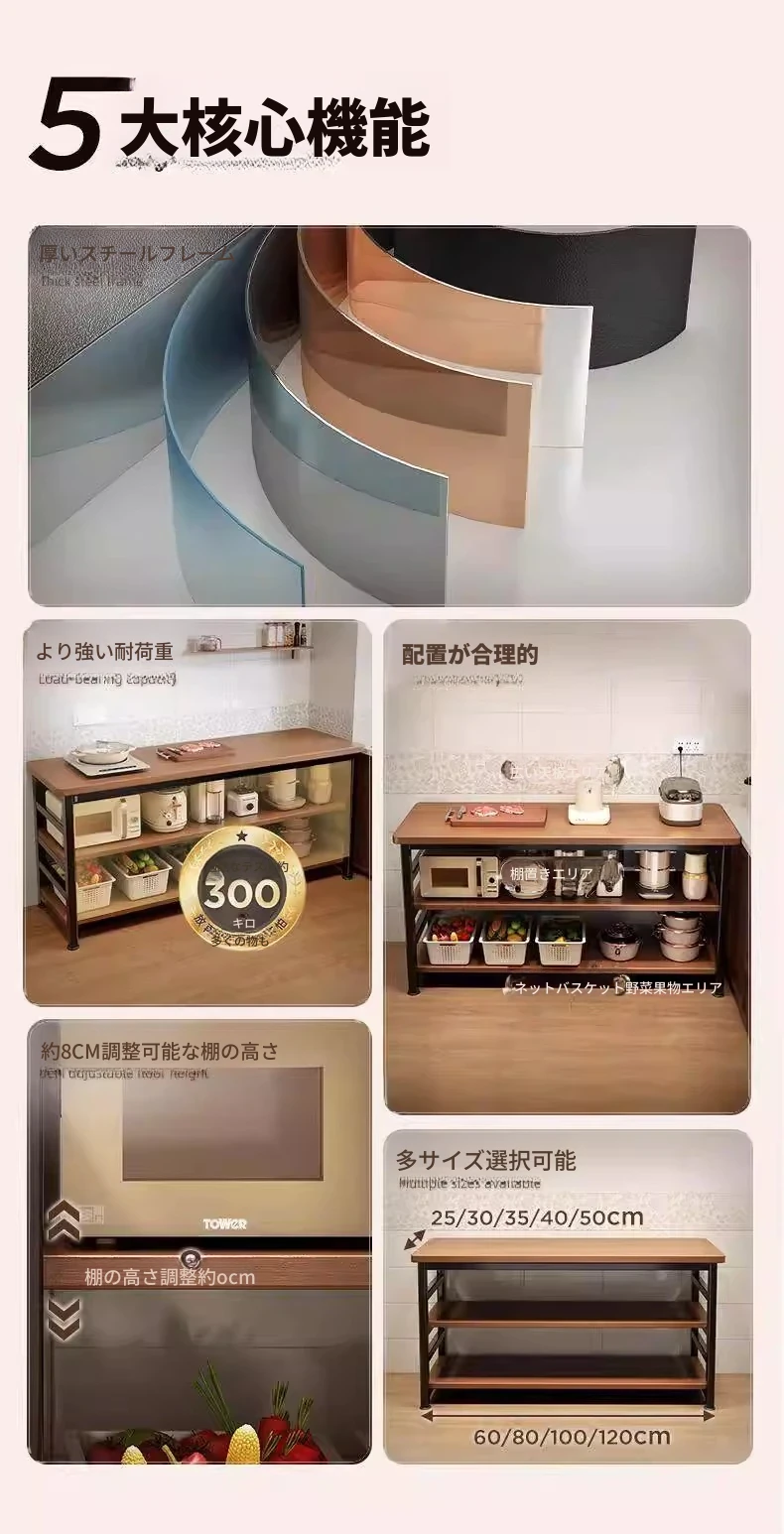 多機能キッチンラック!野菜カゴ&カッティングボード、電子レンジや鍋の収納もできる便利なサイドキャビネット。スペースを有効活用し、料理をもっと楽しく!