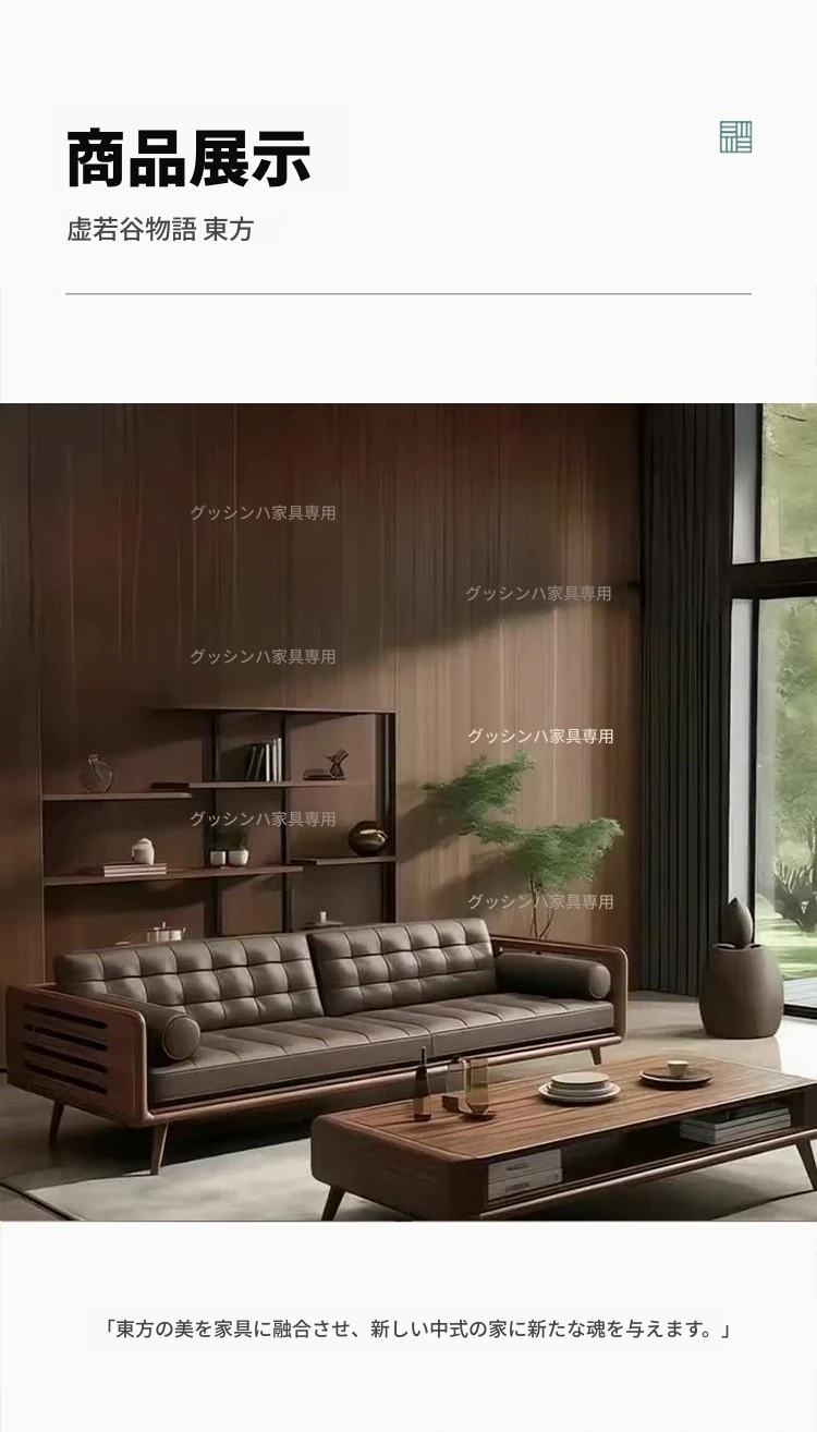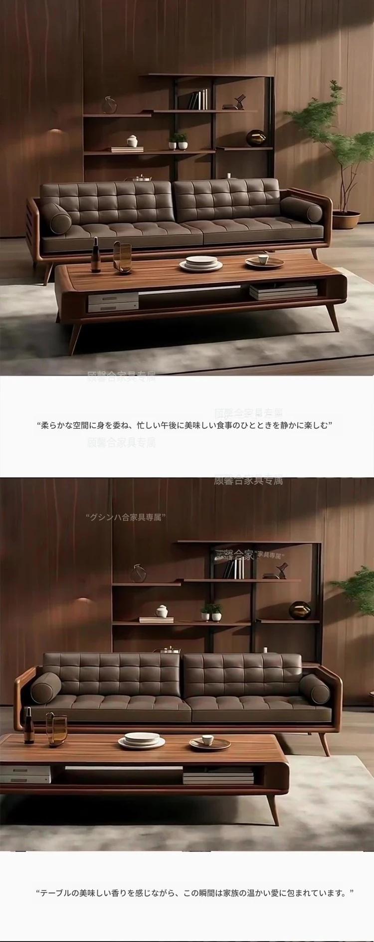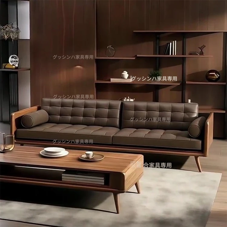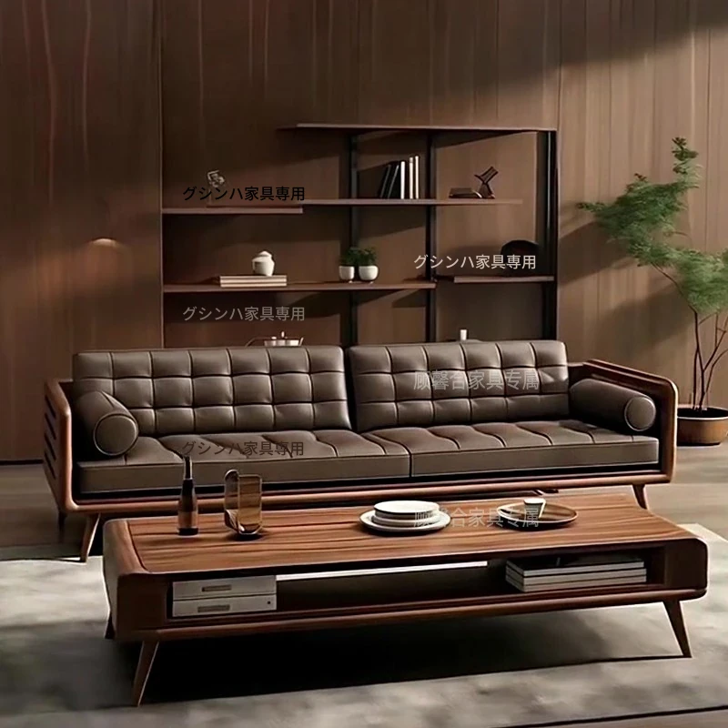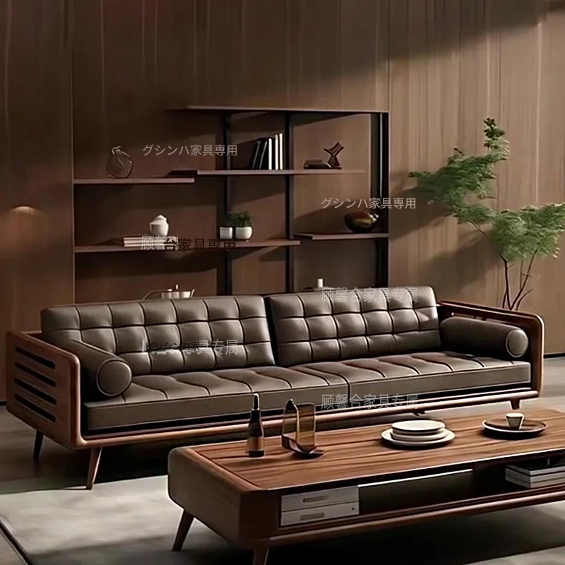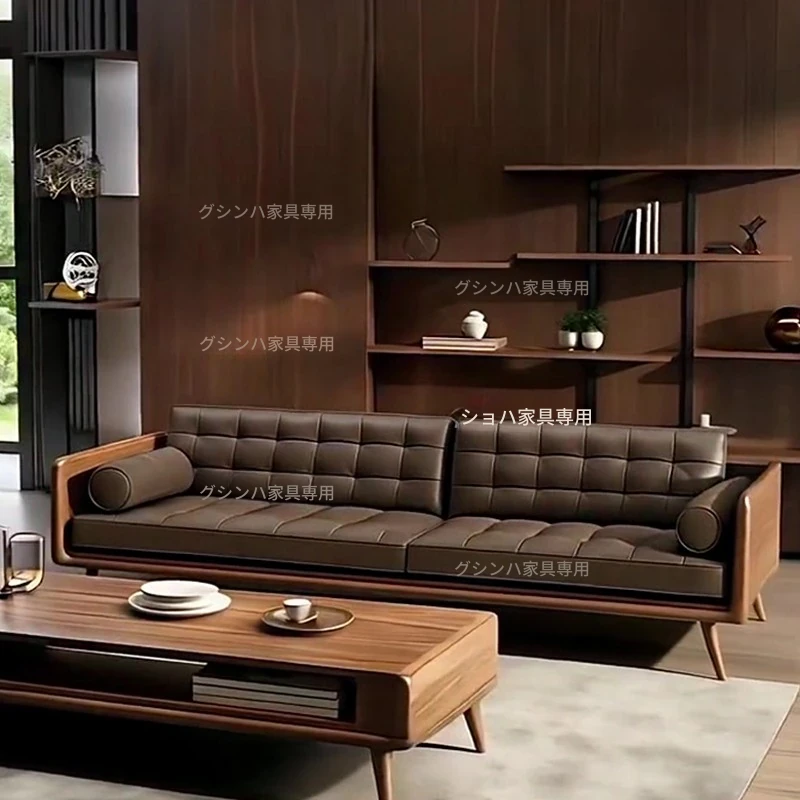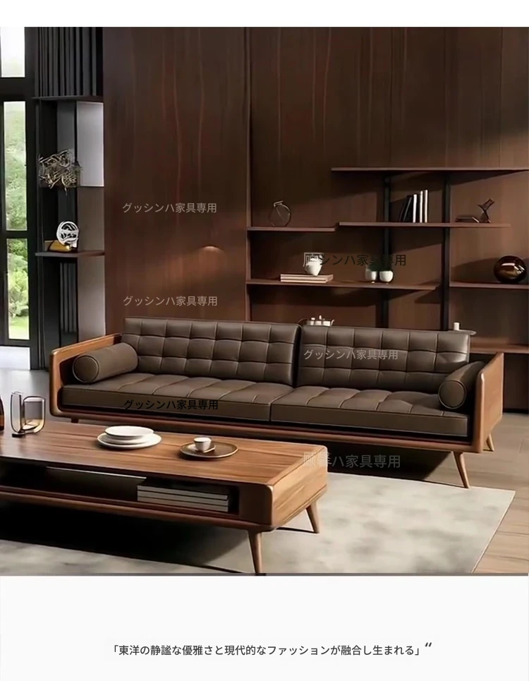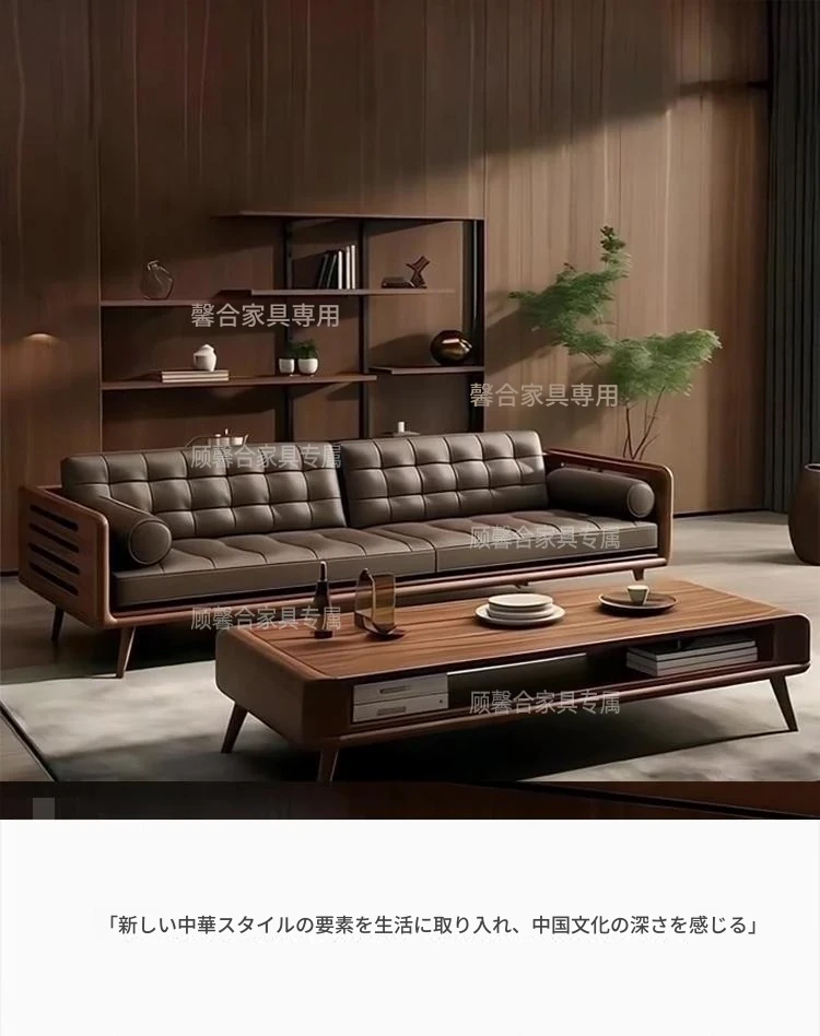 北米産ブラックウォールナット使用!宋氏美学デザインの直線タイプソファ。新中式の軽奢でシンプルな客リビング向け、真皮&天然木製の高品質ソファで、贅沢なくつろぎを実現!