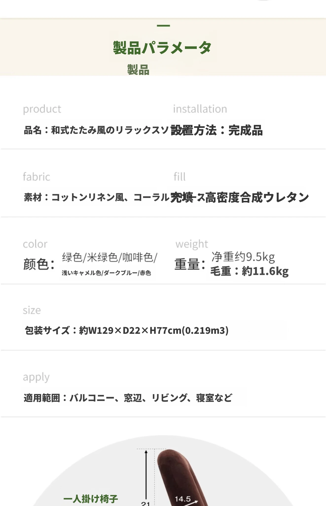 カーキ色シングルソファ(模倣コットンリネン)+マット