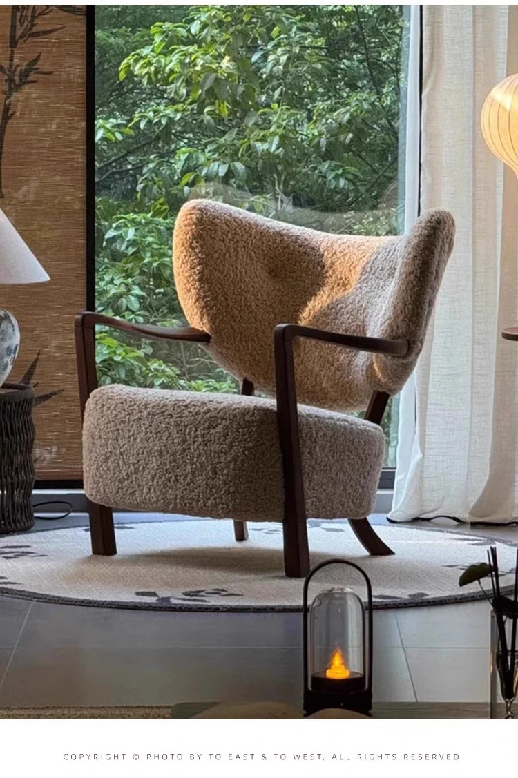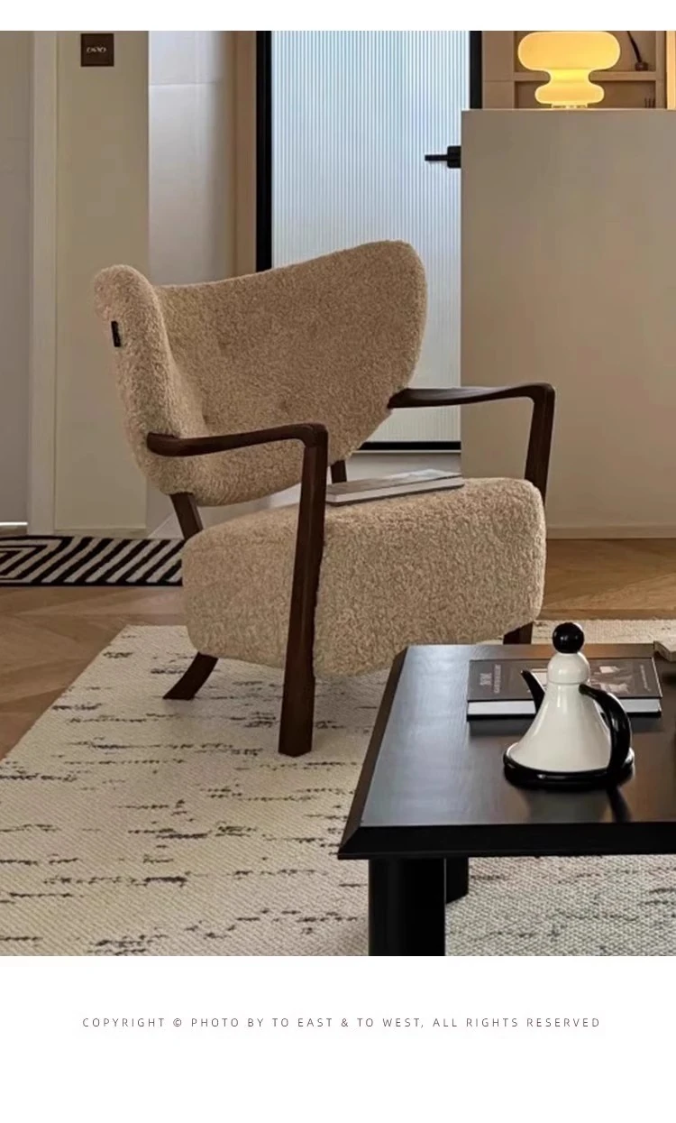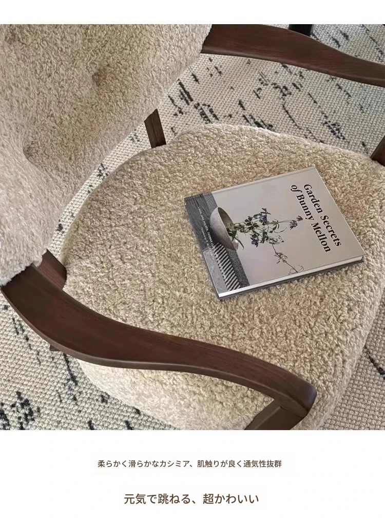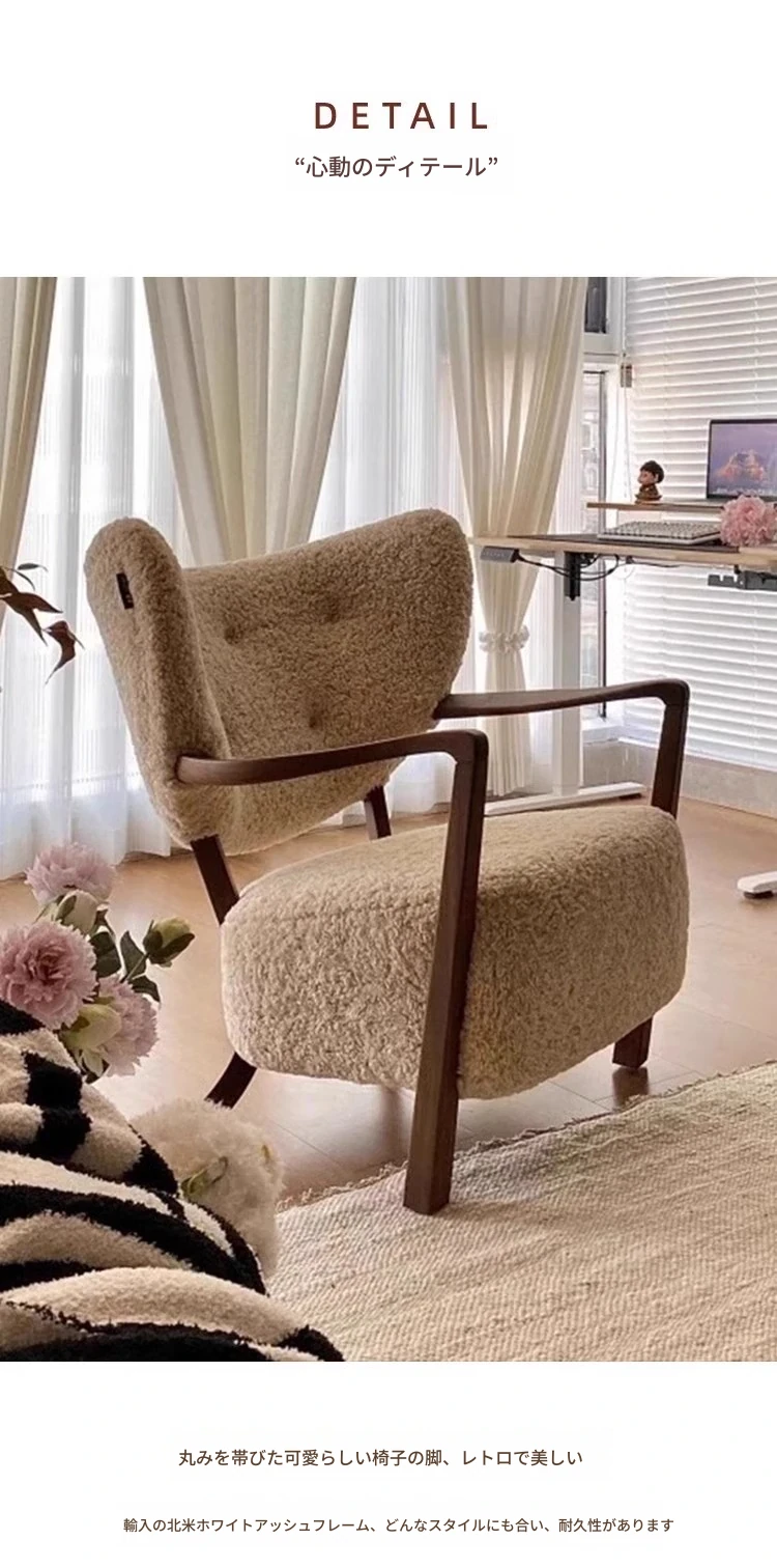 インフルエンサー必見!ウルフ・カジュアルチェア - ミルクティーブラウンのフレンチヴィンテージスタイル、無垢材使用の中古風ラムウール1人用ソファチェアで、あなたのお部屋をおしゃれに演出!