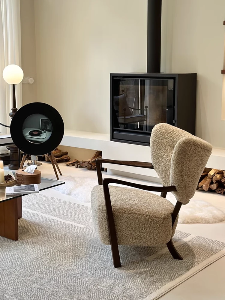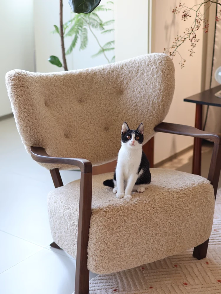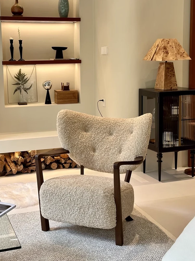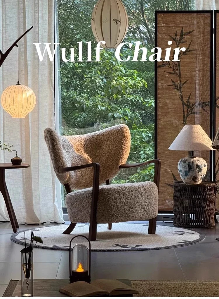 インフルエンサー必見!ウルフ・カジュアルチェア - ミルクティーブラウンのフレンチヴィンテージスタイル、無垢材使用の中古風ラムウール1人用ソファチェアで、あなたのお部屋をおしゃれに演出!