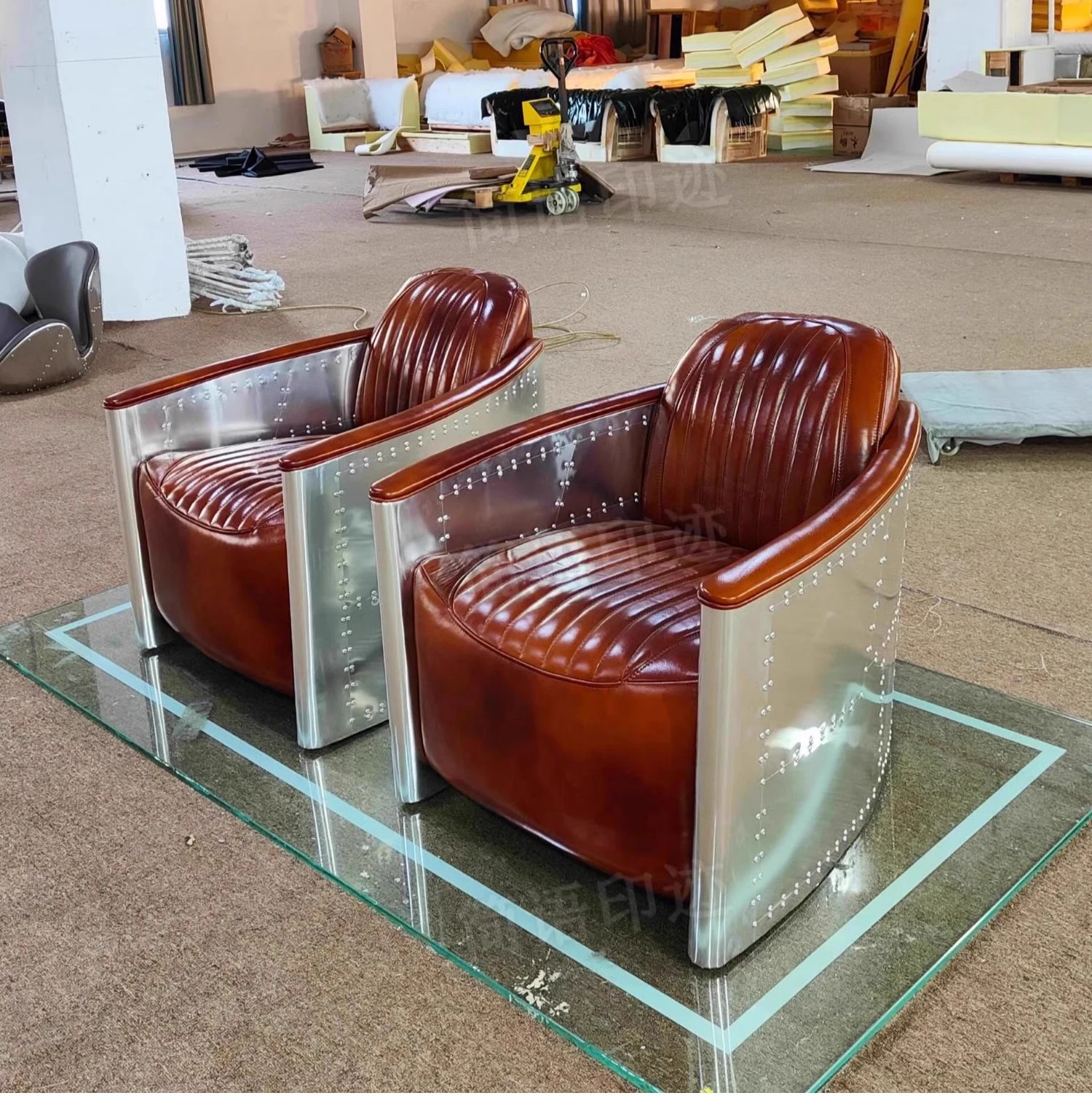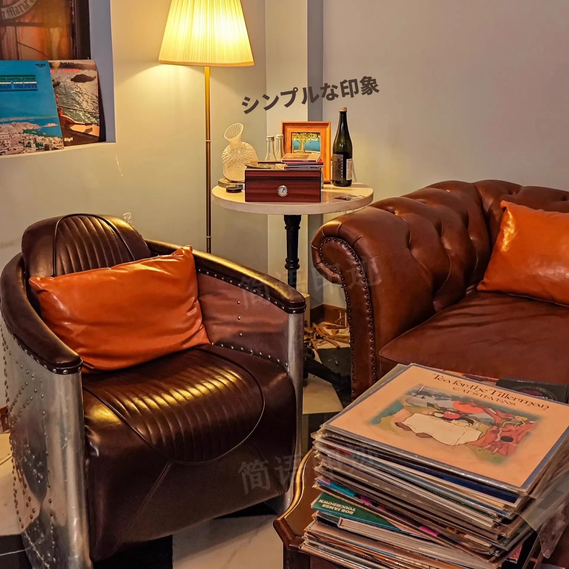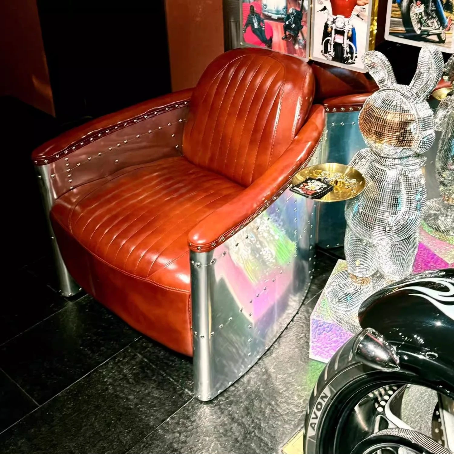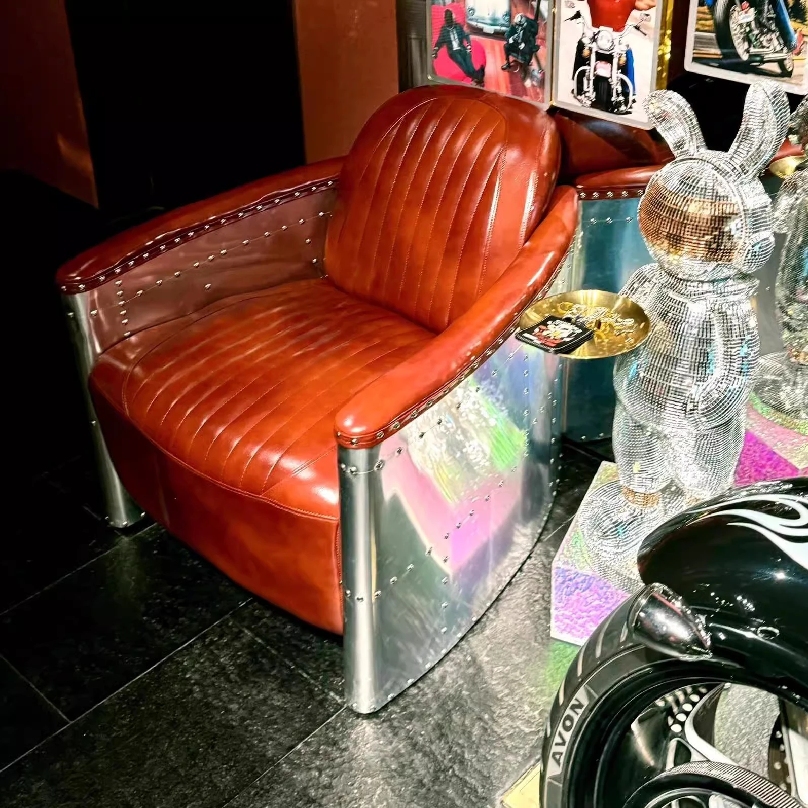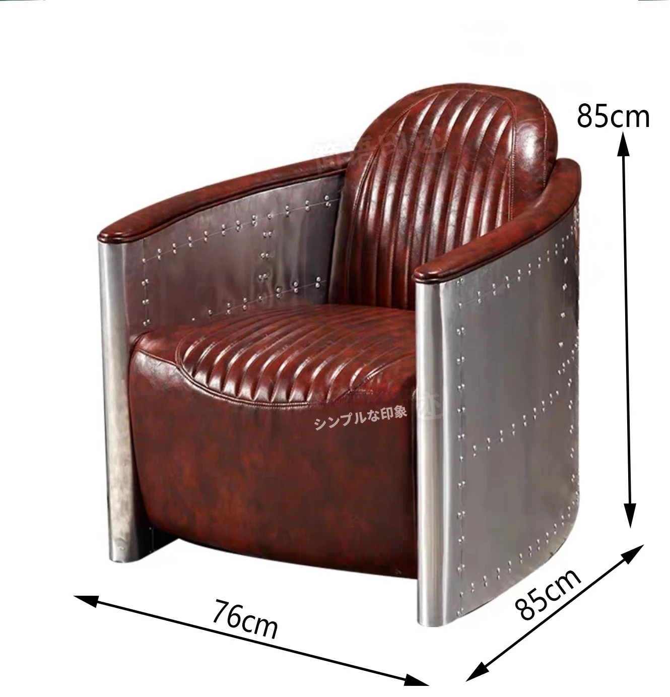 ヴィンテージ風アルミニウムレザーソファチェア、ウイスキーラウンジやシガーバーに最適!工業デザインのオイルワックスレザー製パーソナルソファ、リラックスできる一人用チェアです。あなたの特別な空間を演出します!