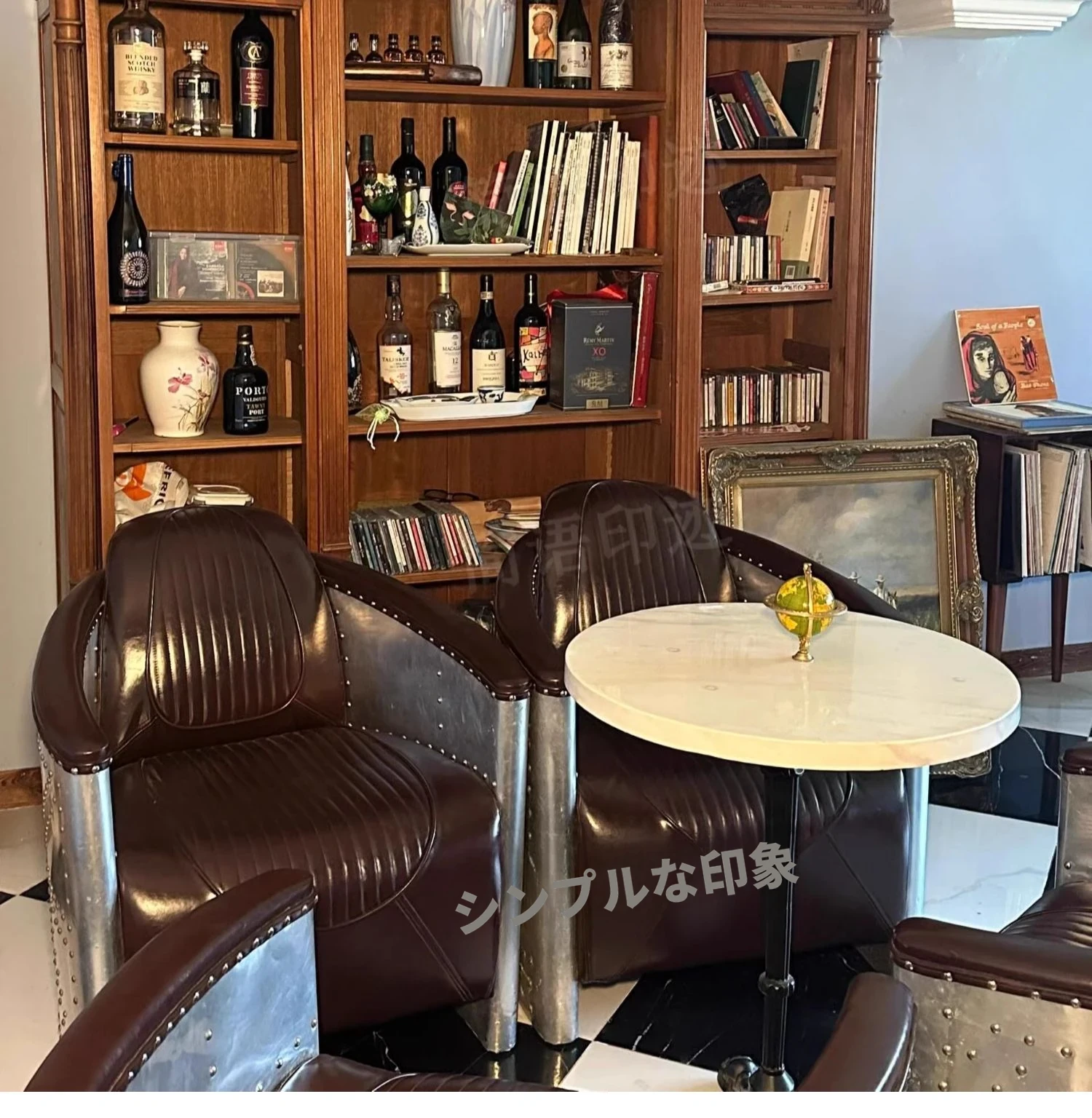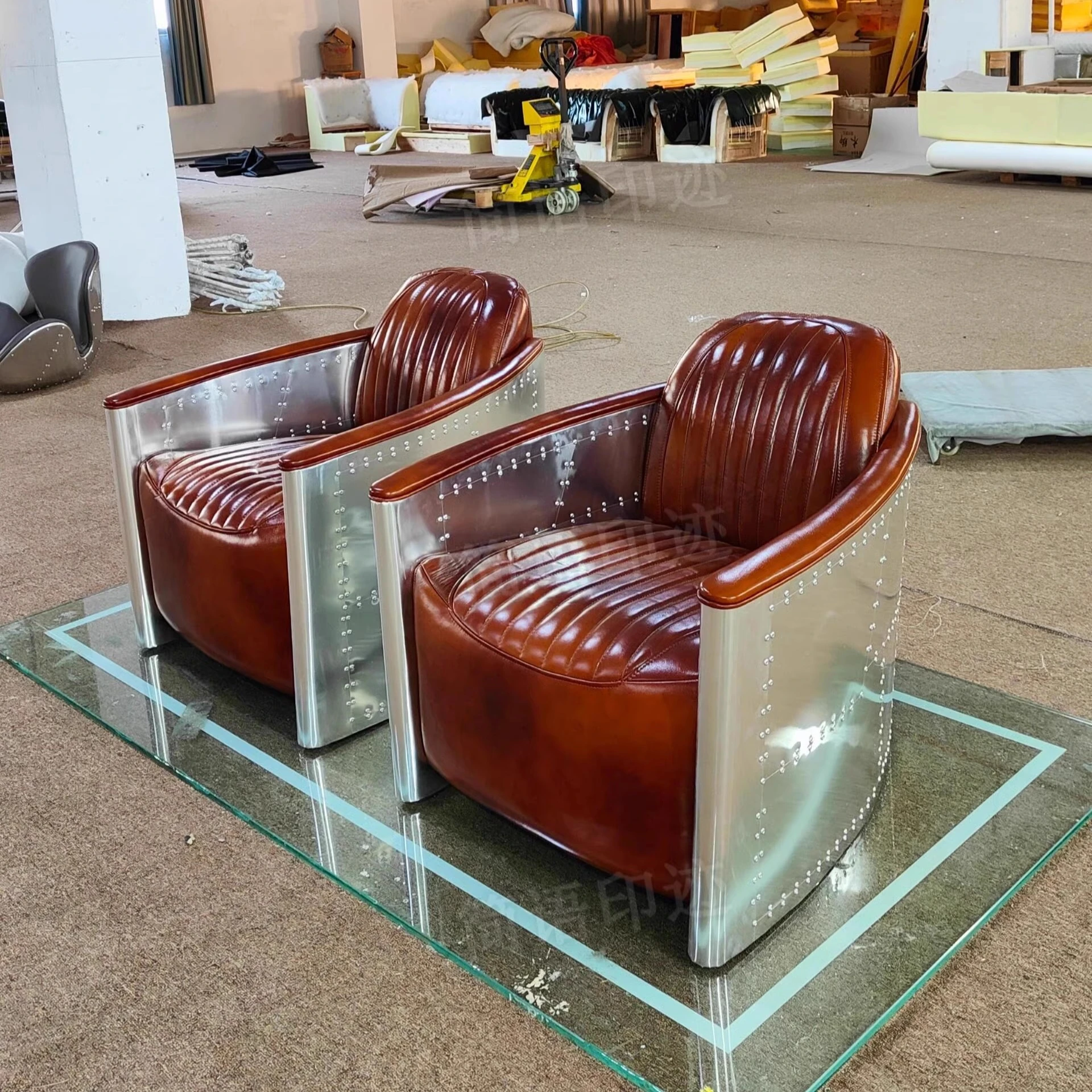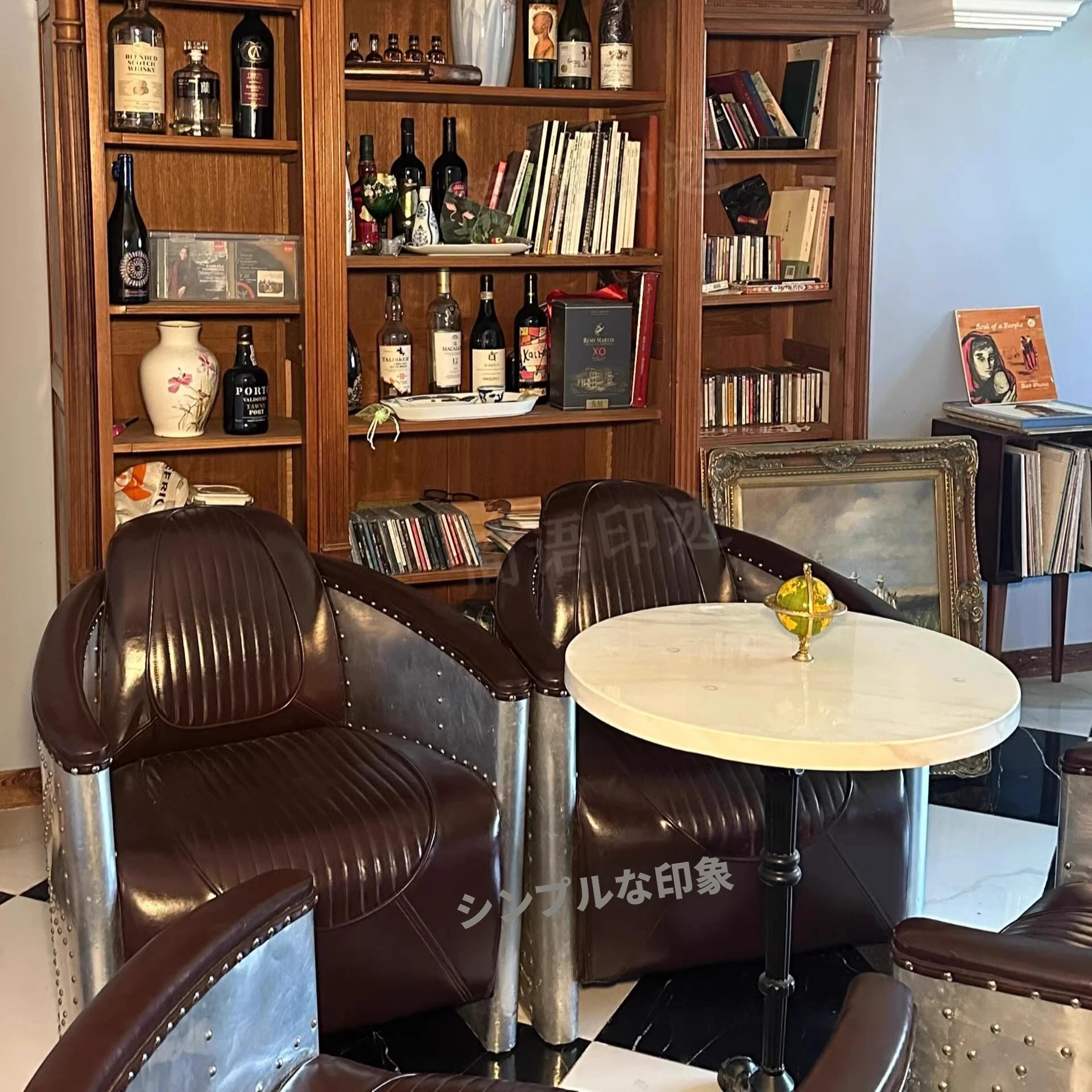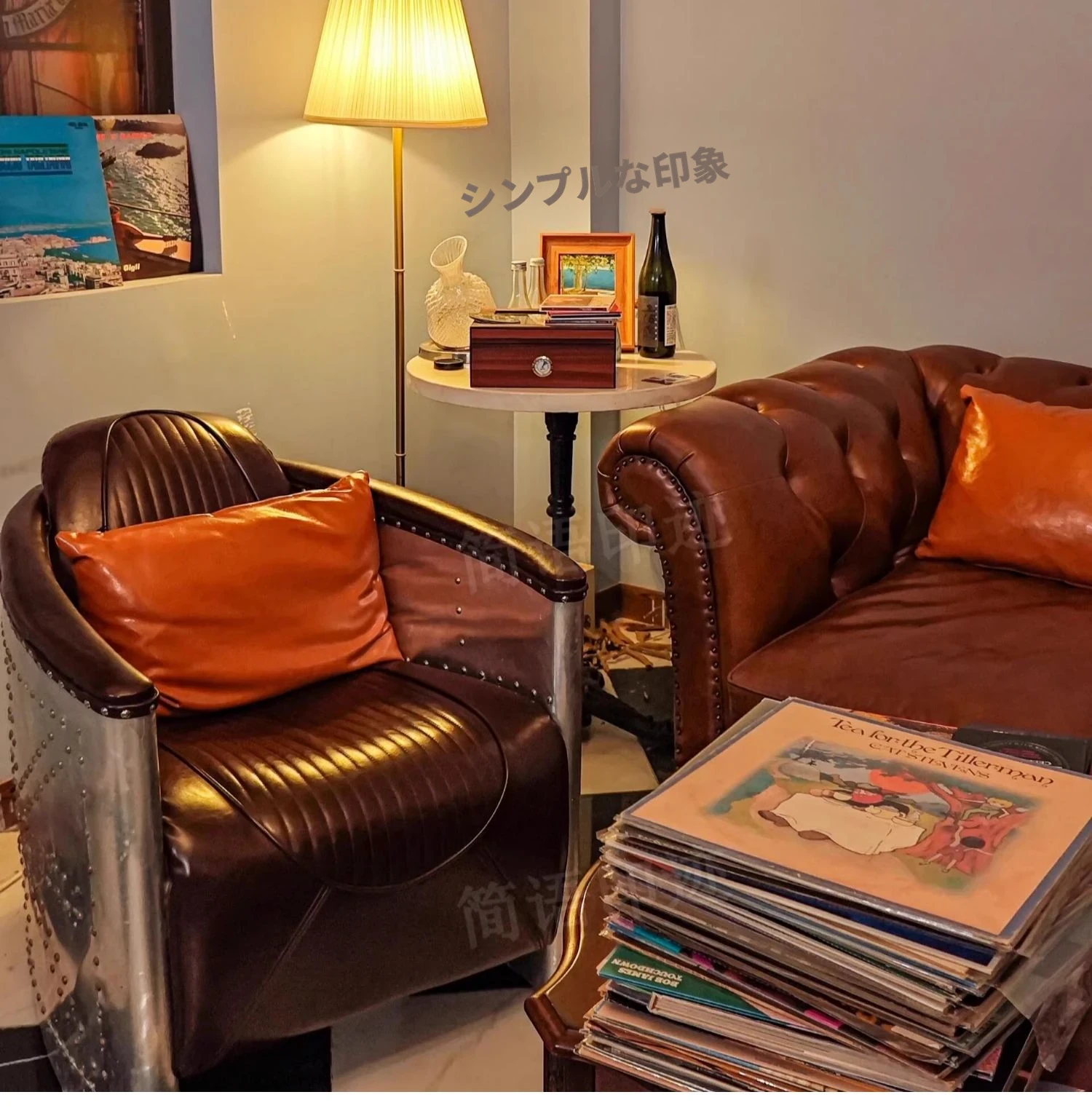 ヴィンテージ風アルミニウムレザーソファチェア、ウイスキーラウンジやシガーバーに最適!工業デザインのオイルワックスレザー製パーソナルソファ、リラックスできる一人用チェアです。あなたの特別な空間を演出します!