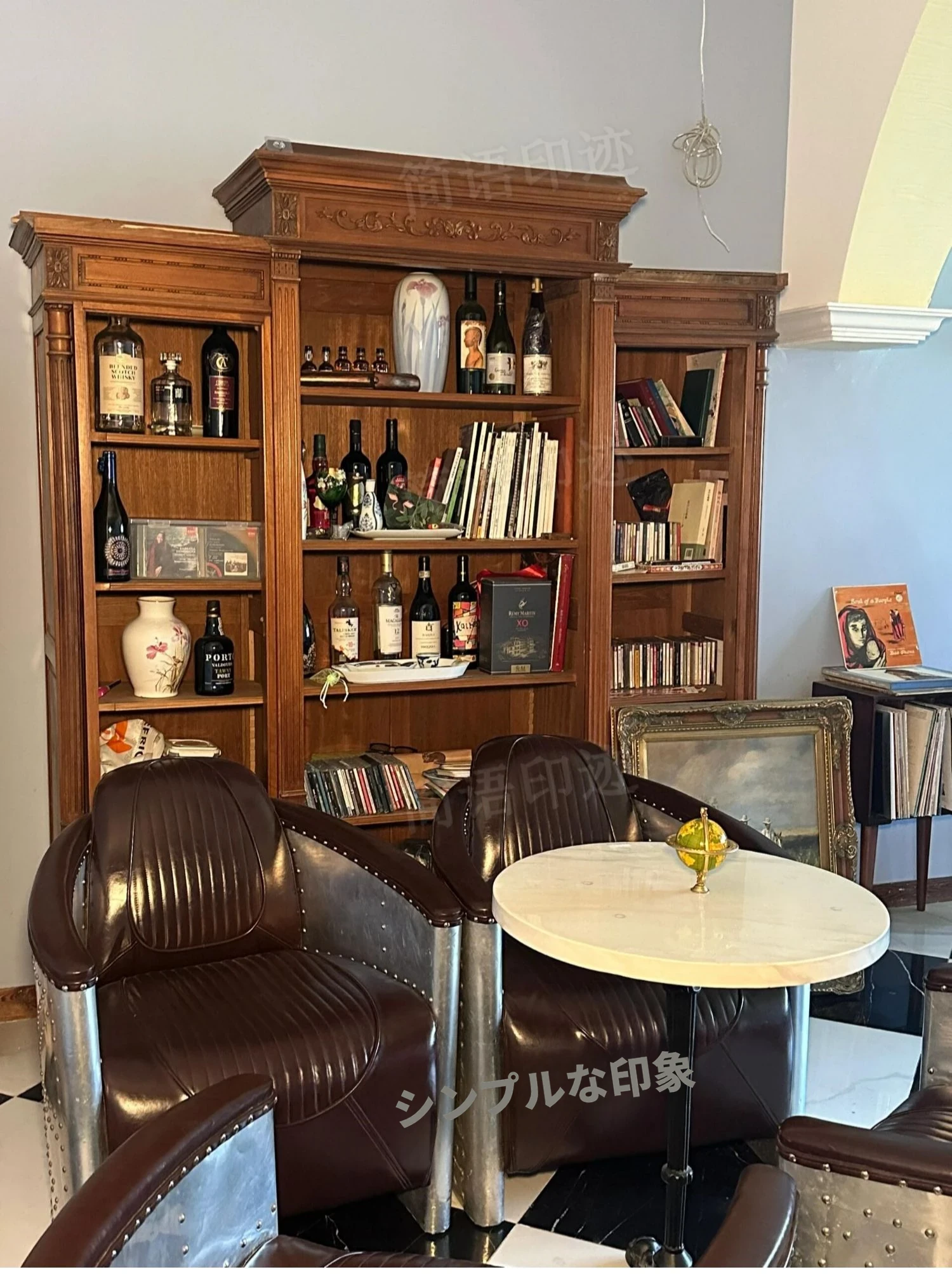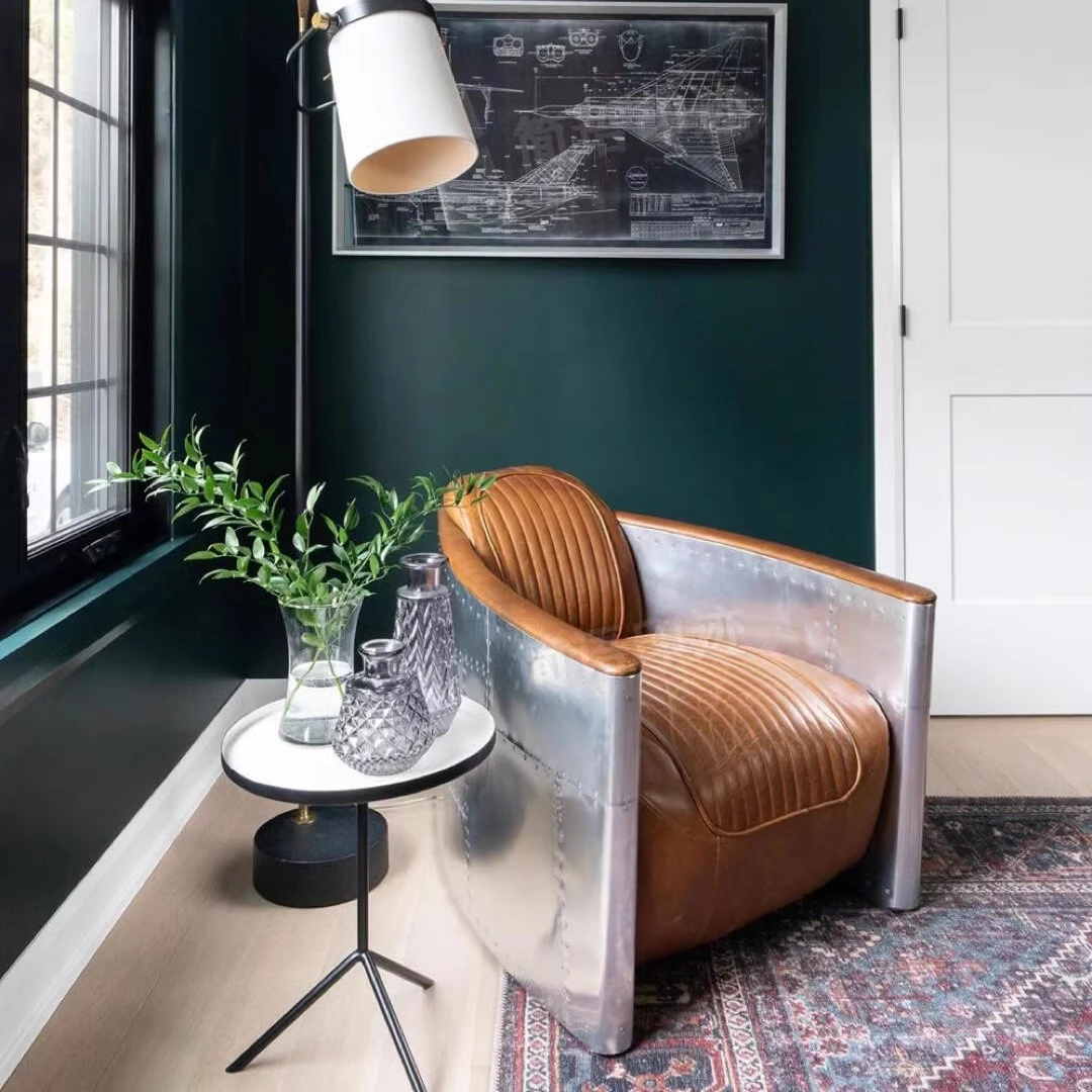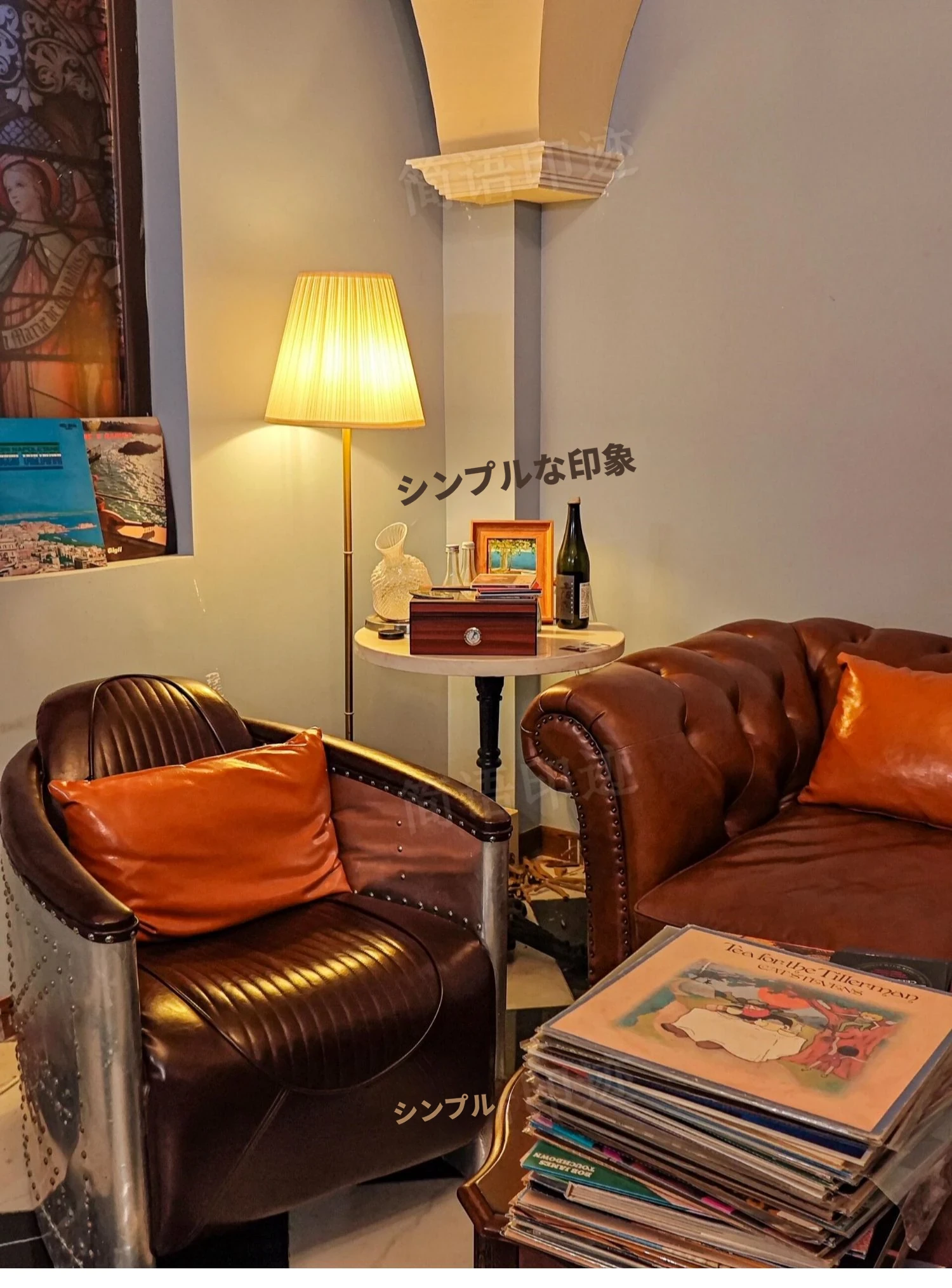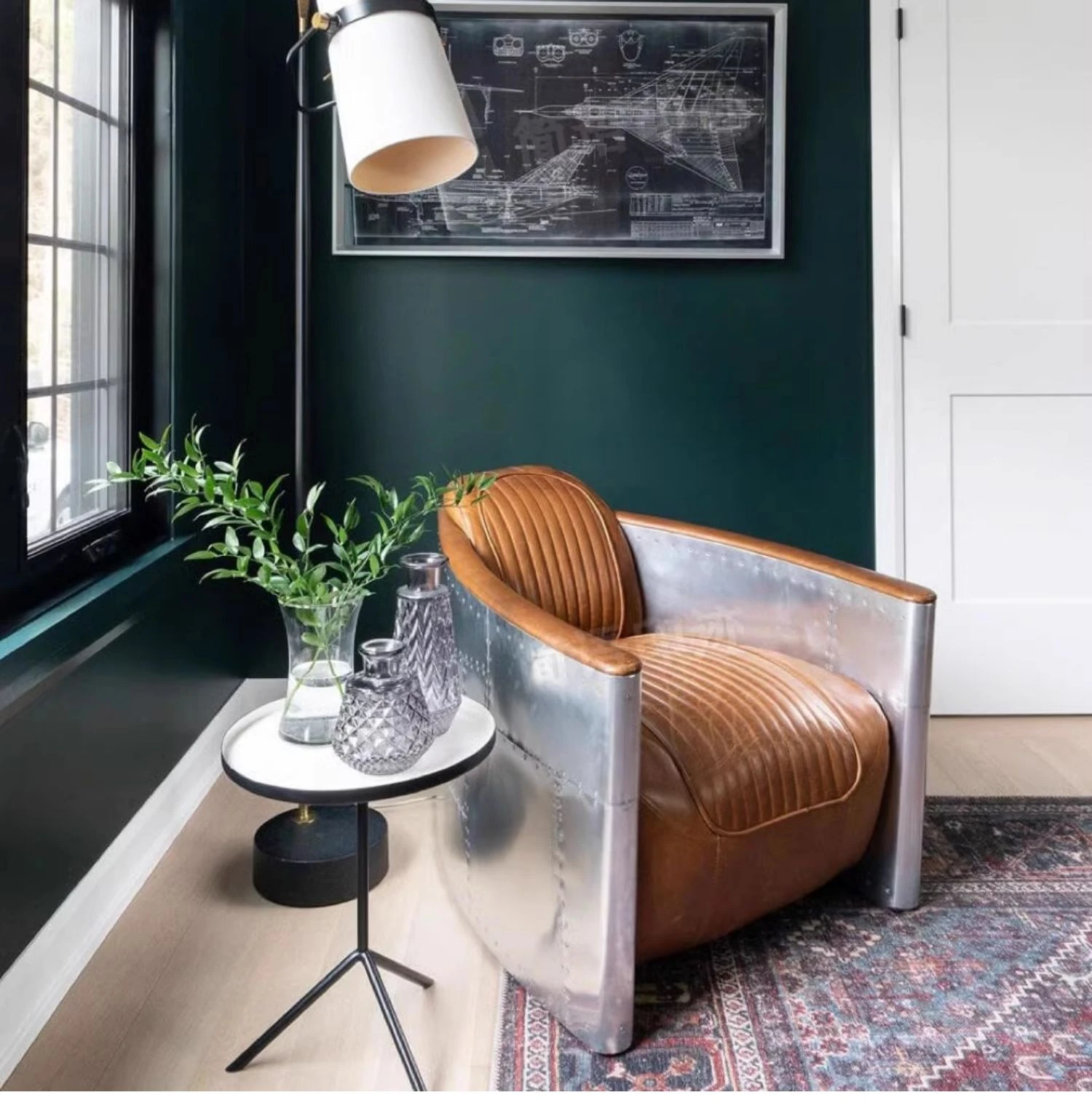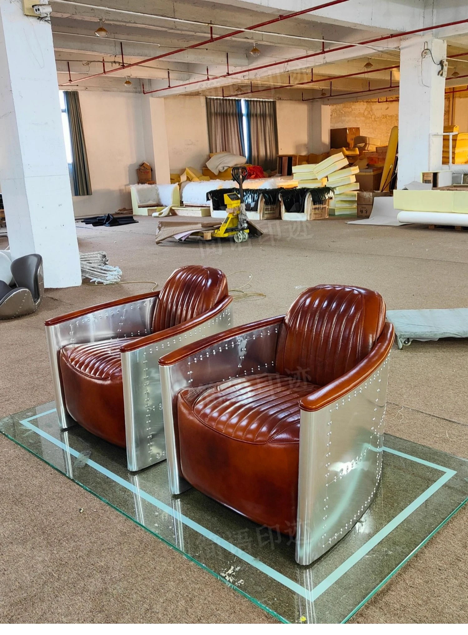 ヴィンテージ風アルミニウムレザーソファチェア、ウイスキーラウンジやシガーバーに最適!工業デザインのオイルワックスレザー製パーソナルソファ、リラックスできる一人用チェアです。あなたの特別な空間を演出します!