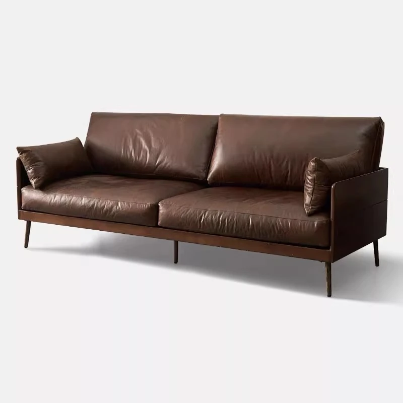 Vintage Caramel Leather Sofa - French Retro Design, Genuine Leather, 3-Seater for Small Living Rooms, Stylish and Durable for Cozy Spaces