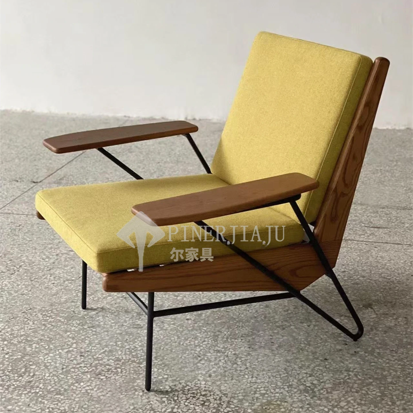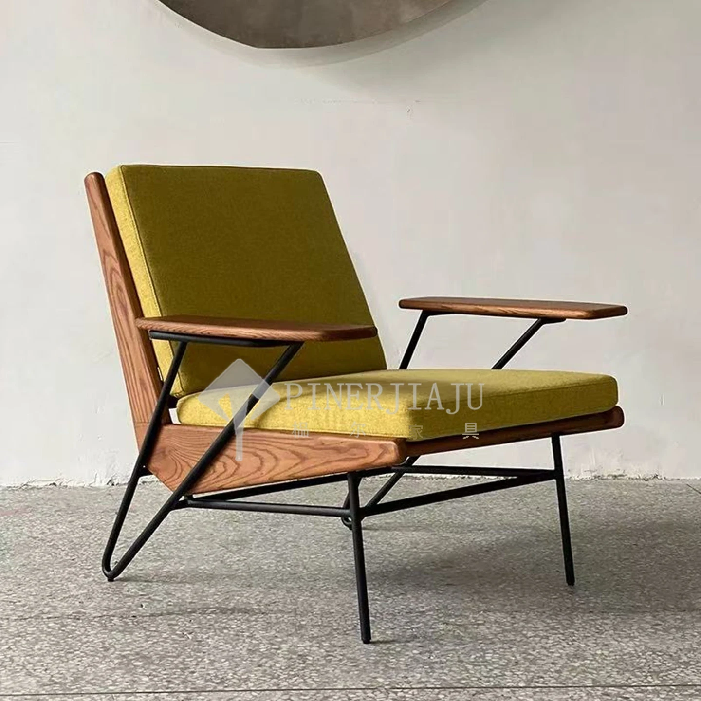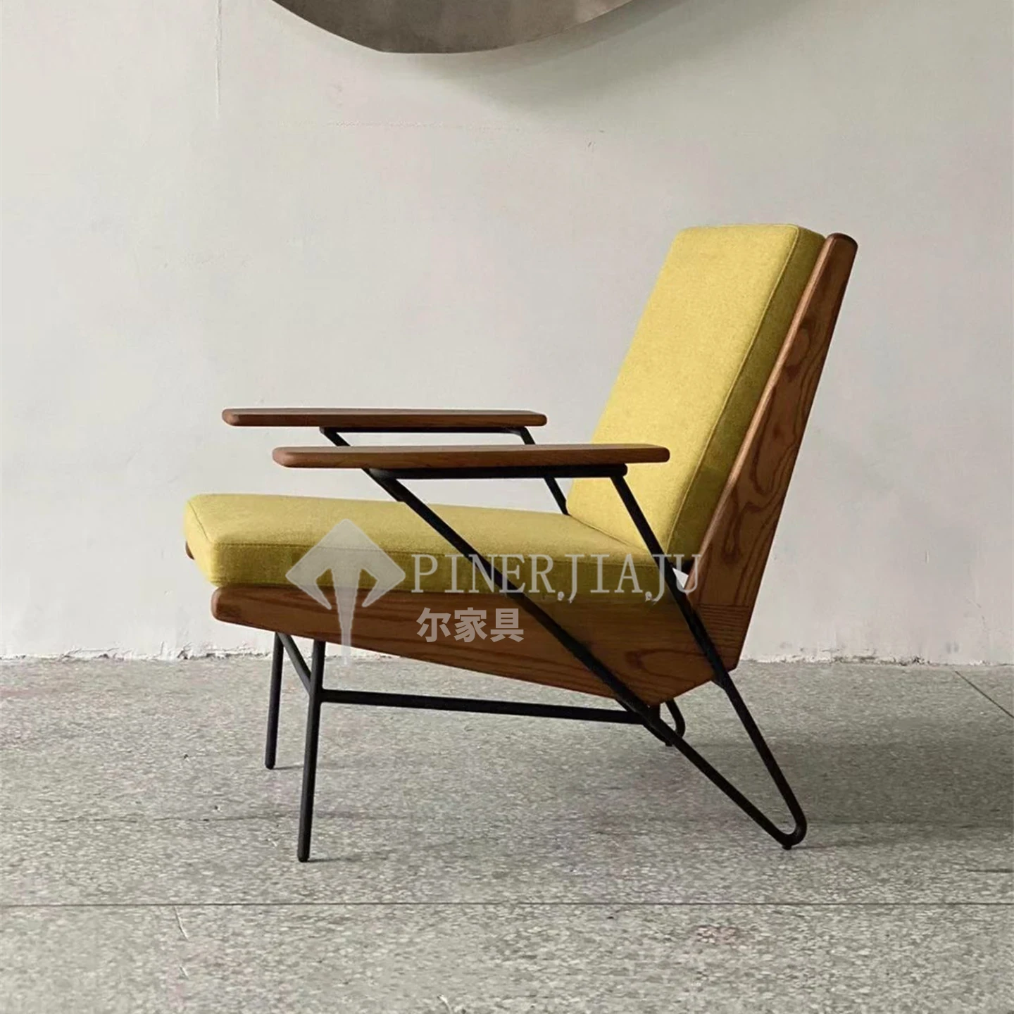 中古風デザインの金属と無垢材のアームチェア - 高級ホテルやクラブに最適!サンプルルームにもぴったりなスタイリッシュなソファチェア。商談にも使える洗練されたデザインで、あなたの空間を引き立てます。
