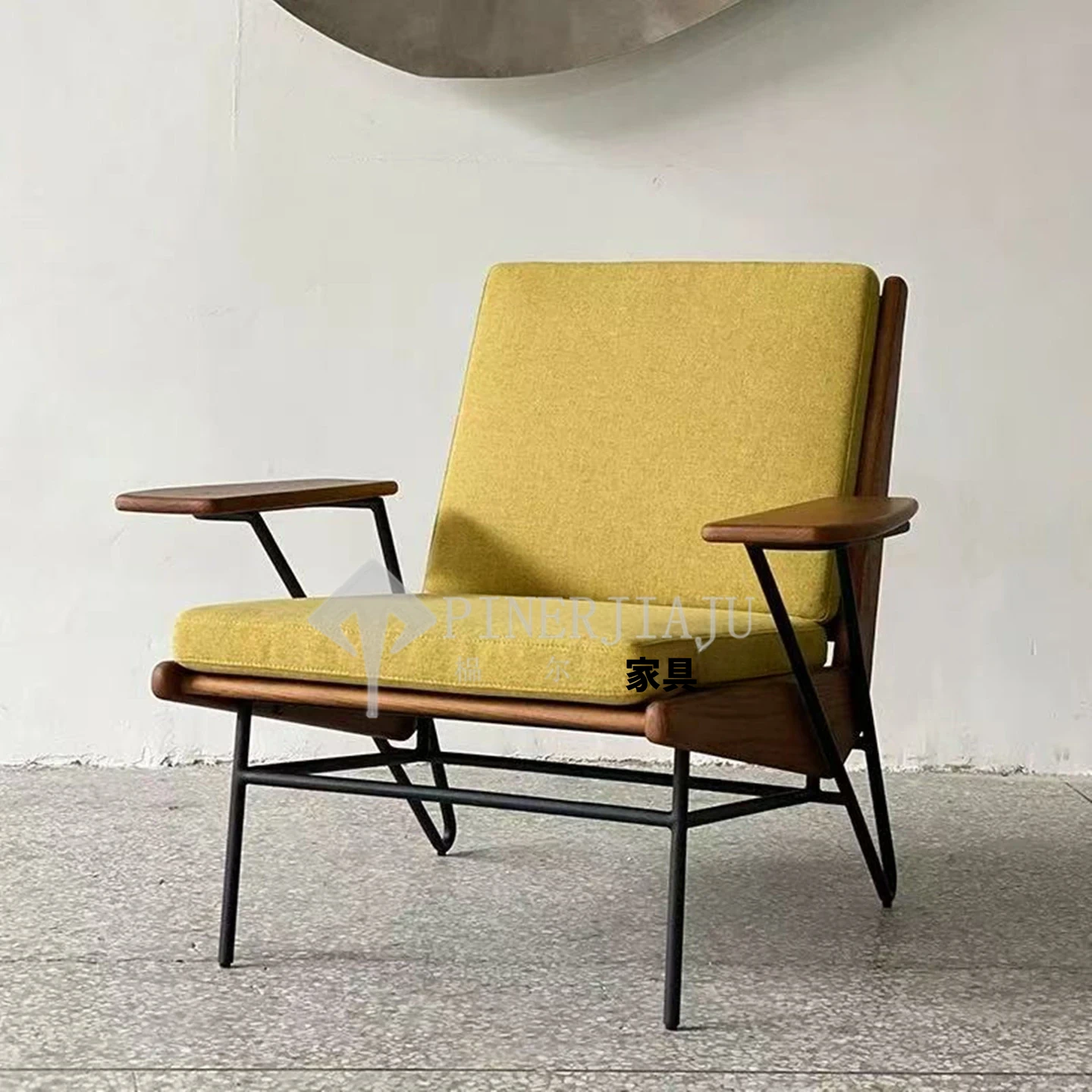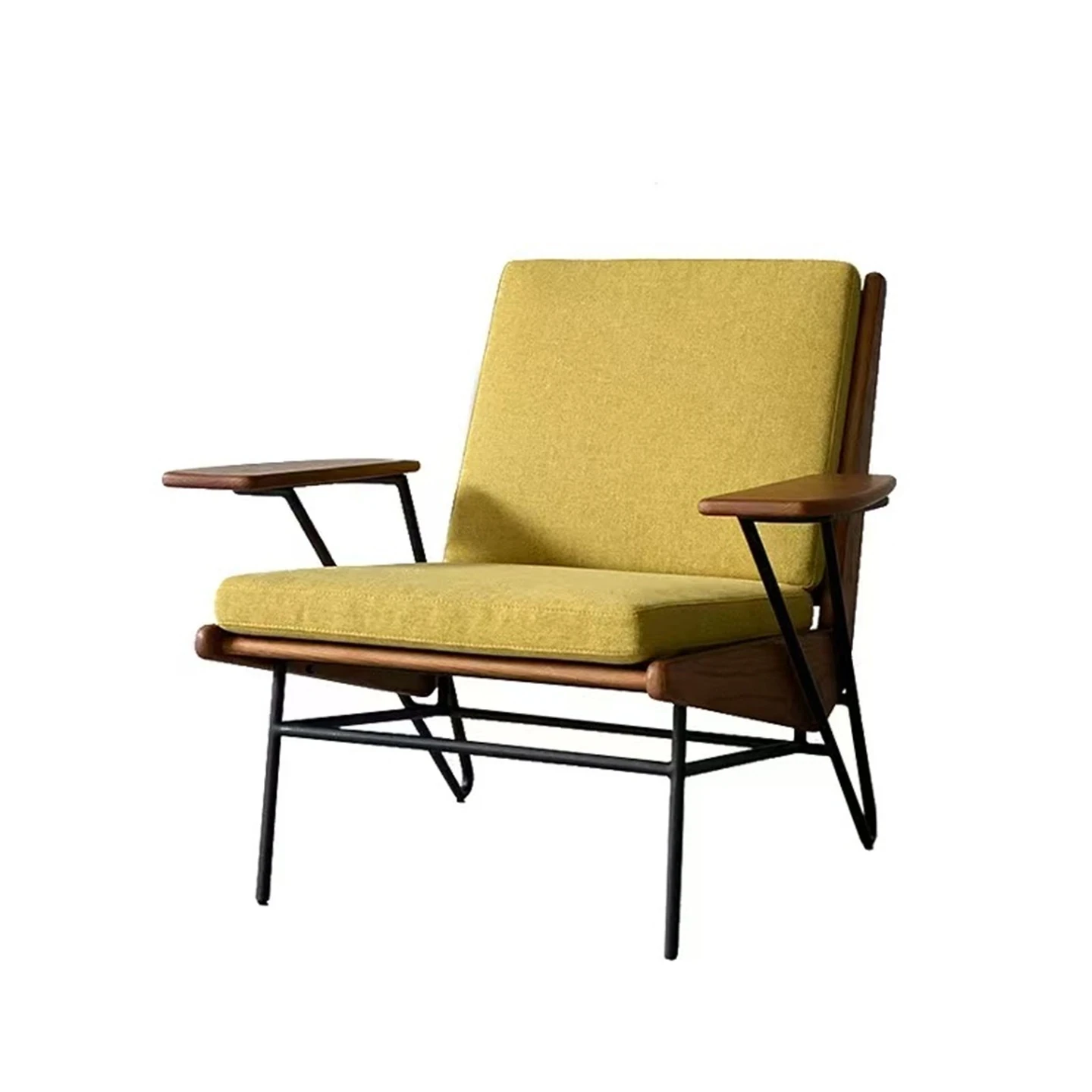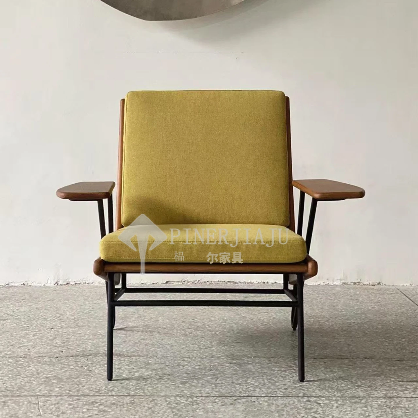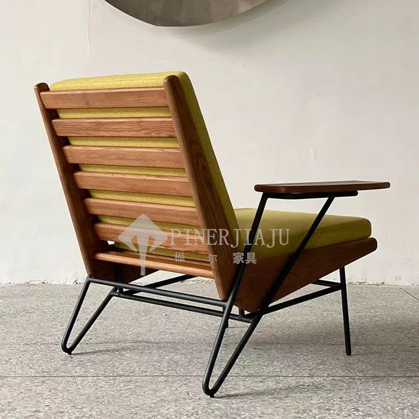 中古風デザインの金属と無垢材のアームチェア - 高級ホテルやクラブに最適!サンプルルームにもぴったりなスタイリッシュなソファチェア。商談にも使える洗練されたデザインで、あなたの空間を引き立てます。