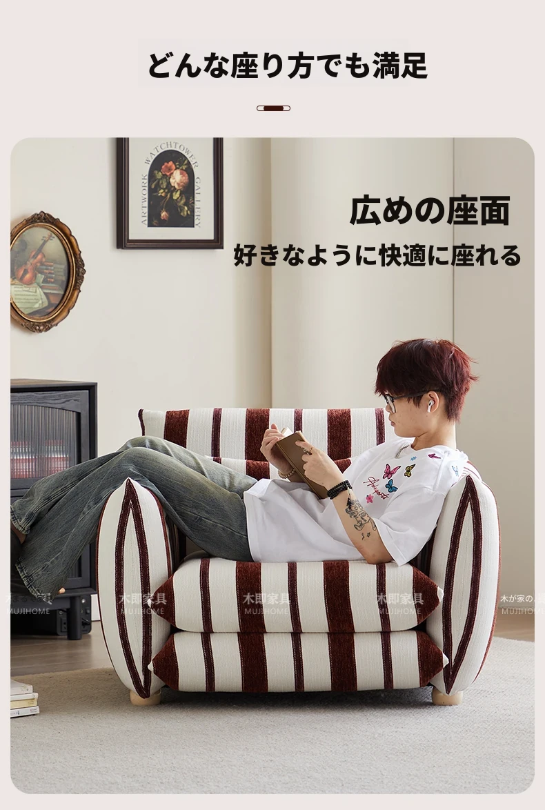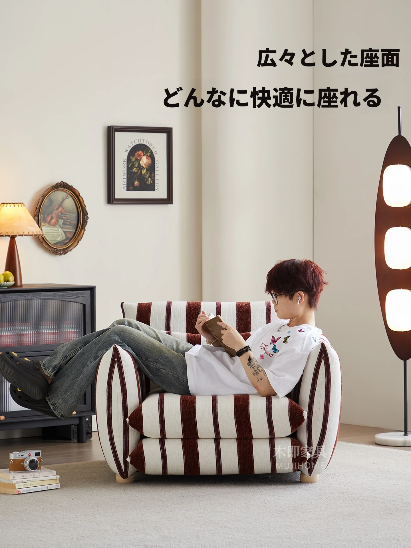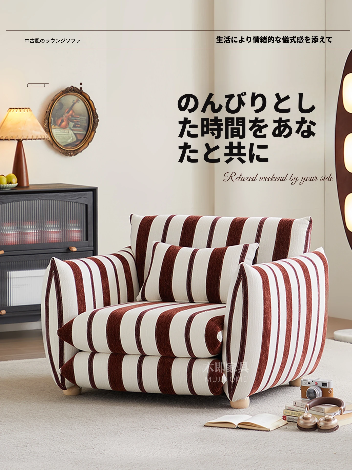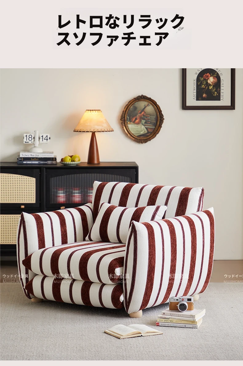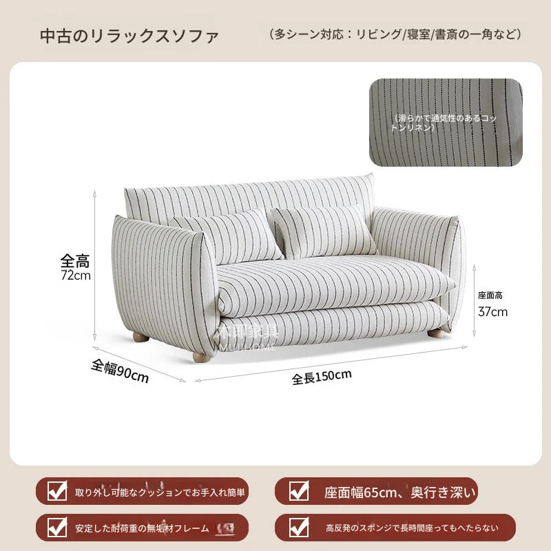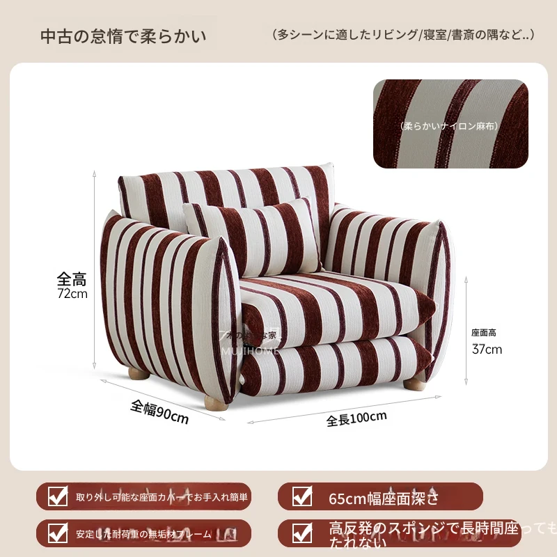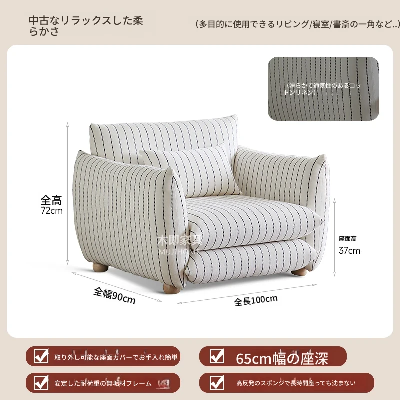 レトロな雰囲気の木製一人掛けリラックスチェア|デザイナーズスタイルの中古品|心地よいコットンリネン素材|おしゃれなリビングにぴったりのくつろぎソファチェア