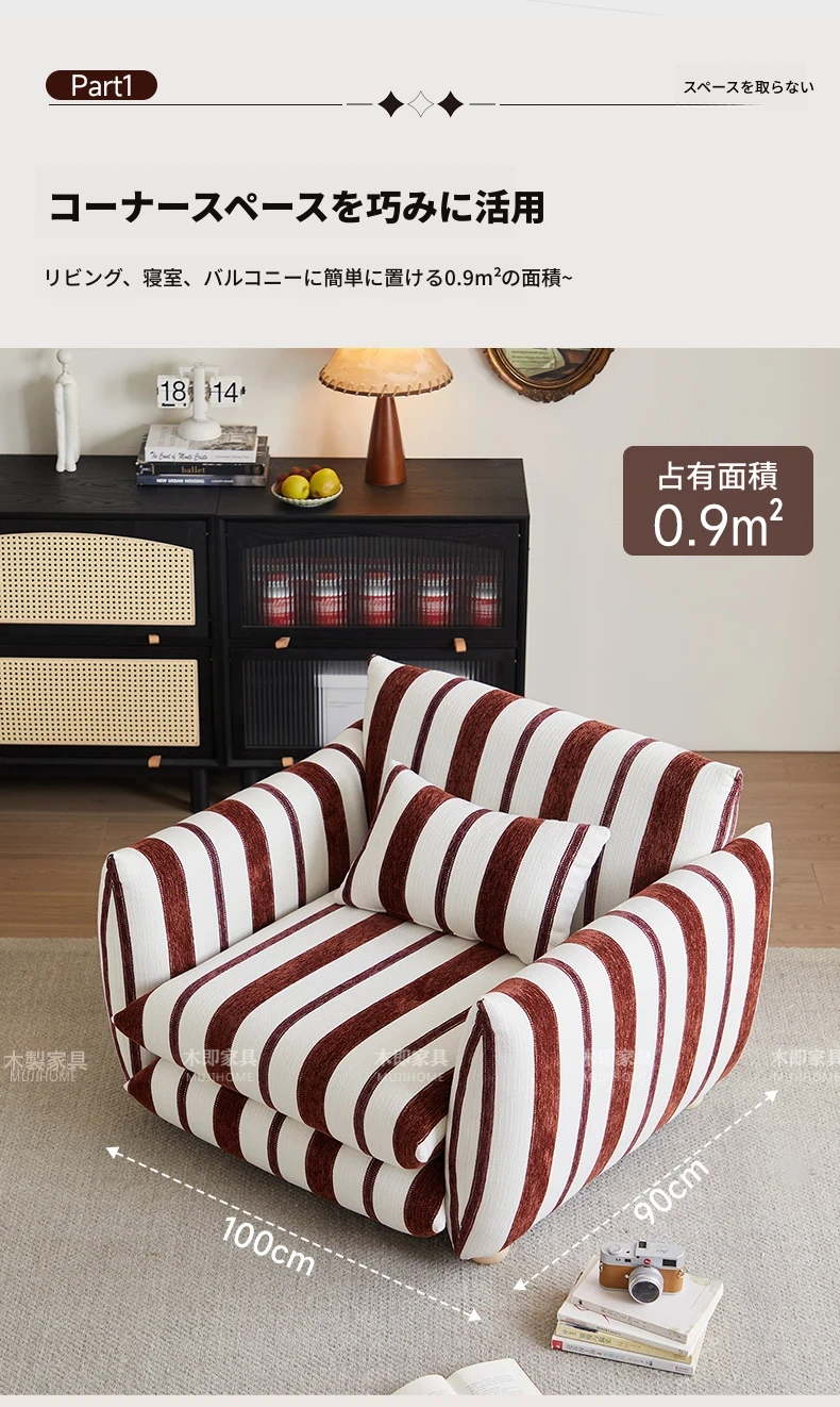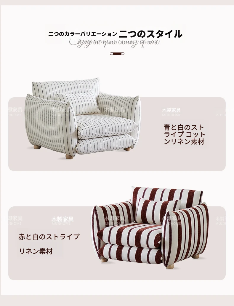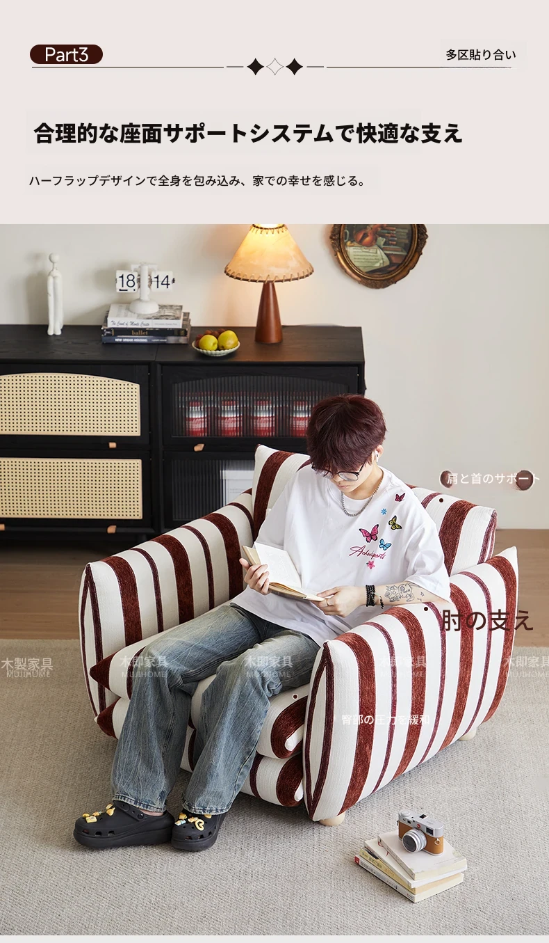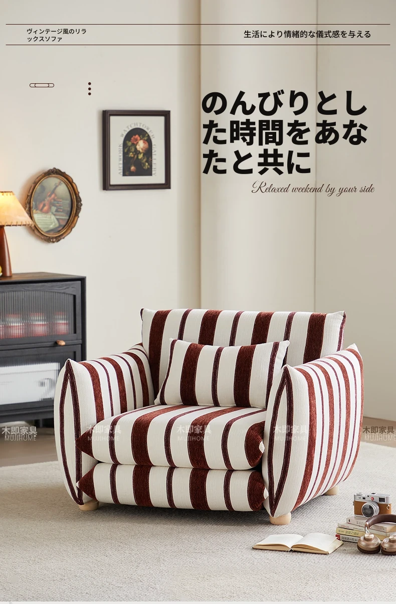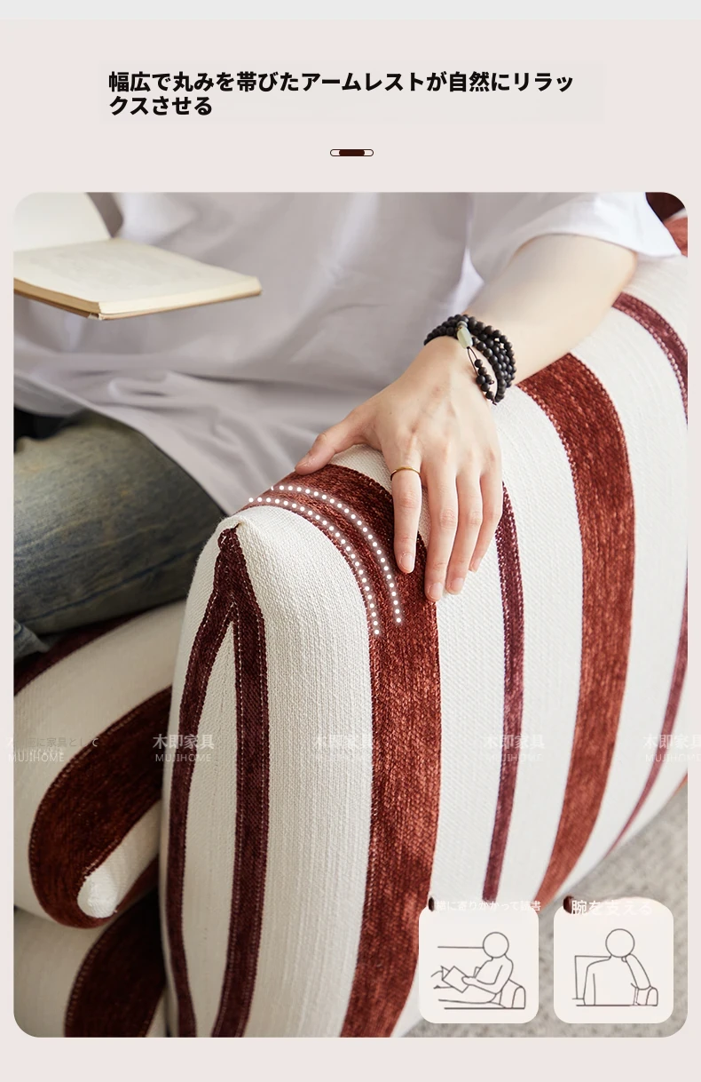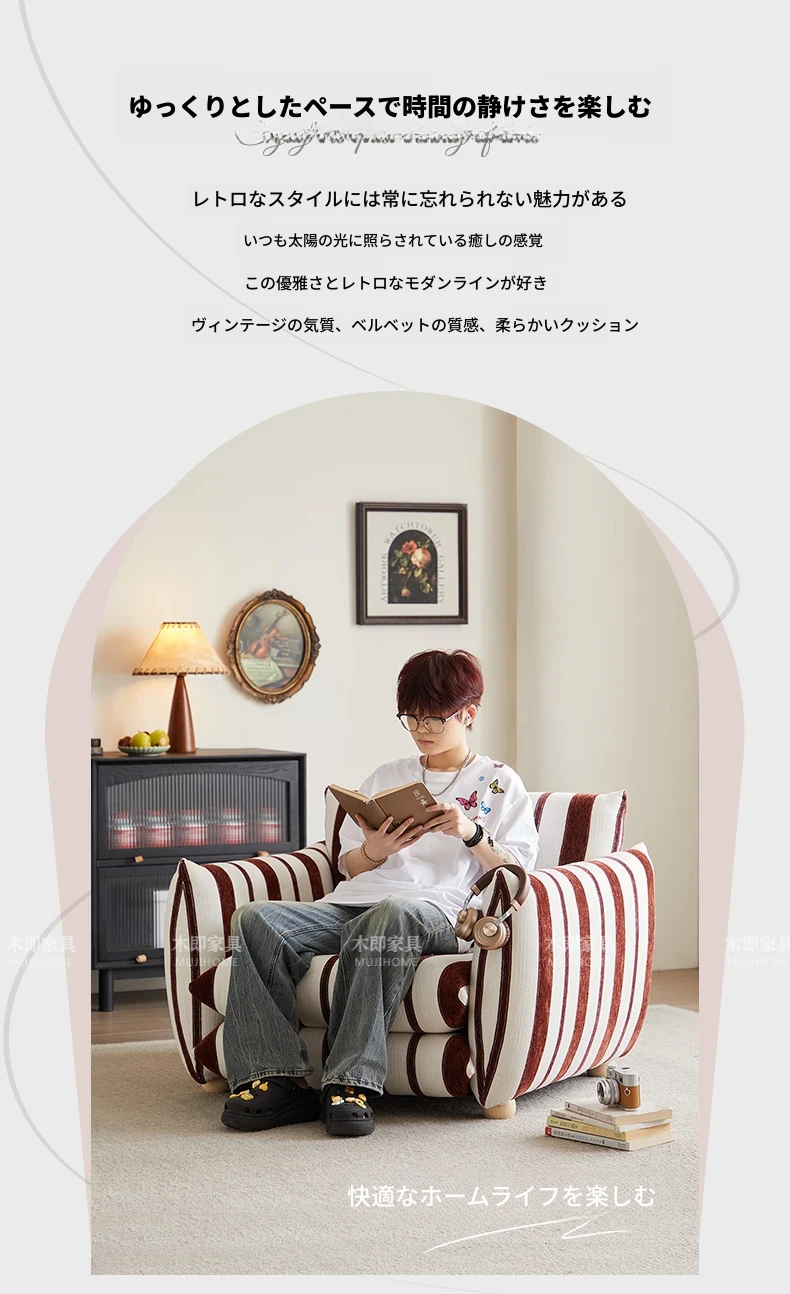 レトロな雰囲気の木製一人掛けリラックスチェア|デザイナーズスタイルの中古品|心地よいコットンリネン素材|おしゃれなリビングにぴったりのくつろぎソファチェア