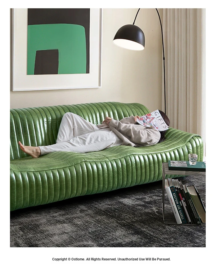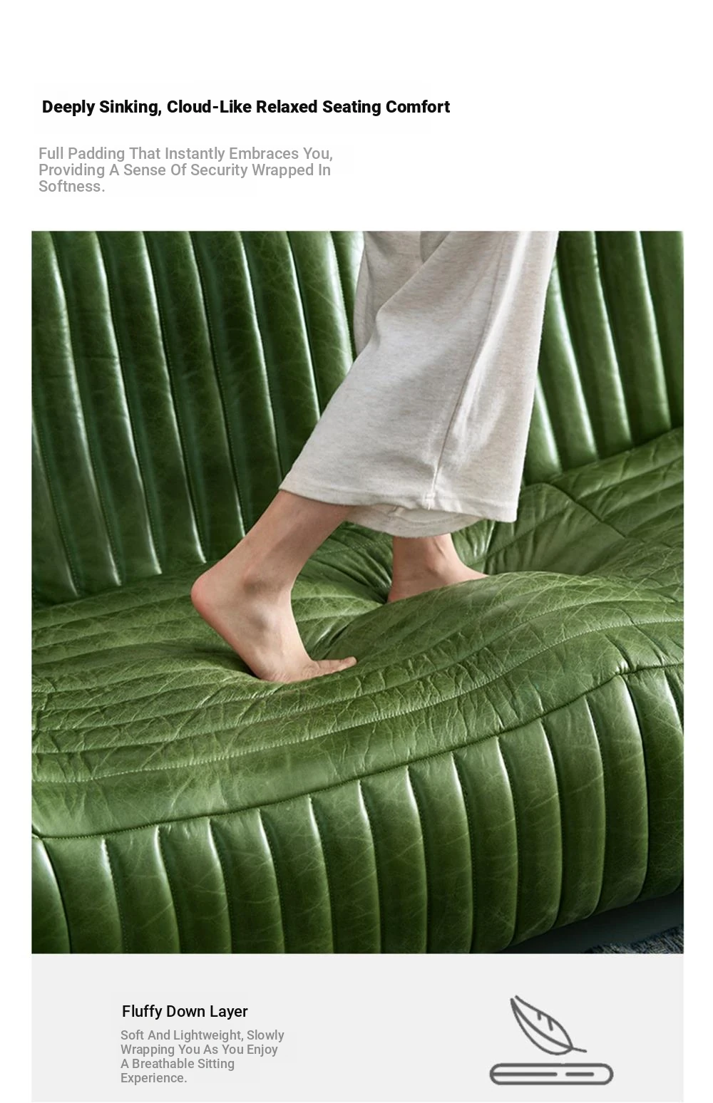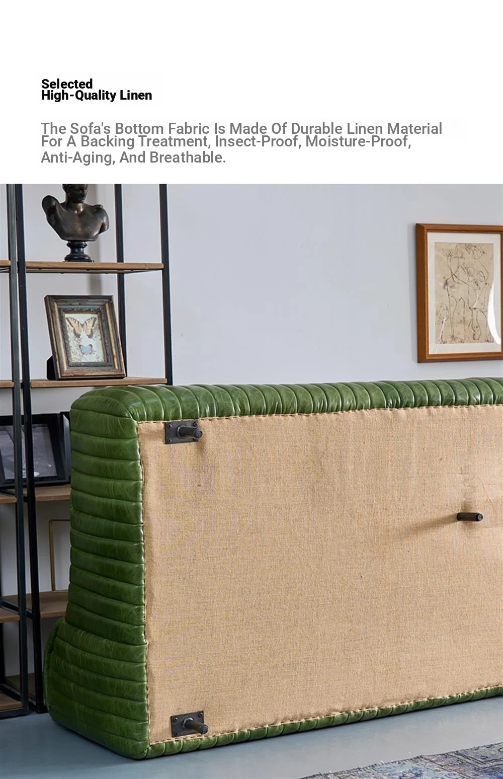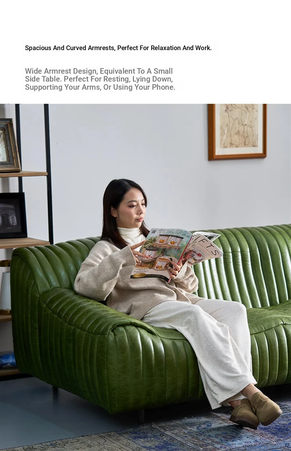 Vintage Wave Sofa - Retro Waxed Full-Grain Leather, Green, Perfect for Small Living Rooms, Designer-Approved Retro Style