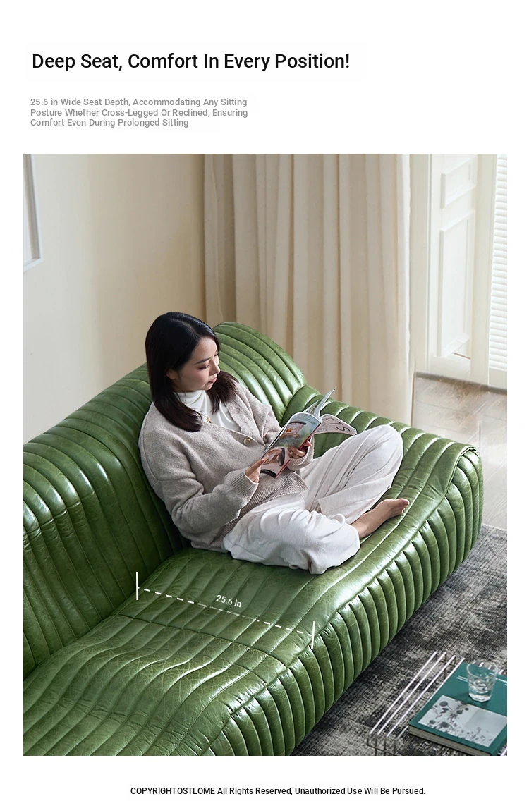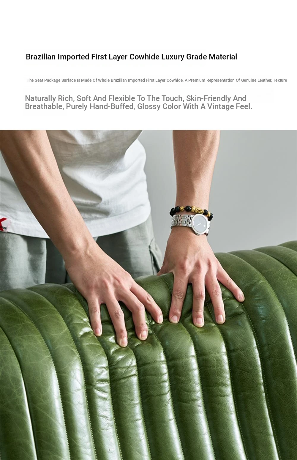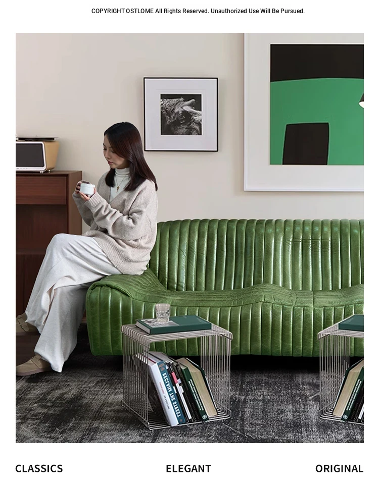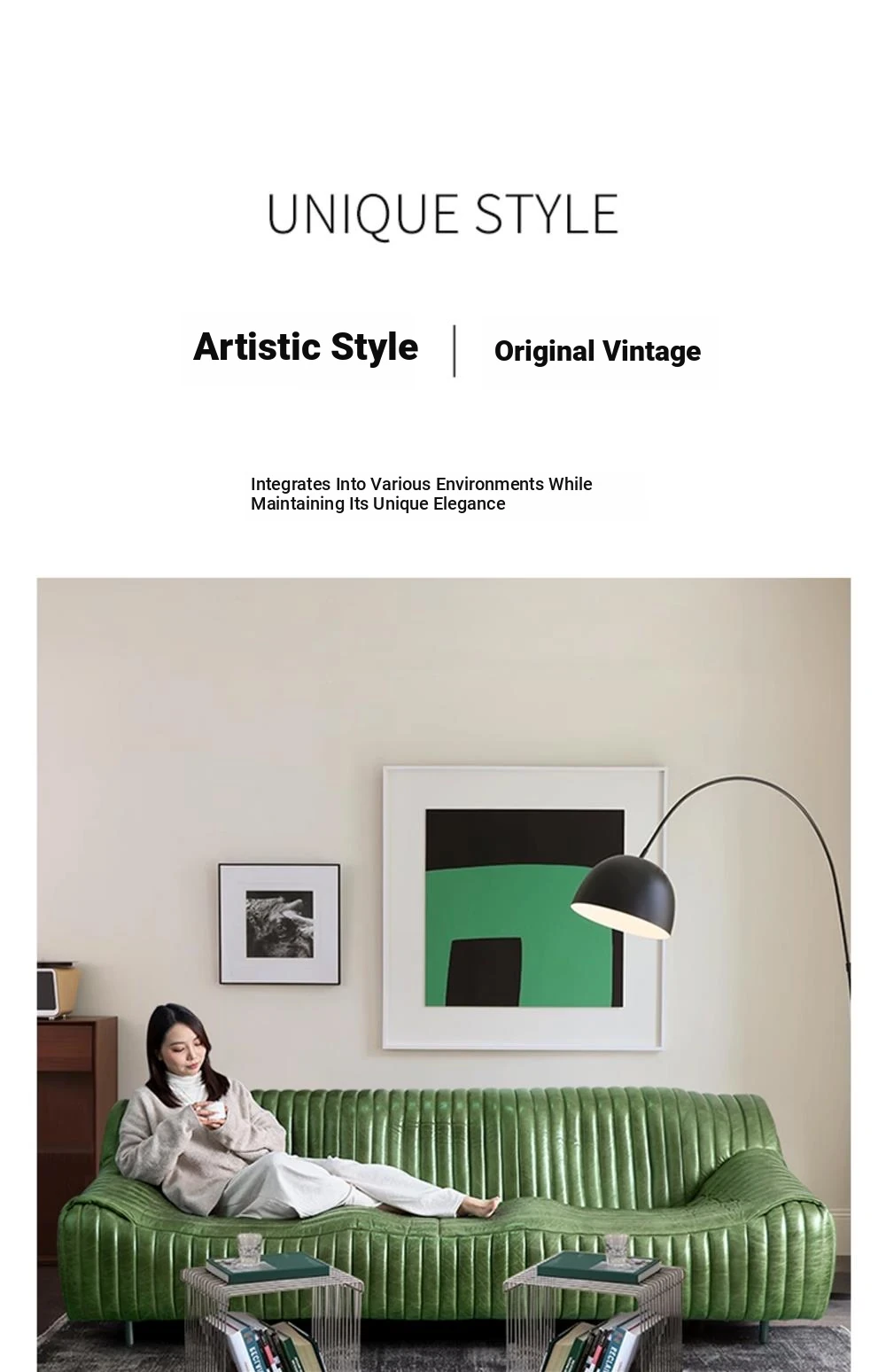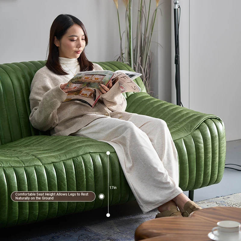 Vintage Wave Sofa - Retro Waxed Full-Grain Leather, Green, Perfect for Small Living Rooms, Designer-Approved Retro Style